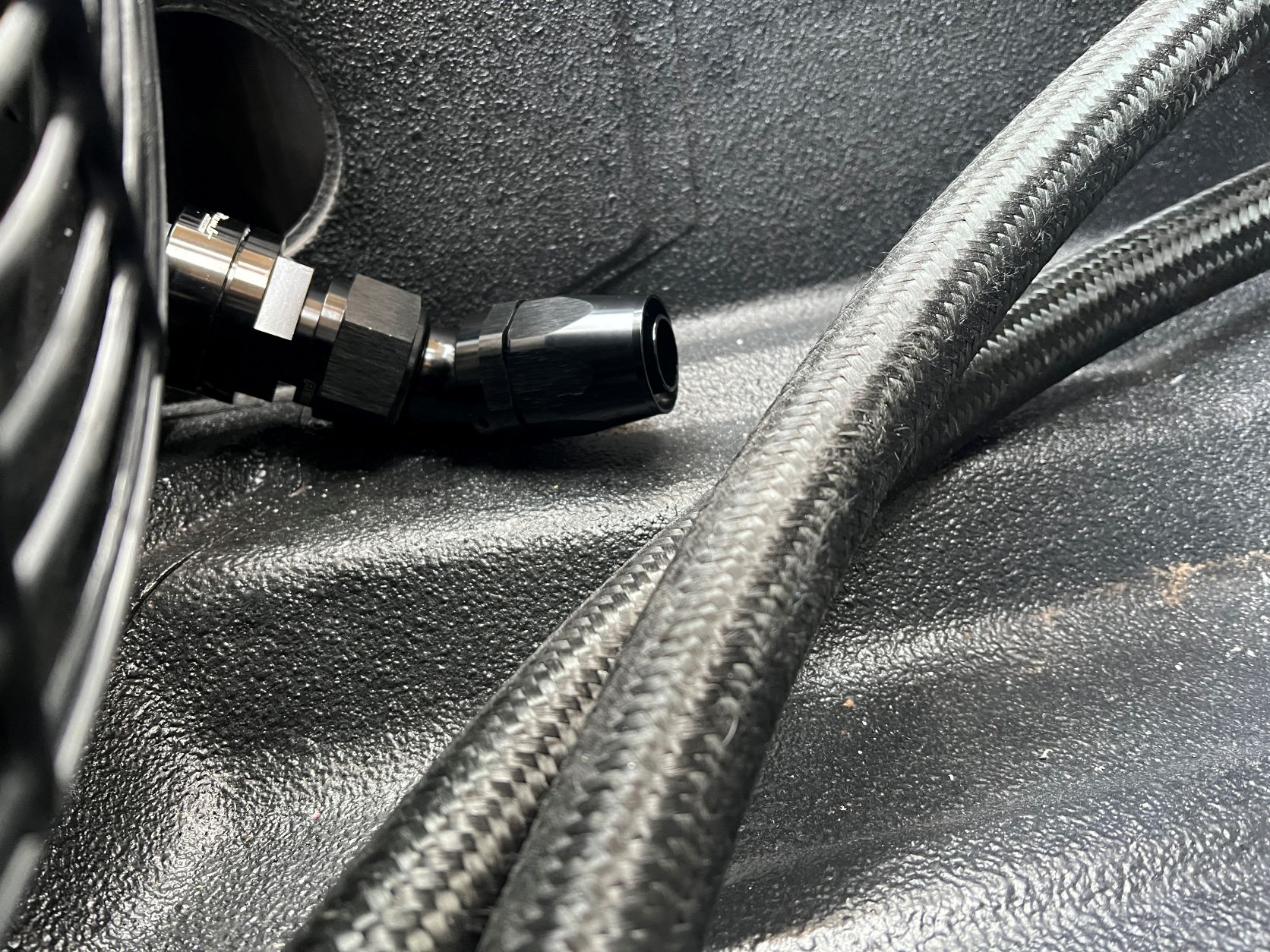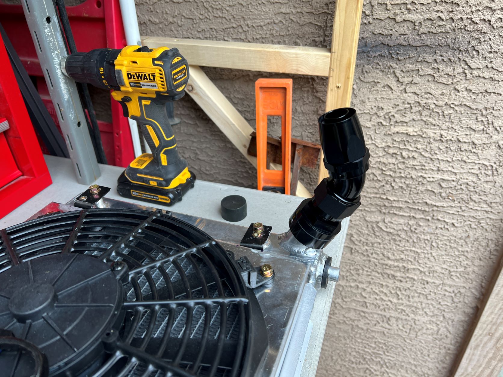 My AN adapters and fittings finally arrived. I installed the adapters on my radiator, and did a quick test fit of the elbow on the passenger side (lower outlet)...