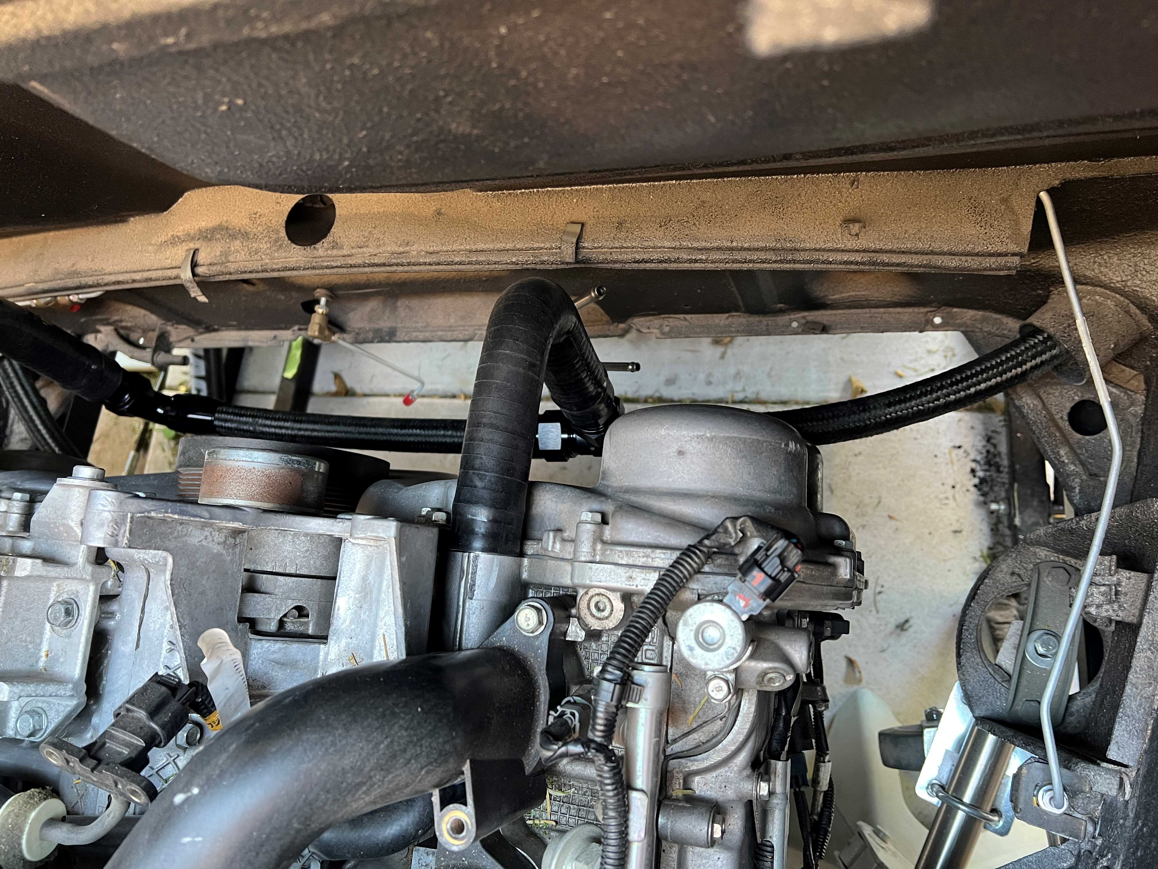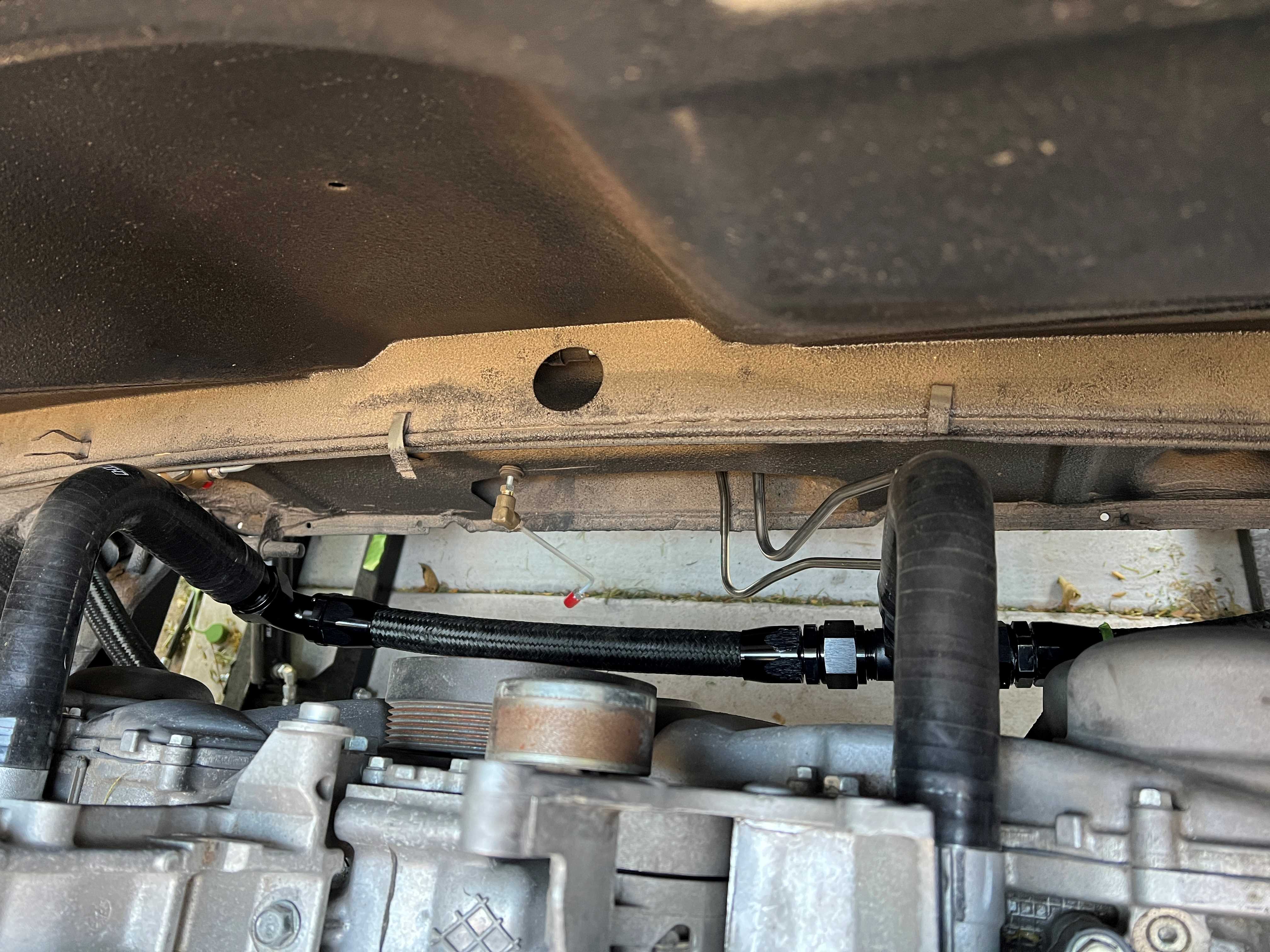 Received my parts/adapters to re-do the coolant outlets coming off the heads. I had to remove one hose end, cut the hose shorter and reinstall. My stick man arms are barely up to the task of installing -16AN hose ends while under the car, but I got it done. Much cleaner looking, and a lot more room than the straight reducers. (IMG:style_emoticons/default/aktion035.gif)