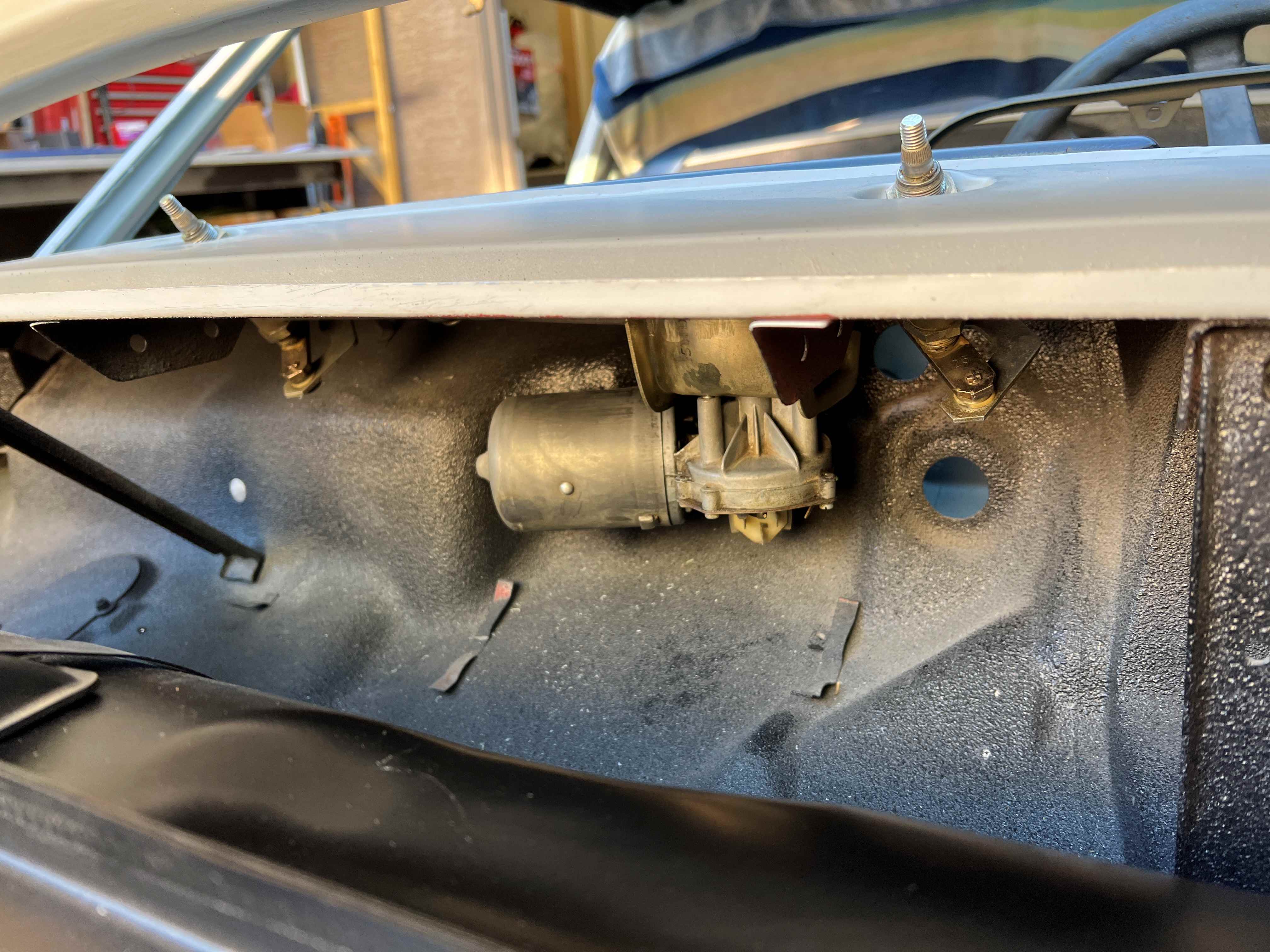 Anyway, I did try to get my wiring planned out as much as my brain could handle. Got the fuse block, wires, pins, etc. all ordered. Since working INSIDE was the only real option, I tried to document and wire up what I could in the house. It wasn't much, but it was SOMETHING (IMG:style_emoticons/default/wacko.gif) It's finally back under 110, at least for a few days so I'm trying to plan out and do a few things on the 914. Still need a big-ass fan running to keep you alive though! I was unable to find my battery tray support so I had to order another one. Also ordered the rubber mount for the wiper motor. Trying to determine the best spot for my fuse block and needed to see how much room there is under there with the wiper motor in place. Still need to order new rubber washers/seals for the wiper assembly... |