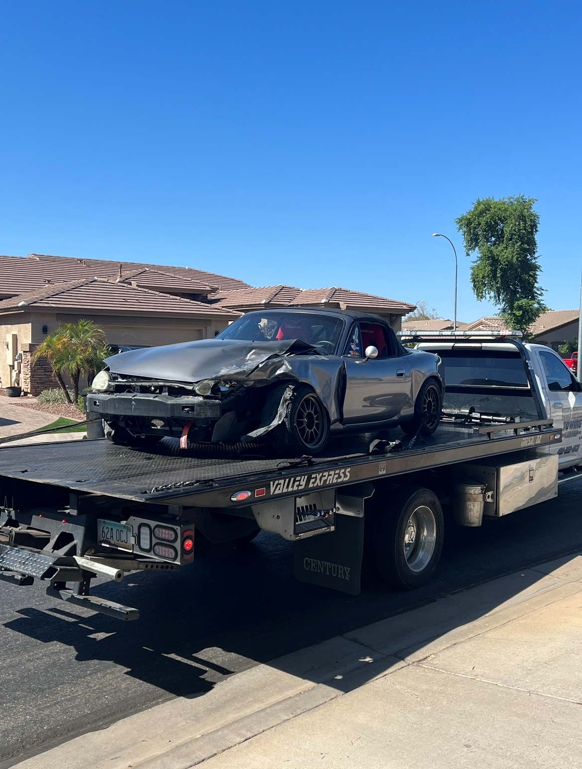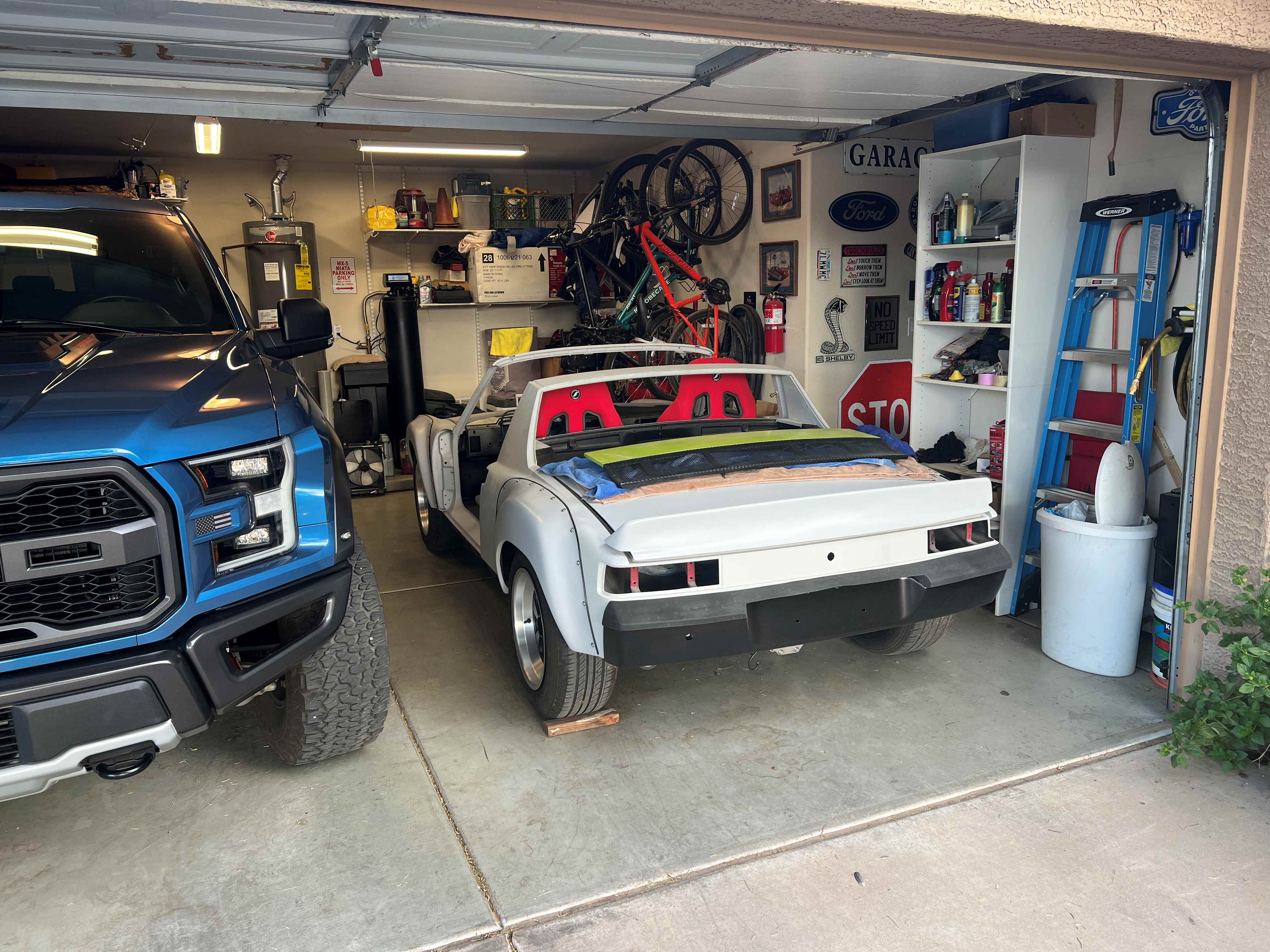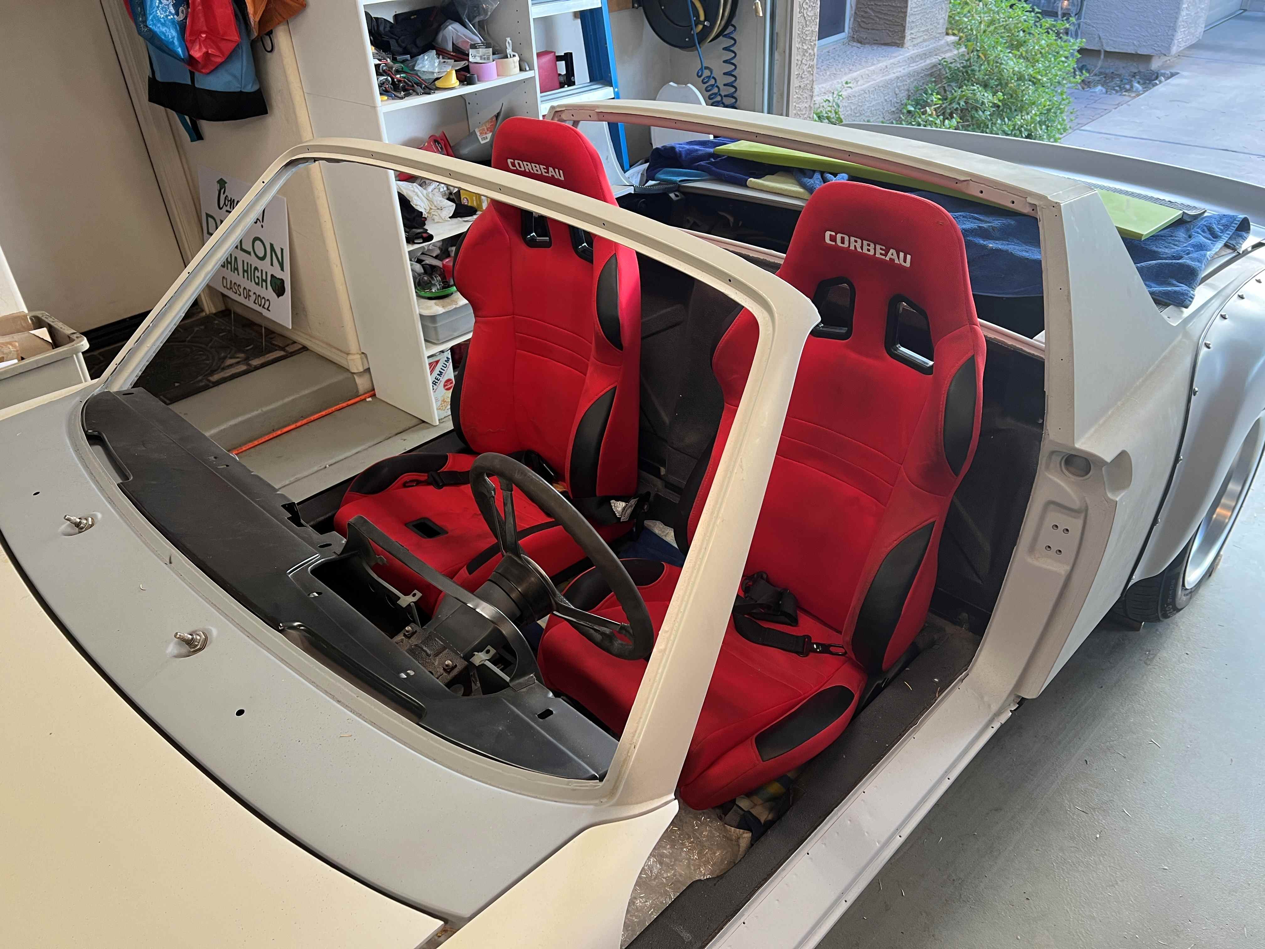 But, not for a good reason... (IMG:style_emoticons/default/wacko.gif) HS girl turned left right in front of our son on his way to work last Thursday morning. Thankfully, nobody was injured. Can't say the same for the Miata! Neither door will even close all the way anymore (IMG:style_emoticons/default/sad.gif) Quick test fit of the Corbeau seats our Son had in the Miata. I may be able to use his Momo steering wheel also... Now for the joyous "Insurance Games"... (IMG:style_emoticons/default/barf.gif) |