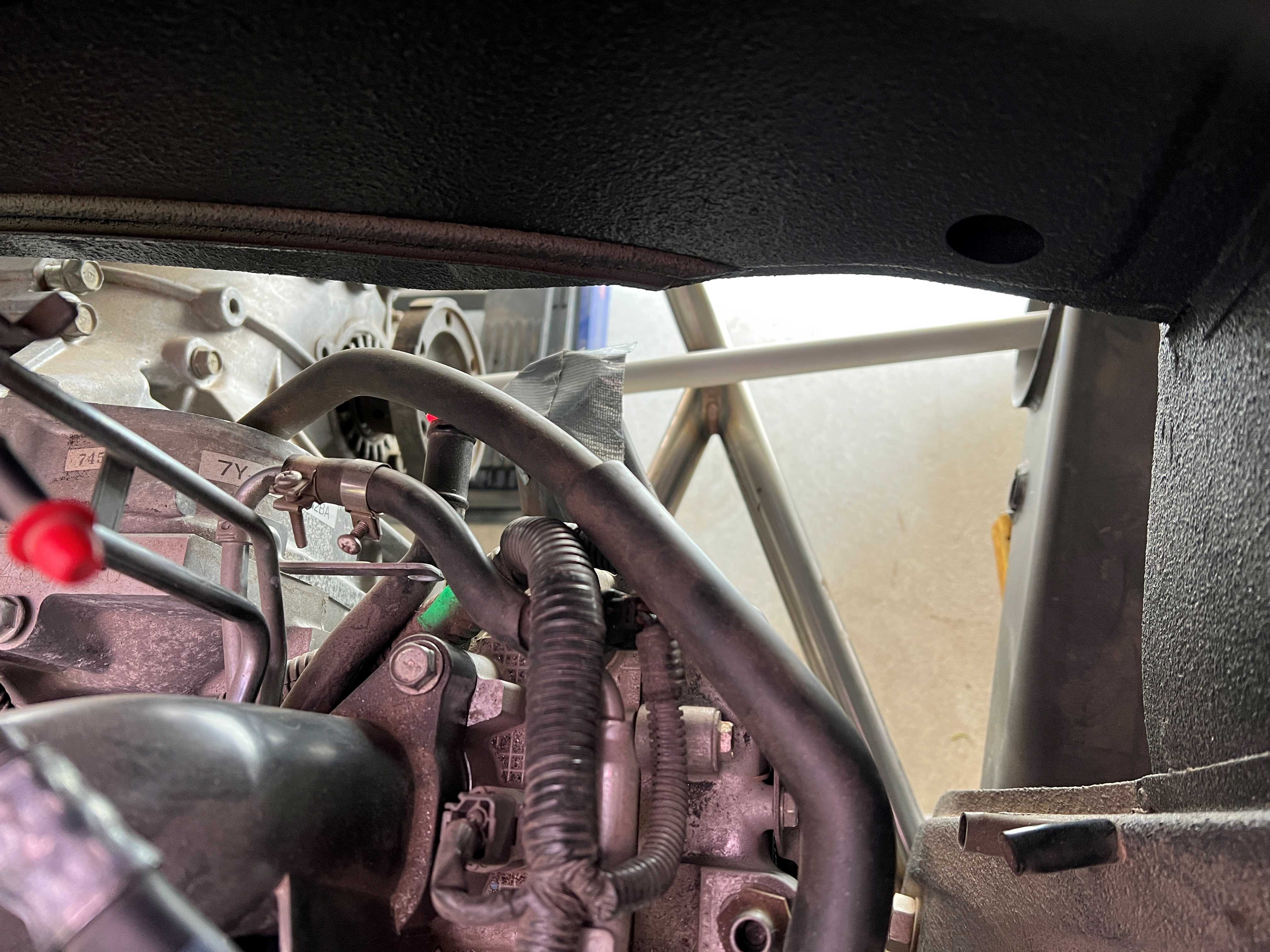 I still need to run the brake and clutch lines through here along with the wiring for engine sensors, etc. At least it's easily removable for modification, etc. |