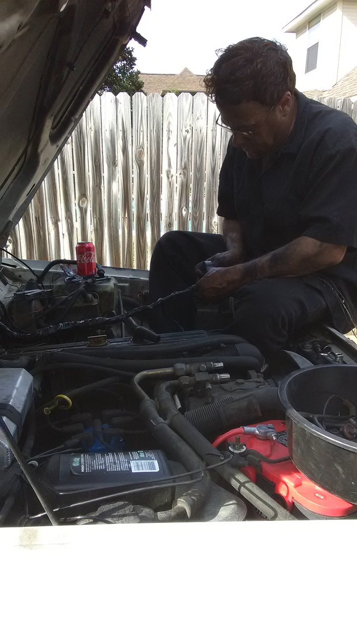 I replaced the exhaust manifold with the broken stud with a header. They moved the O2 sensor bung to the other side of the truck, so I had to strip the harness and move the wires for the O2 sensor to run down the right side of the bell housing. The pictures are me sitting in the engine compartment removing the electrical tape from the harness. ![]() Turns out the EGR tube twisted off the threads on the fitting for the mainfold side of the tube. I braved the outside world, and bought some steel rod. I used it to make 2 pipe plugs (Nothing is available in M22x1.5 at our local Ace hardware). I own a M22x1.5 die, so I threaded the rod, then cut it off and ground a 13mm section on the end so it had square flats on it. I screwed them into the EGR connection on the bottom of the mainfold, and into the header's EGR port. This will have to do until I can get the right fitting to replace on the end of the old EGR tube. I put everything back together. In the process I found out the header now blocks one bolt that holds both the header and the intake manifold to the head. I dropped that ^$%@%$^%@ bold 28 times (Yes, I was counting) before I finally got it started. I had to tighten it from the bottom with an open end wrench. Dropped the wrench a few times, one right smack in the center of my forehead. (IMG:style_emoticons/default/blink.gif) I am tired, bloody and battered. But the exhaust leak I had is now fixed. (IMG:style_emoticons/default/smilie_pokal.gif) |