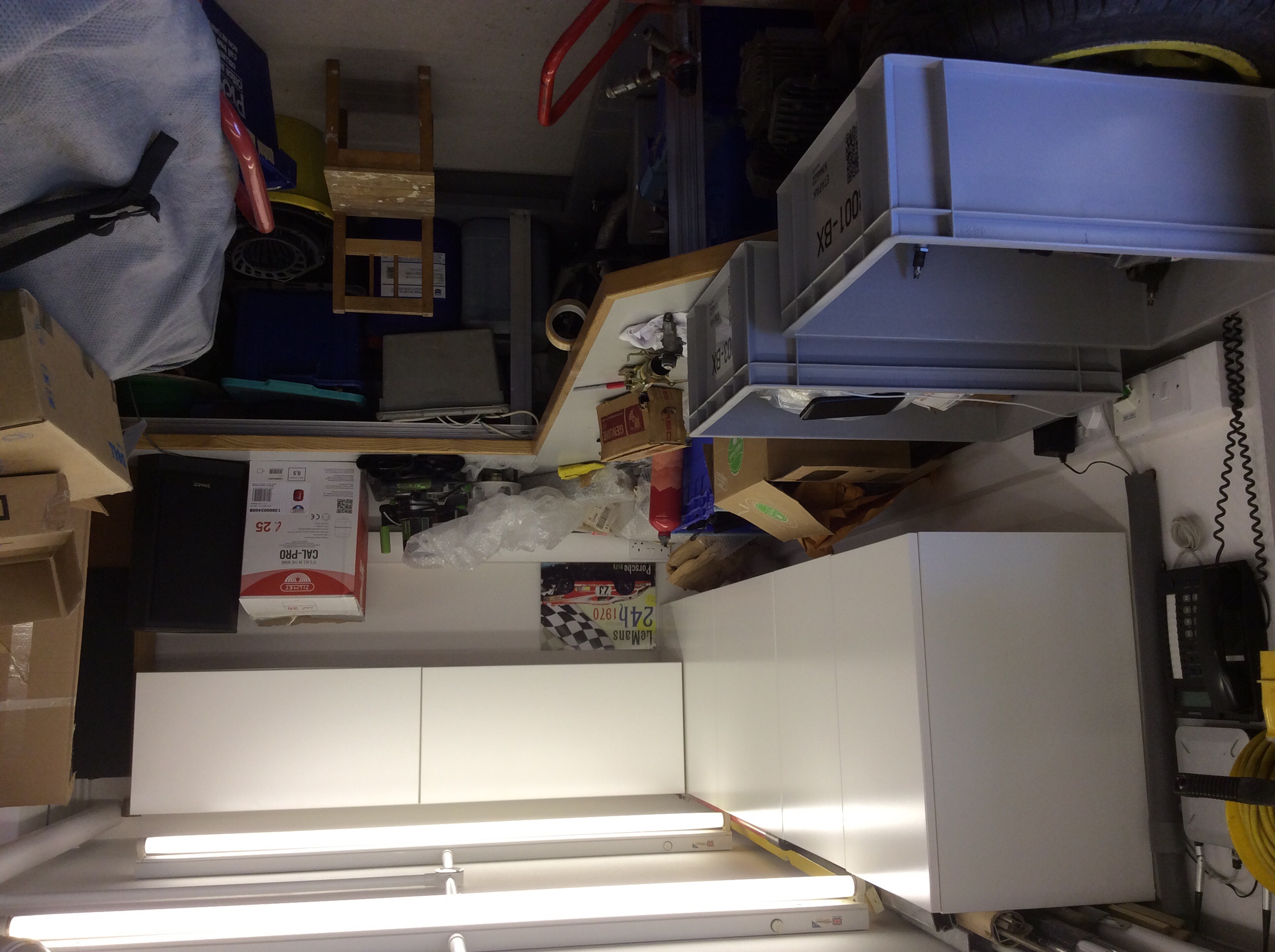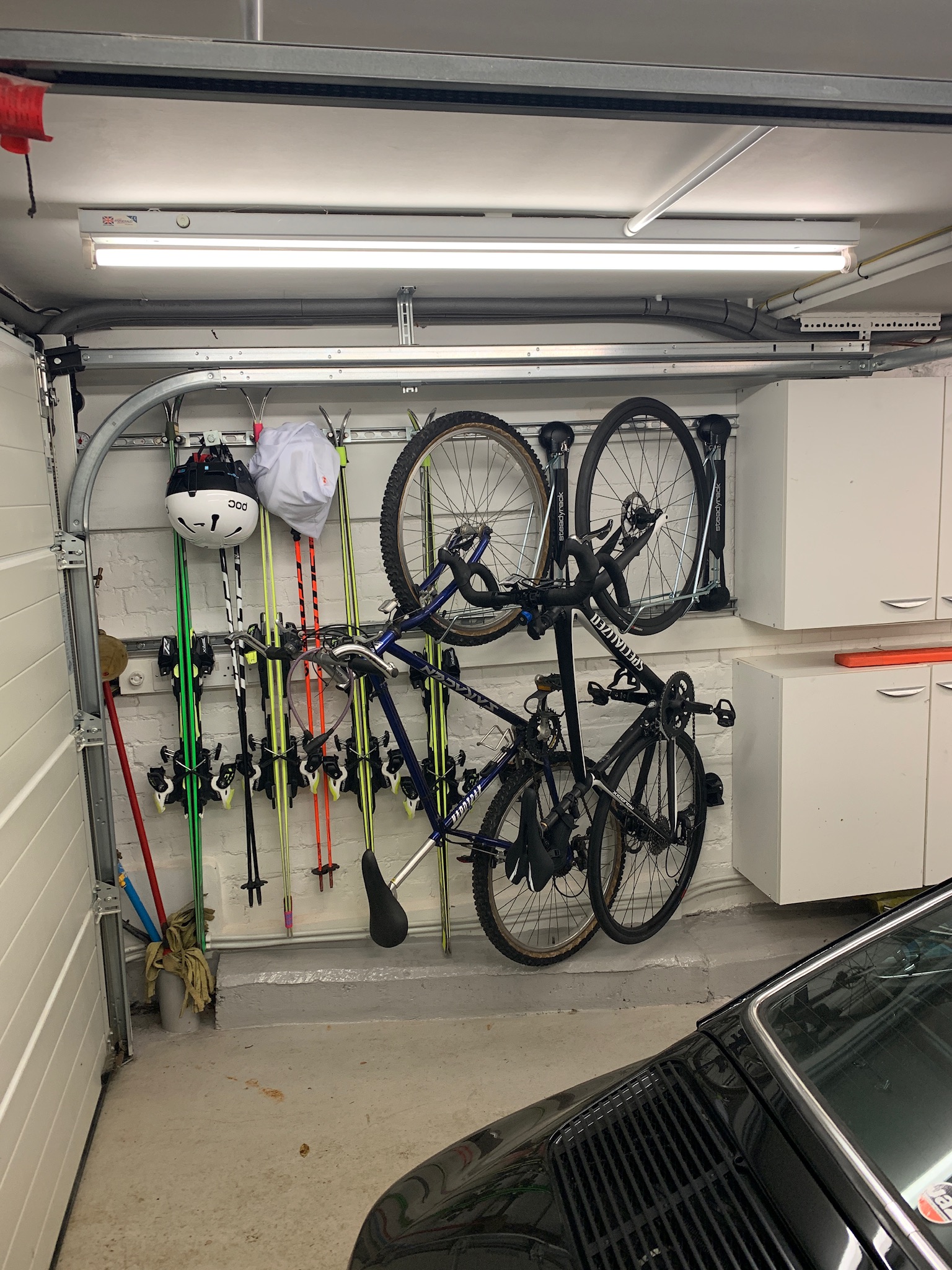 Scrapped some crappy cupboards from the front to make space Ikea kitchen cabinets around the workbench at the back Horizontal Unistrut rails on the walls as flexible fixing points, couple of Steadyracks (excellent BTW) for the bikes and chopped down M12 bolts with PVC tube slipped over to protect the skis |