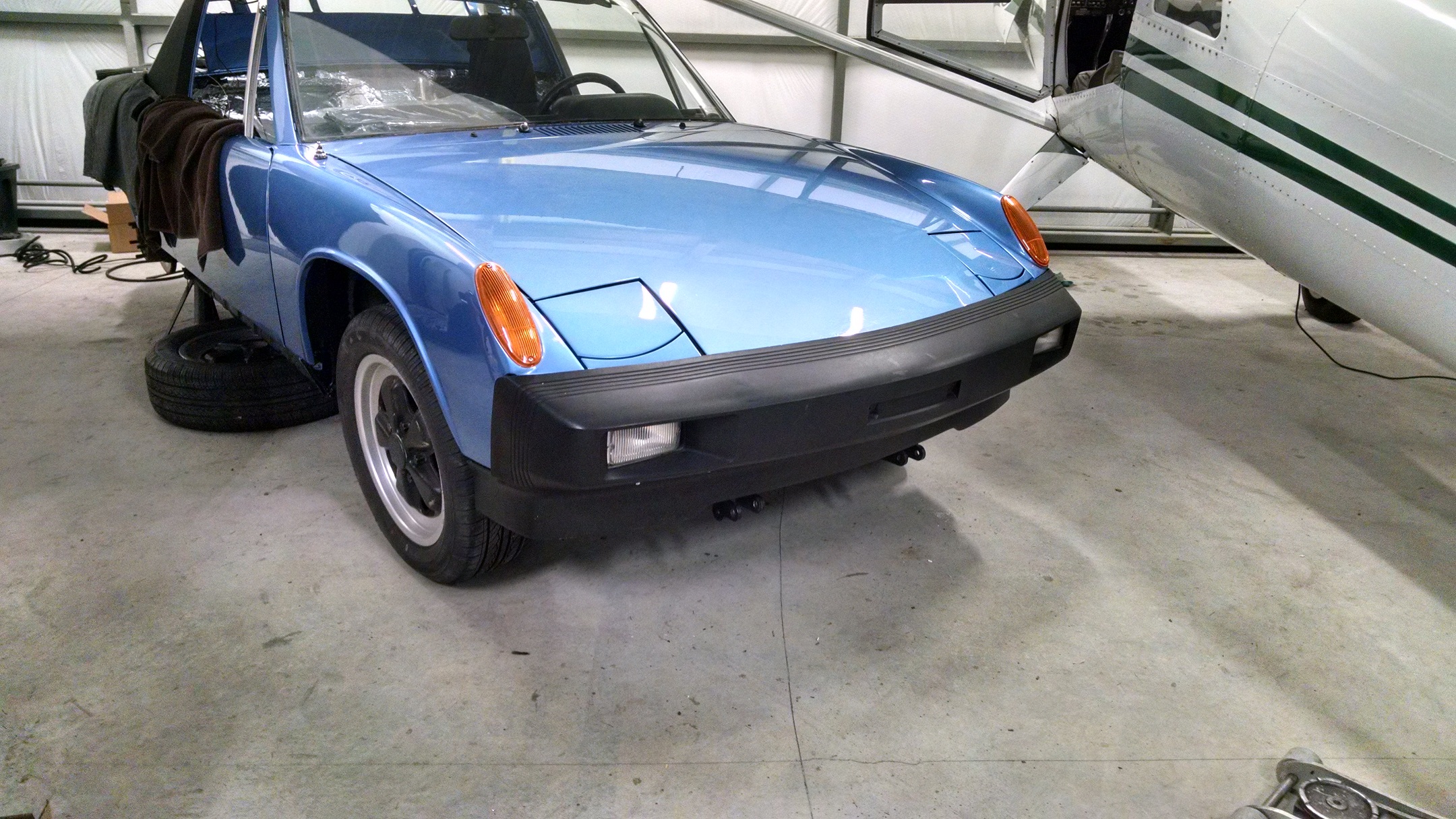 1970's Porsche driving lights are not light, adding those to the bumper really gave me a workout when installing! Also getting tired of working on the 914 under the wing. I've bumped my head a hundred times. It'll be nice to get it off jackstands and over to a clearer part of the hangar. Attached thumbnail(s) |