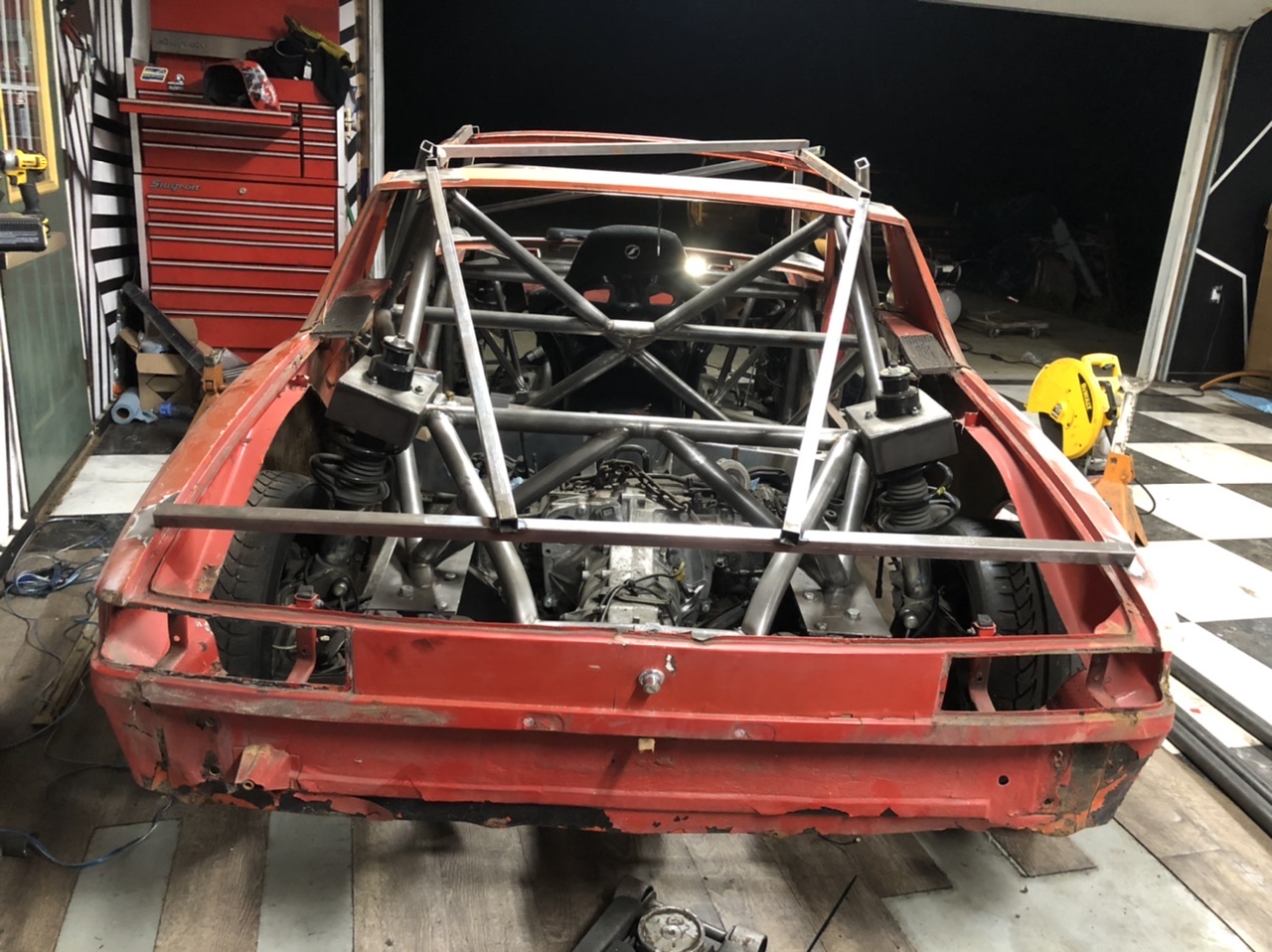The Body Is On! ....kinda. i finally got a couple people together to set the body on top. it is neither mounted nor sitting in the right spot. it needs to go forward 2.5” it should fit up very good! obviously there are a couple “visual issues” the strut tops certainly poke through but i think it will just add to the crazy look!