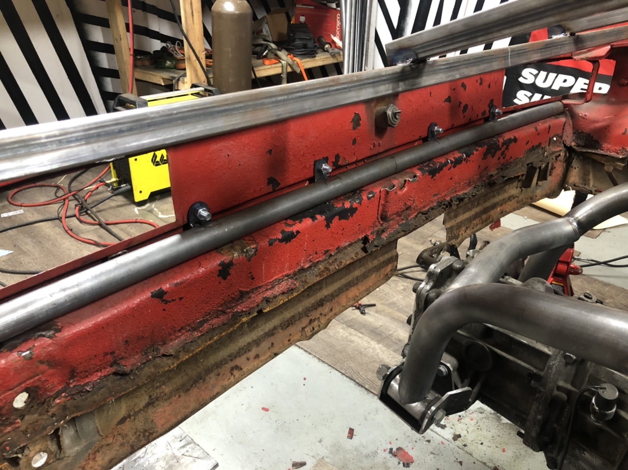 Body is about to go on! I think im going to try setting it on tomorrow. It drops directly down on to the chassis, and by our backstrain-o-meter we figure i got the body down to about 120 lbs. Its really no problem for two guys but we will see how that goes. Im glad i got this car instead of anyone else because i would NOT want to restore this. It had rust everywhere from hell hole, to driver speaker pod of all places. I was the perfect guy for this car because i kept none of that gross orangy brown stuff.