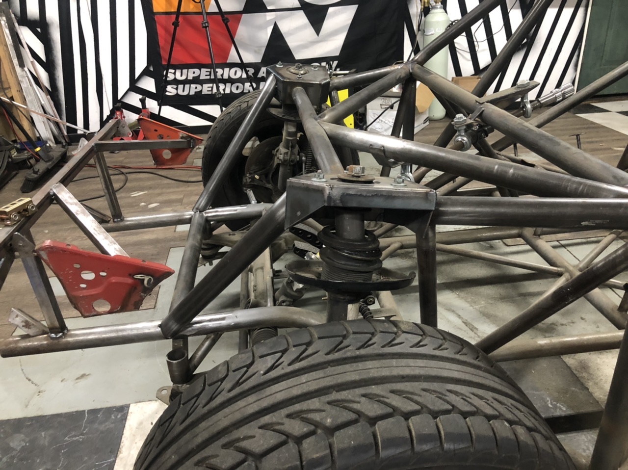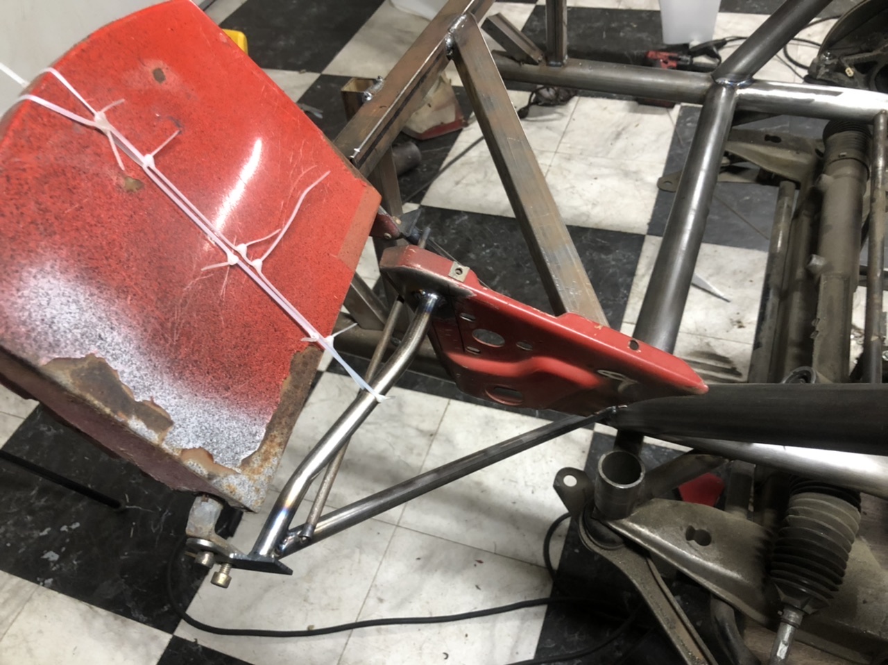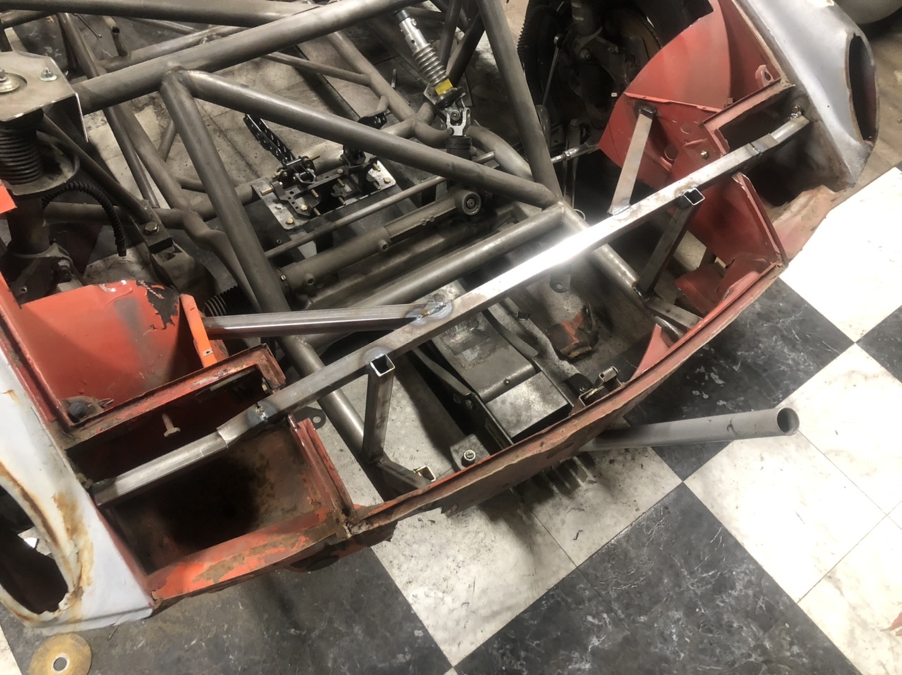 Got to work cutting out some tubing i have began to hate the look of. The tubes that go from the main chassis rail to near the shock towers got removed. Instead i will be welding in a tube that will go from the front cross bar to the shock tower. It will probably make more sense when its in so trust me this is for the best.