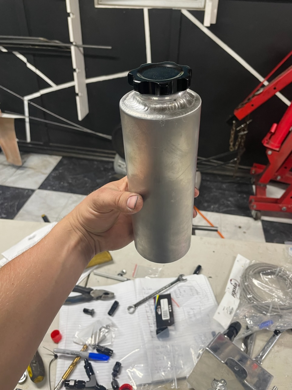 Small bit but i like the result; i took an old catch can that had only pipe threads cut into each end. So i cut a major hole in the top and welded in a screw on cap. It went from beat up old catch can and gave it a new lease on life. It will be the fill point for ghe radiator up front.