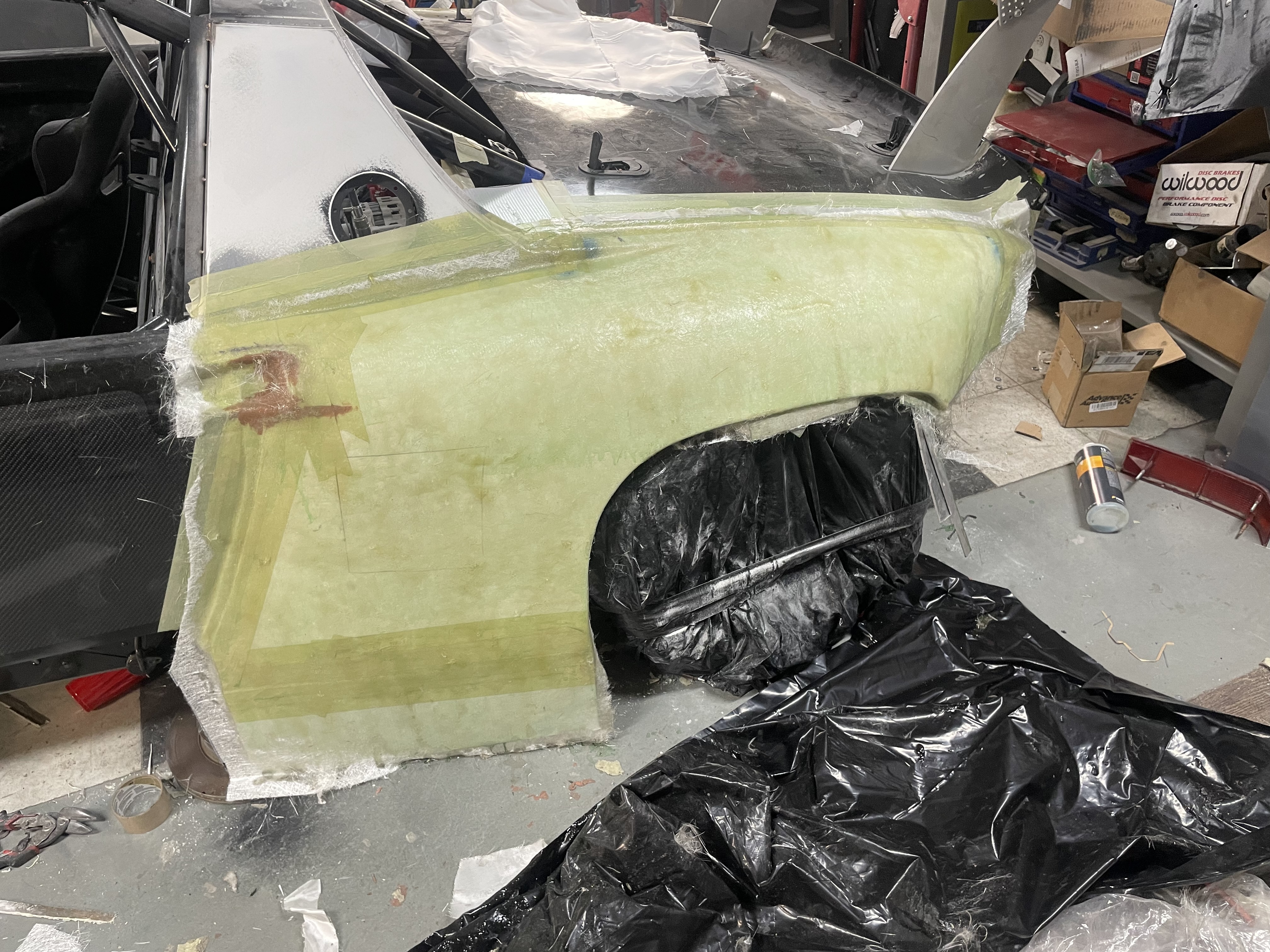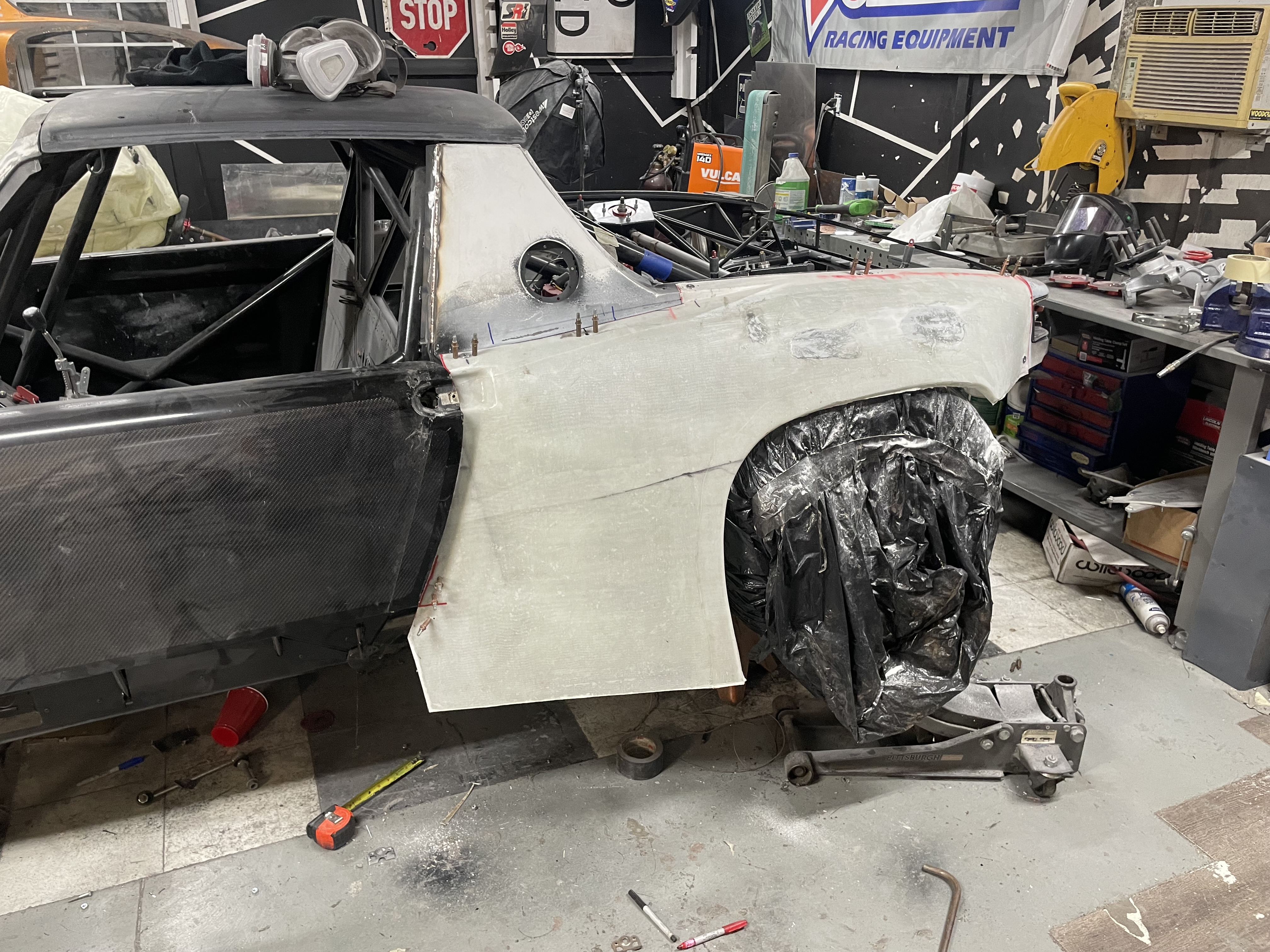 The rear fenders are about a half inch too narrow so i did the extra long step and stuffed a bunch of spacer behind the wheel opening and made a set of slightly extra wide rear fender molds. I also extended the bottom a few inches so it actually goes all the way to the floor as this chassis is about 2” taller than stock to fit the suspension under the hoods
