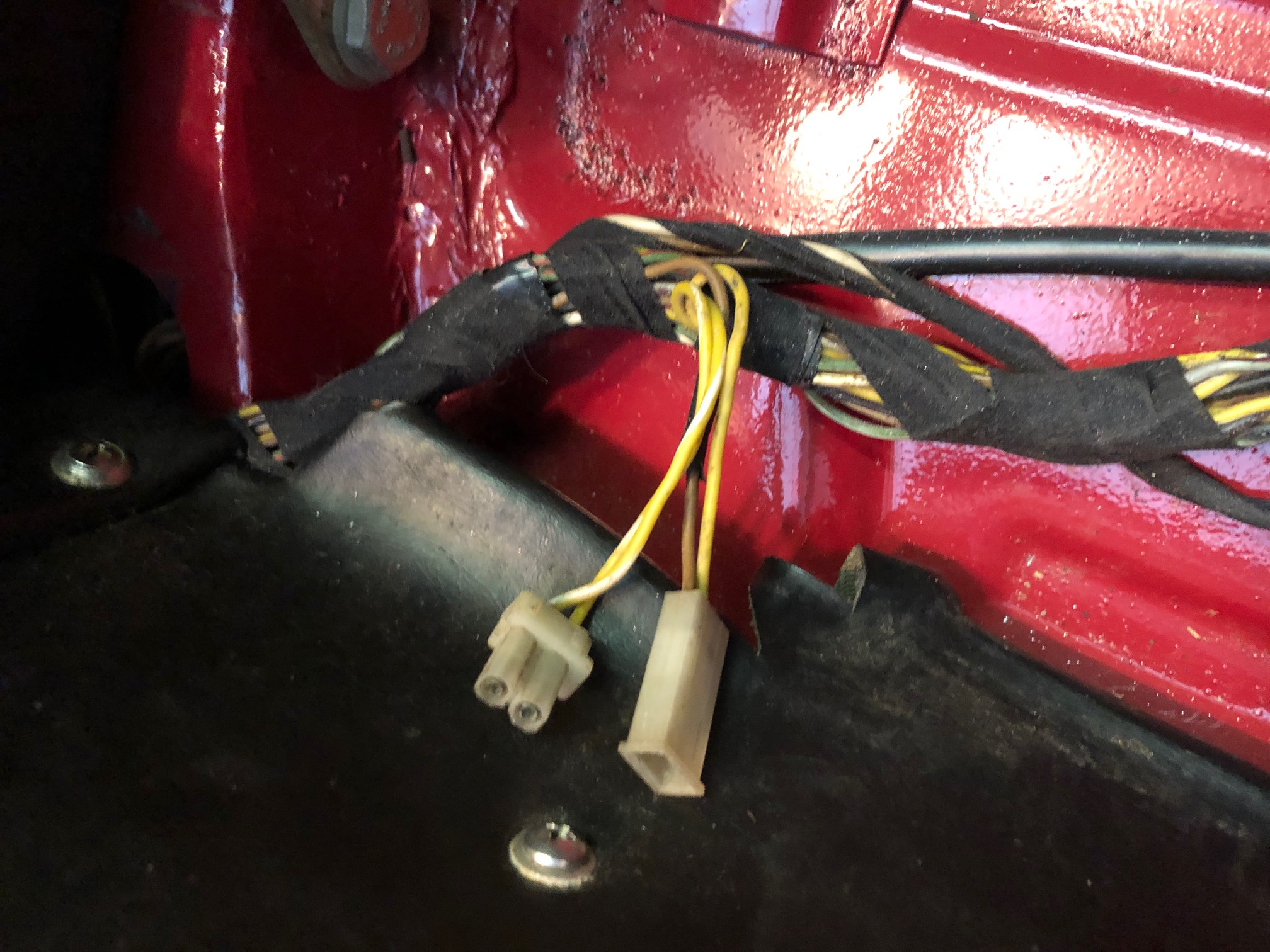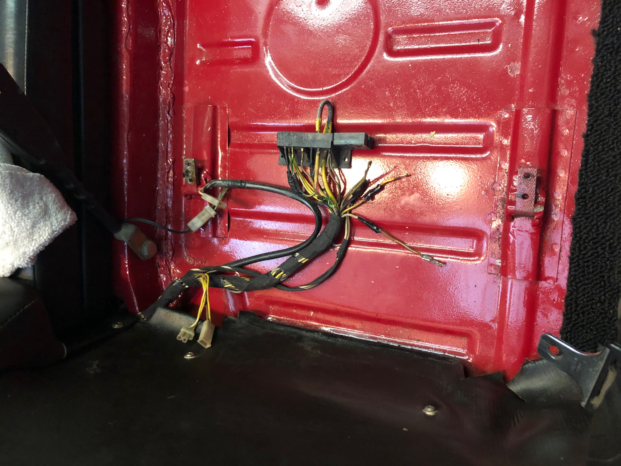 Looking for some help with the wiring I found underneath the passenger side seat. Removed seat and found half the wires laying on the floor uninsulated and half plugged into an empty lead block. (see photos). I know for 74 they had some controller under the seat that would not allow the car to start if the seatbelts were not used. Also a buzzer for when the seat belts were not used. My car is a 76 and not sure what should be there.