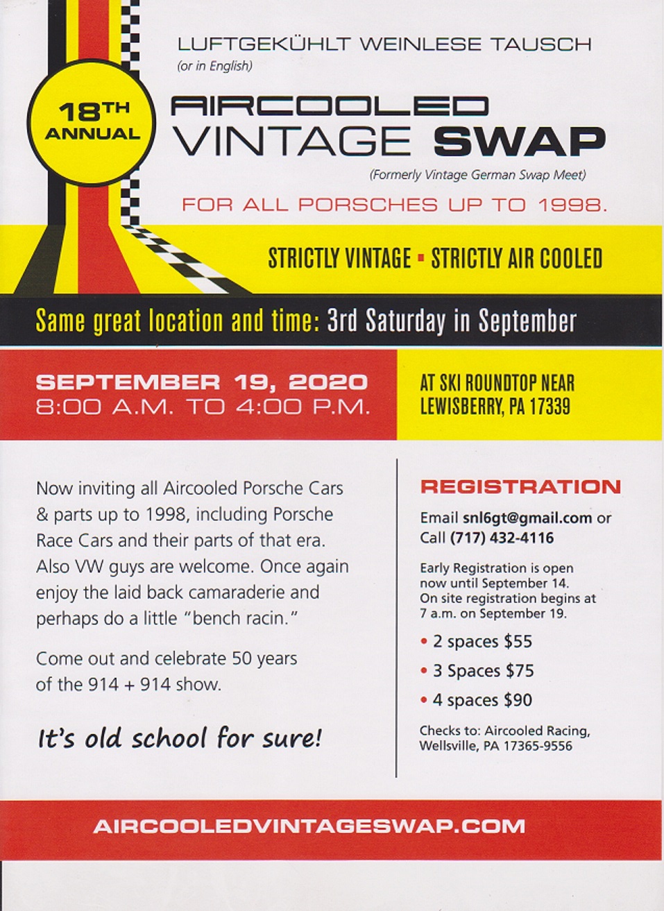 The management company for Ski Roundtop cancelled this swap meet due to Covid-19. Steve Limbert found another nice location only a few miles away, so the show is still on. The new location is on the grounds of the Liberty Forge mini-golf course. Address: 3921 Lisburn Rd, Mechanicsburg, PA 17055 There will be a 914 car show to celebrate the 50th anniversary of our beloved teeners, with peoples choice gifts for 1st and 2nd place. Hope to see you there! Bob |
