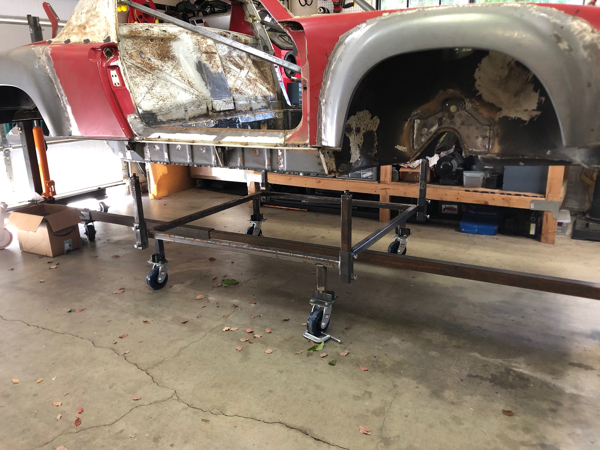 Really not looking forward to the front two cowl repairs where the windshield frame meets the front fenders.... That will be next on the list along with some other minor fabrication for oil cooling system. Halfway through sanding the old rattle can black paint off. Cowl painted and placed on engine. Carburetors mock placed just to get me all fizzy about the project again. Frame dolly fabrication in progress Frame dolly completed and placed under the rotisserie. How she sits today: |