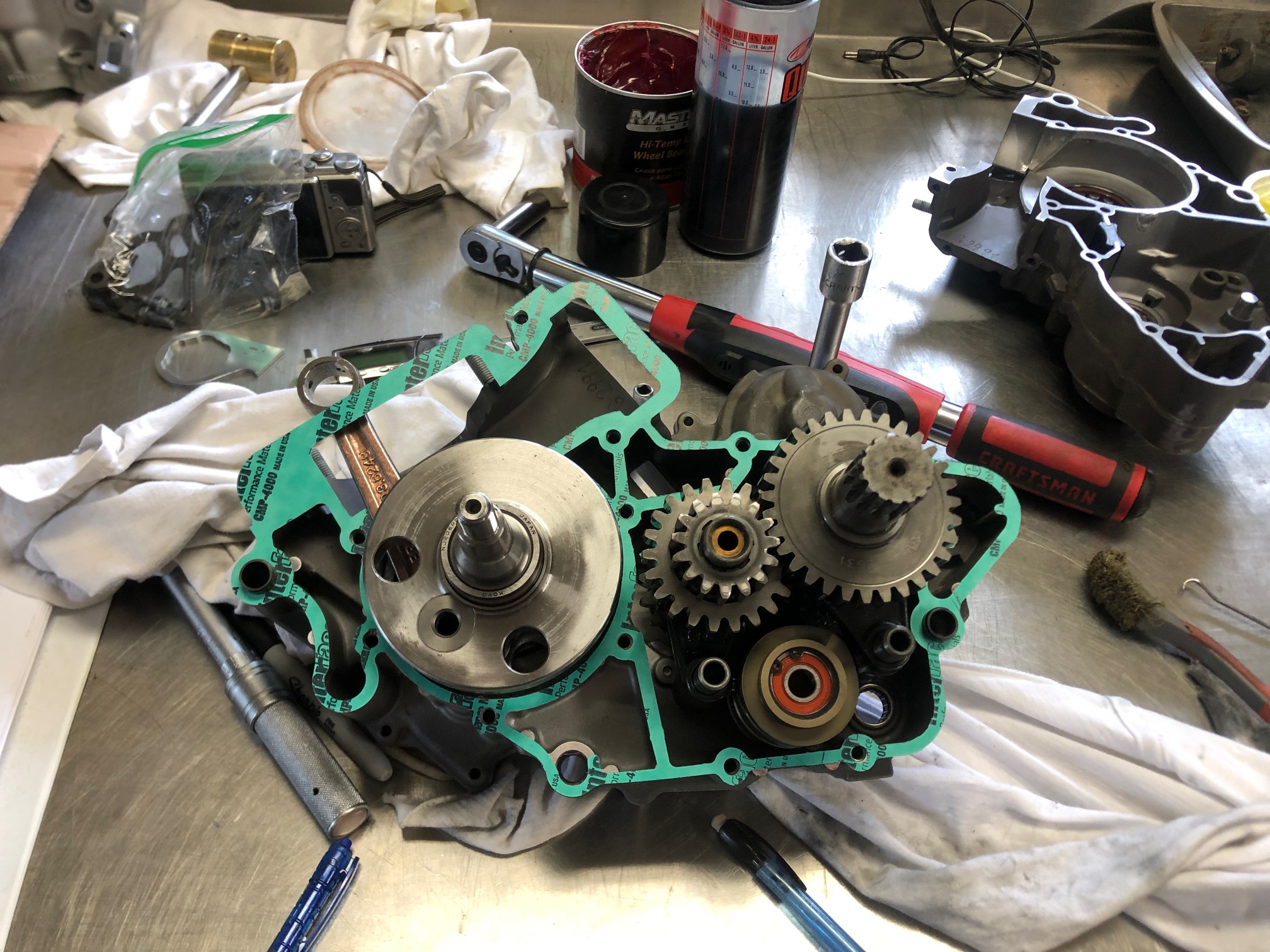 KTM engine mid-rebuild. Hopefully it will get some use this fall, but with the fresh baby its hard to get the green light to get away for a weekend!