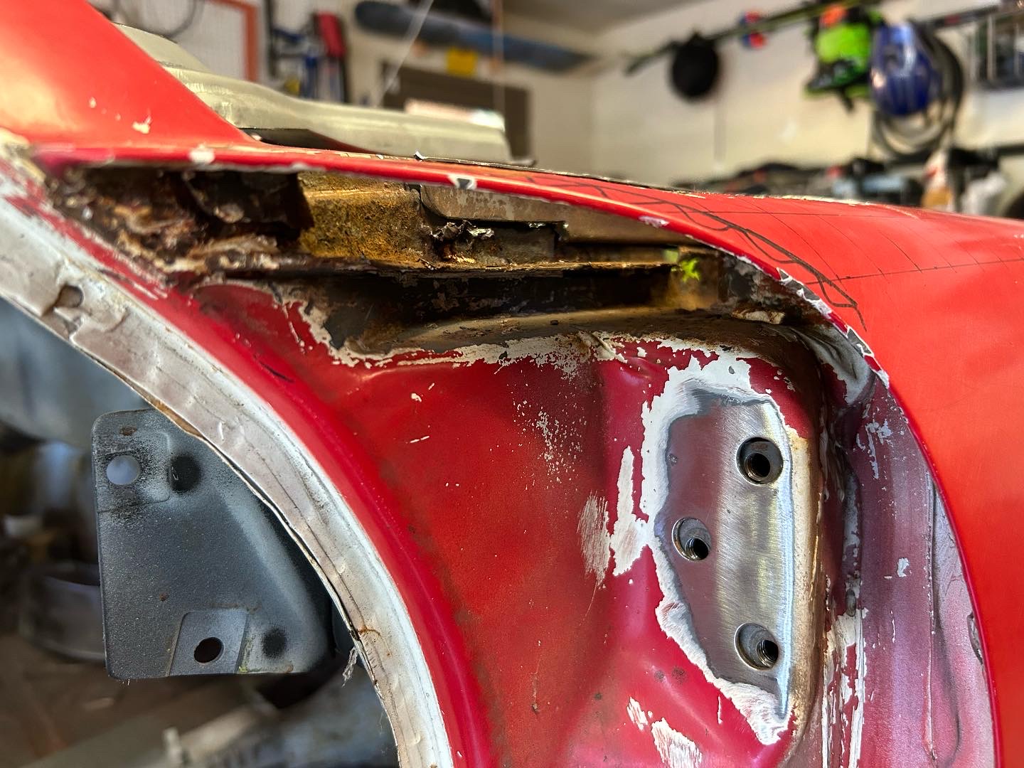 Finally after a year of avoiding it I decided to open the can-o-worms that is the front cowl repair. I'm just a home hobbyist who dabbles in this sort of thing so naturally I was a bit intimidated. Once again, a repair attempt was made (by a professional shop) under previous ownership. But they only did minimal surficial repairs that I had concerns that would come back to haunt me later if I didn't address it properly. So here's the first few cuts I made. Trying to avoid disturbing the folded corner of the fender to not mess with the door gap but it looks as if there's no way around chopping it off to get to the areas needed. I found a few good threads to click through photos, so hopefully it turns out better than it's status quo.