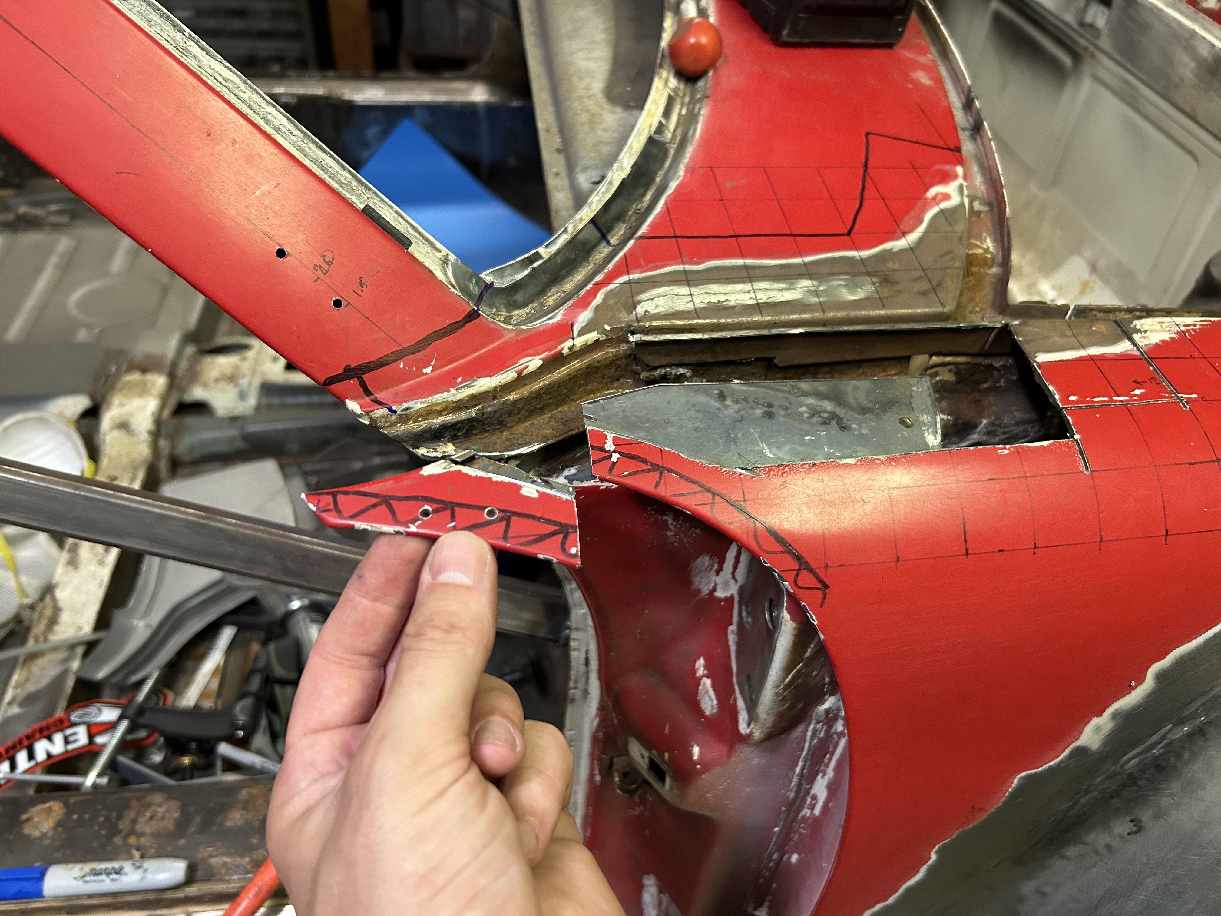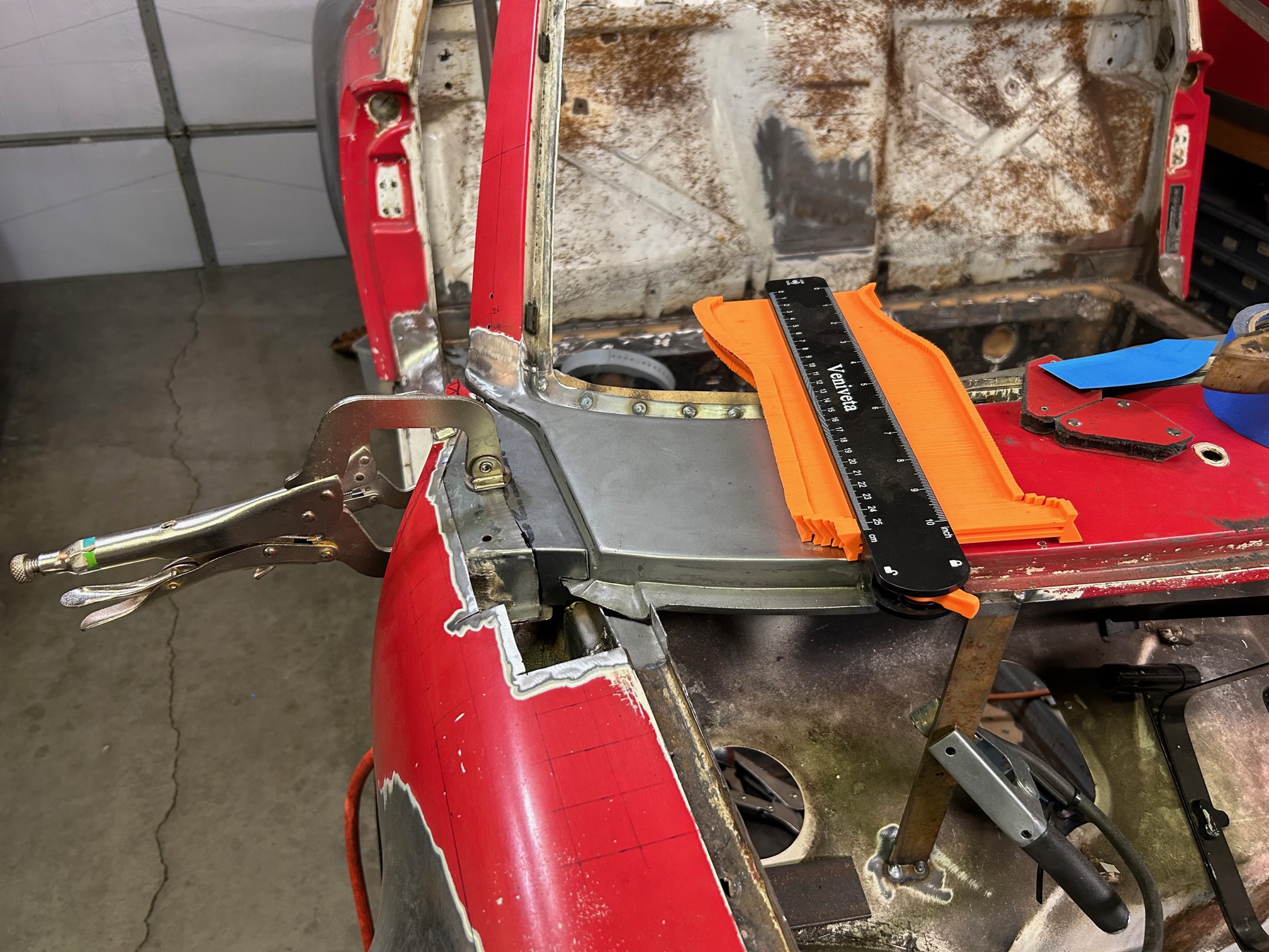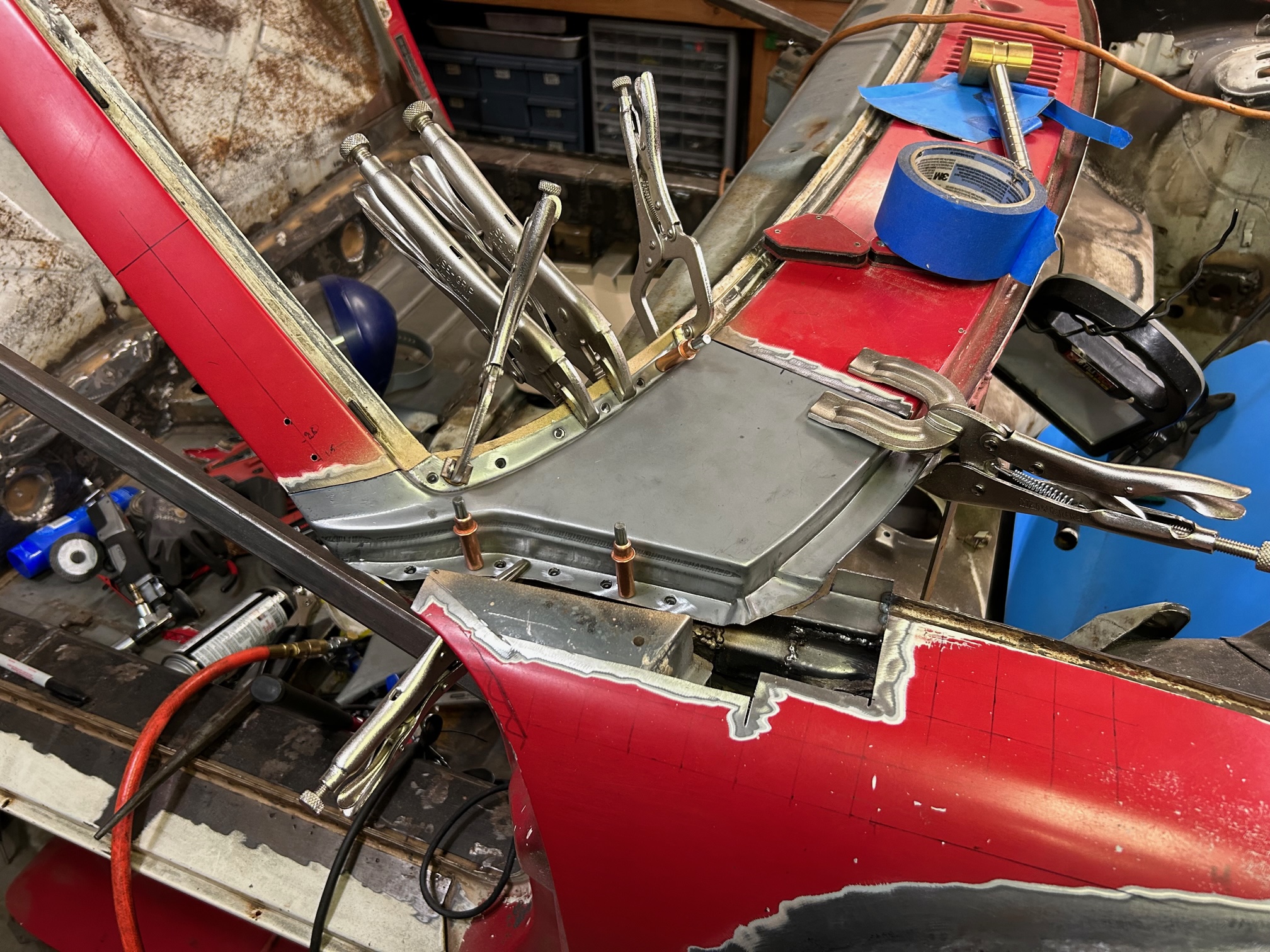 Thanks for sharing that. Yeah I'm going to do my best to re-use the outer "folded" piece original to the car. The inner radius issue I'll have to cross that bridge when I get to it. Hopefully I can massage the AA piece enough to tighten up that radius. Some hammering will be in my future. I used cleko's to "save the spot" where the corner piece goes to hopefully preserve the door gap. |