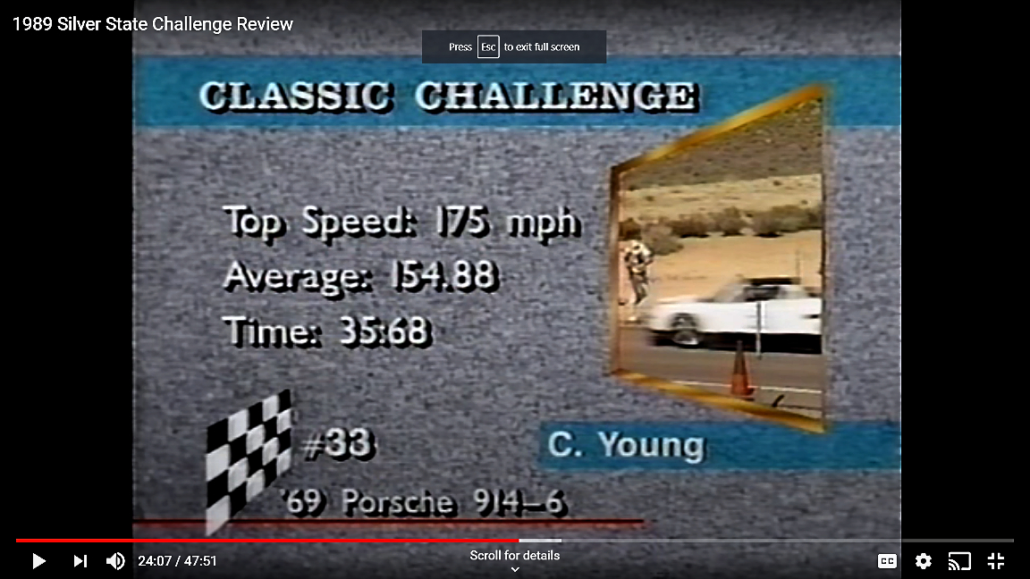https://youtu.be/e-PFfwxR3SQ?t=1326 Huge difference that Carl and co. achieved with a few effective aero devices. Surely, someone has, in the past 31 years, gone faster in a 914 in that road race, or any other. Carl's ' Porschaus 914-6 ' had set the standard with the run through the canyons, and a radar trap speed of 175. Tremendous legacy if their record still stands. http://www.914world.com/bbs2/index.php?sho...2522&st=296 |