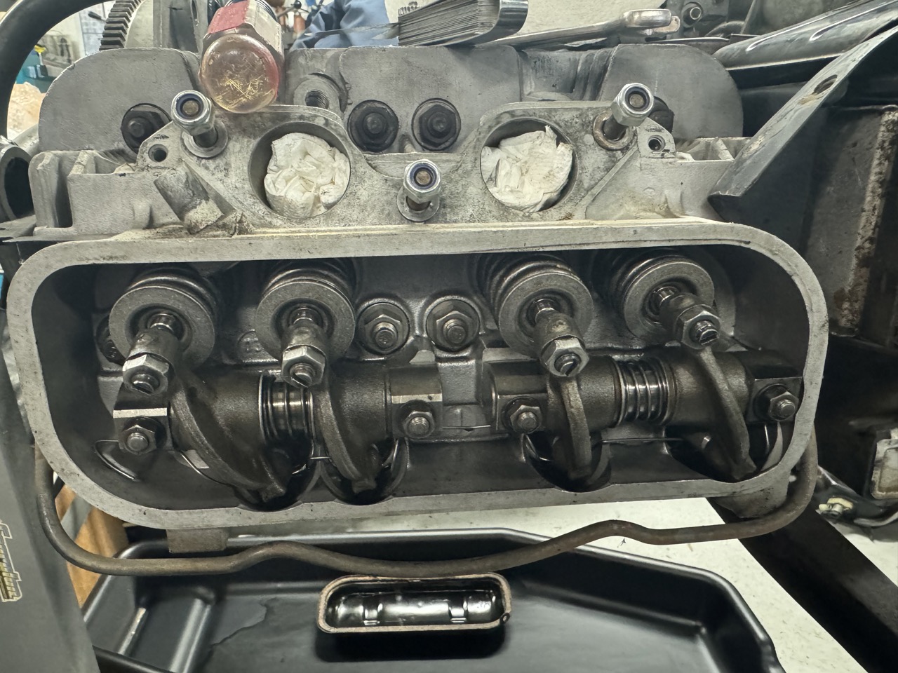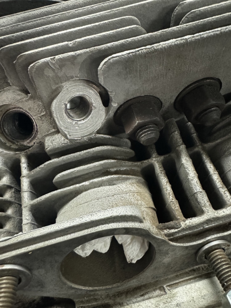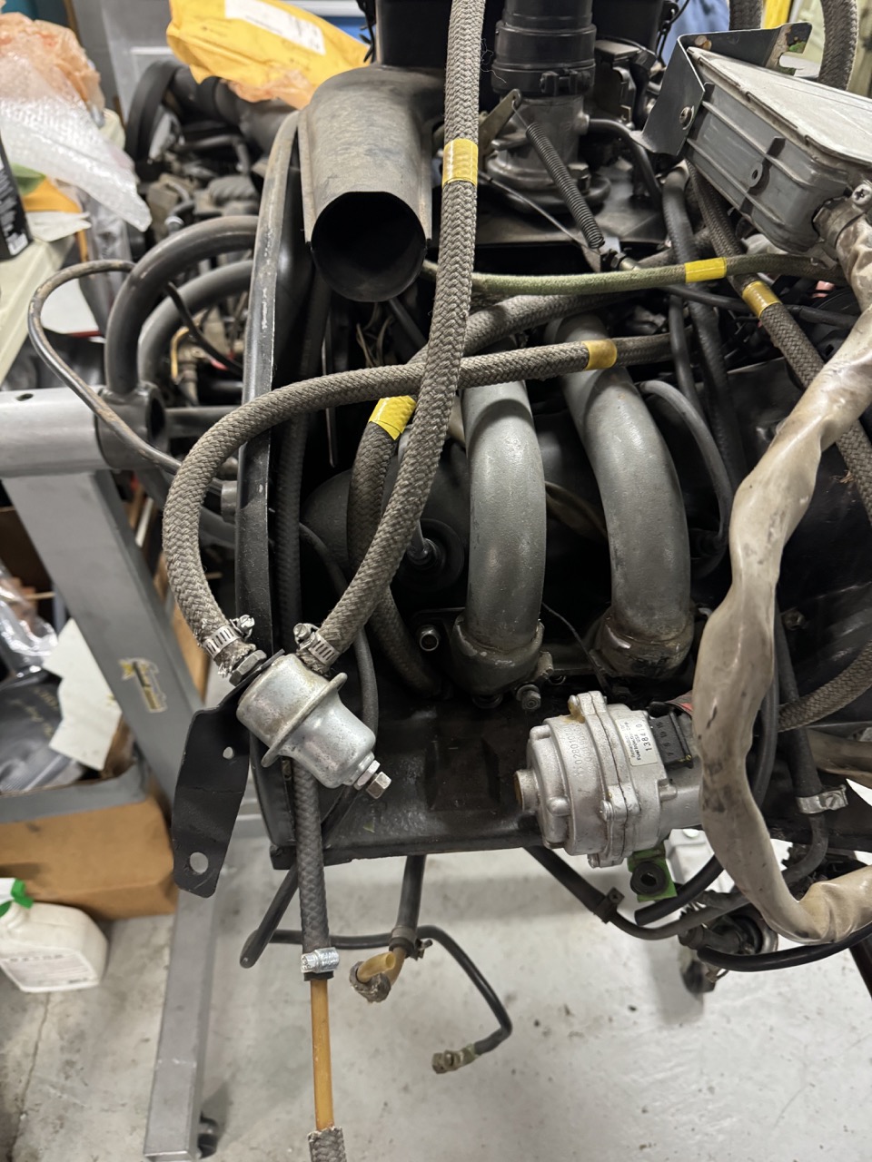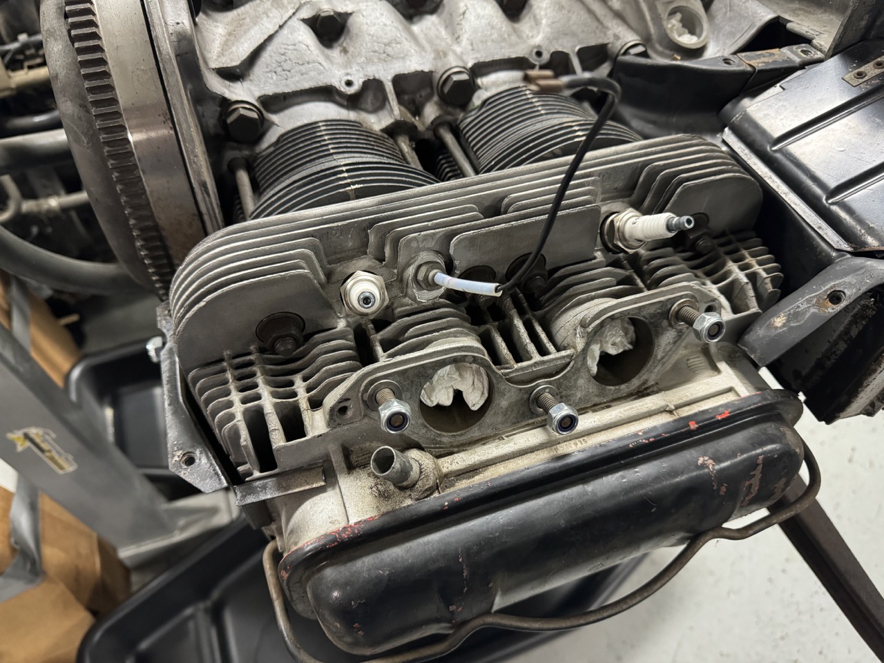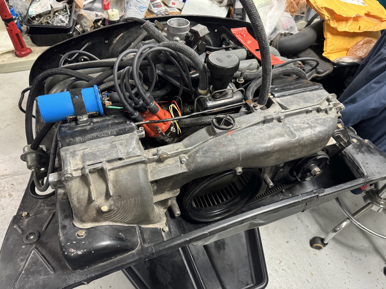 Had sporadic chances to work on the engine over the last few days. In that time, I painted the timing marks on the fan (and the fins near the marks), cleaned & inspected the throttle body & intake manifold, reset the distributor drive to the correct angle (12 degrees), helicoiled the CHT hole and installed the CHT, and reinstalled the cooling shrouds.