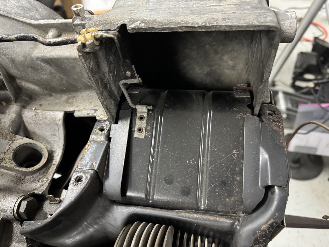 That "flap" is on the wrong side of the tabs. The way it is installed, it can never move. Probably done to make sure it didn't move because of the missing thermostat. Exactly. Probably done as you said, but seems to be more of a guess than a plan (see comment below). Not necessarily a DAPO, unless you know the guy, probably one of the mechanic's who had touched this example. I don't know. Locking the flaps open makes sense, but the spring on the flap rod also does that. However, they left the threaded hole in the block where the pulley attaches open and unplugged. It seems to me like someone who knew what they were doing would know to plug the hole, since it's open to the inside of the block. At least the open bolt hole explains all the oil under the engine. ETA? Not sure, but I'm hoping to have it drivable by summertime. |