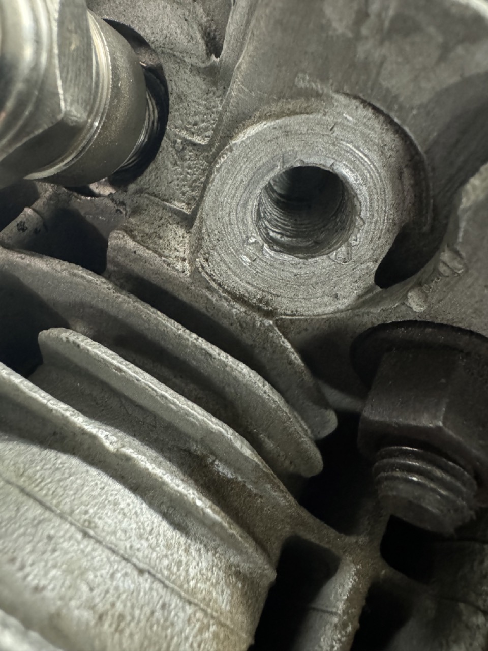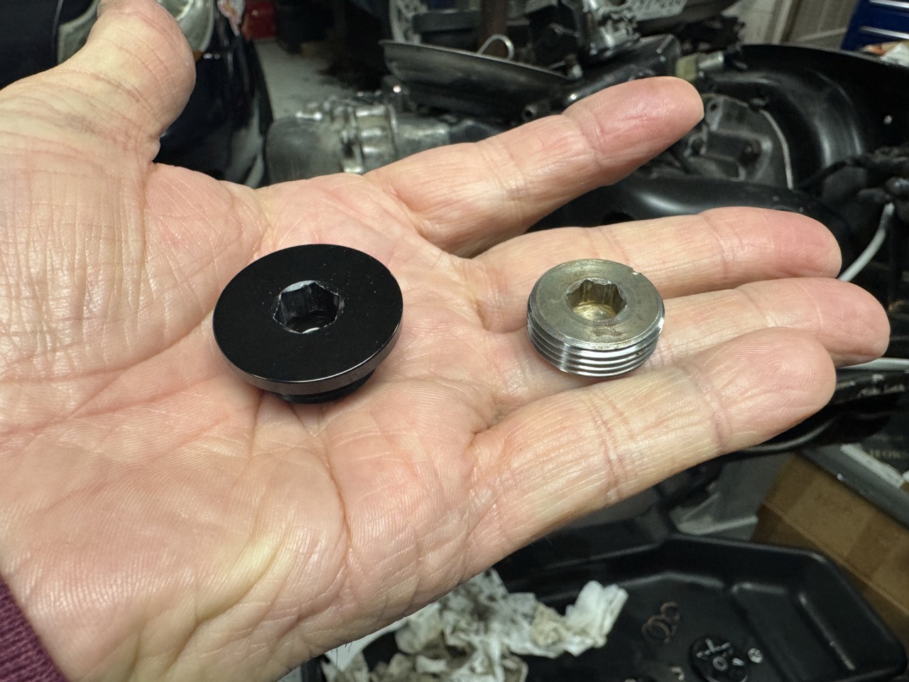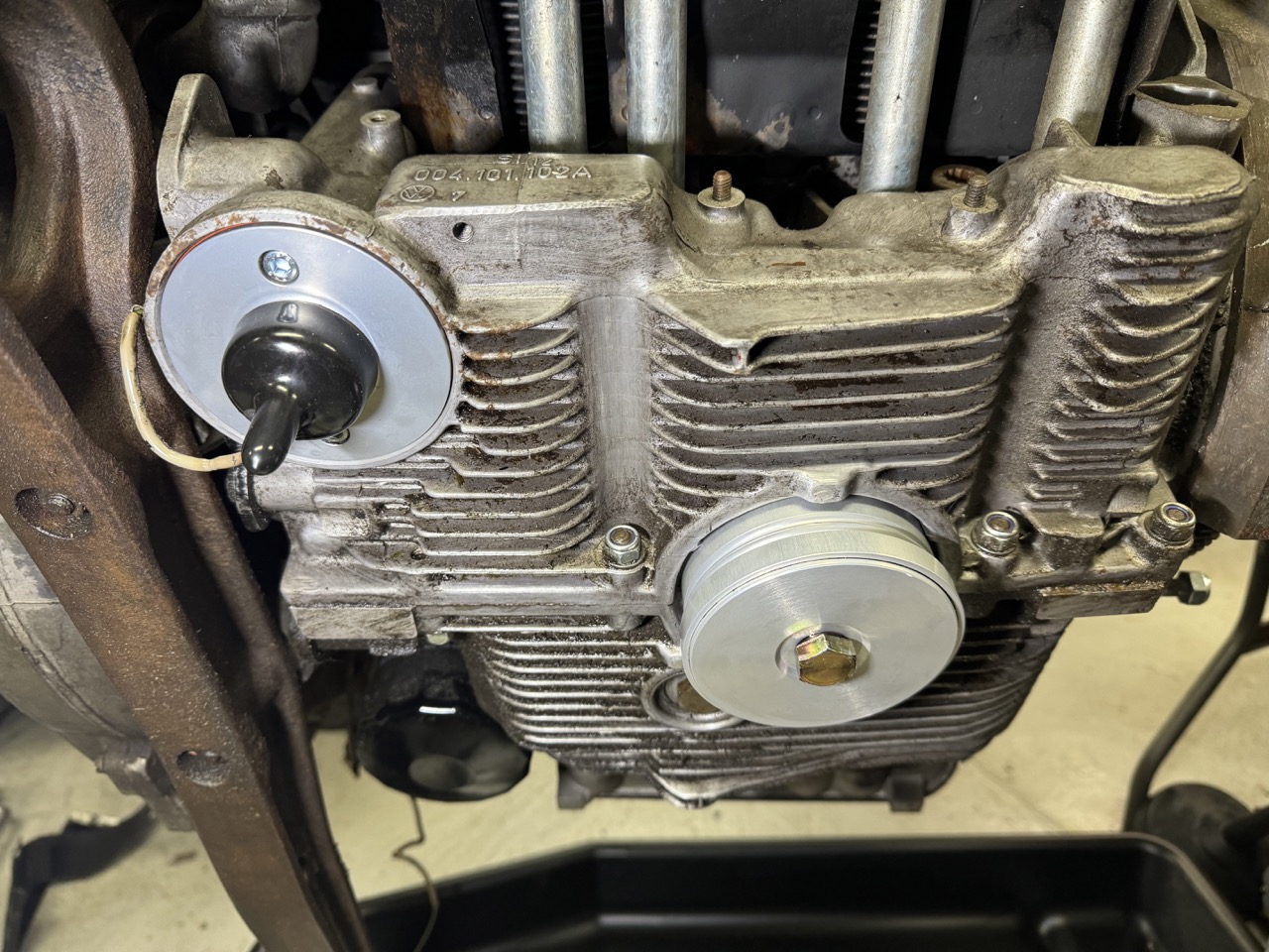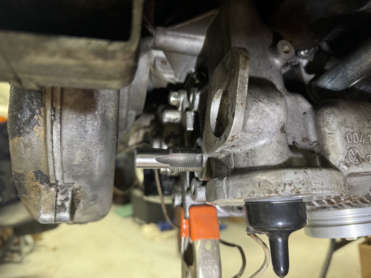 So, I removed the engine mount brackets and found the source of my leak: That is a straight-thread steel plug in an aluminum hole. From what I've been told, that's a factory part (smh). Anyway, the plug was a little loose, with only the factory stake holding it in -- it turned right out with almost no effort. FYI, the plug is 22mm with 1.5mm thread, straight thread (no taper), and is about 9mm thick. I asked for advice on the forum, and the general consensus was that a straight-threaded steel plug was not really the right part for the application. But, no one makes a direct-replacement aluminum plug. The options came down to either a brass plug or make my own. @bkrantz linked to his thread where he faced the same issue. He ended up going with a brass plug, but @Shivers had added a link to a place selling aluminum flange plugs with the right thread. That seemed like a promising path, so I ordered a few (one to use and spares, just in case). Here's what arrived, next to the original plug: I cut the head off and the finished result is the same thickness as the original: I wasn't sure what sealant to use, but someone had suggested Loctite 574, so I ordered a tube. Of course, I only found it in 50ml tubes and larger, so I now have plenty of extra.... I also ordered a cheap tap, which I cut down to clean the old sealant out of the threads the hole. I tried a few different solvents and cleaners, but the tap was the only thing that worked to actually clean the threads. Yes, I know I could have removed the fan and ductwork off the front of the engine, but I was trying to minimize the amount of stuff to be removed and reinstalled later. And, just to help my odds of sealing, I put the new plug in the refrigerator and put a heater on the engine. Note that the engine is tilted over. I also put a 2x6 under the front of the engine stand. This positioning helped keep that last little bit of remaining oil that never completely stops dripping from running forward into the threads. After about 1/2 hour of heating/cooling, I used a q-tip to apply sealant to the hole threads and also applied some to the threads of the plug. I then screwed the plug in as tight as a I could without risking the remaining hex in the plug, so maybe 10-15 ft-lbs or so -- this is tighter than the original plug was, and the sealant should keep it stuck. But, just in case, I also staked the plug, like factory. Hopefully, that's the end of that leak. |