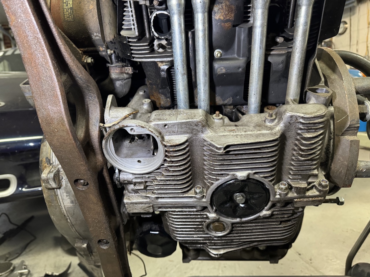 Given the history of everything else I've found with the car, I decided to go through the engine before reinstalling it. I got as far as taking the accessories and shrouds off of it, and found plenty of issues.