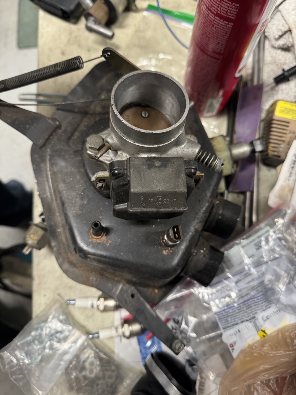 Given the history of everything else I've found with the car, I decided to go through the engine before reinstalling it. I got as far as taking the accessories and shrouds off of it, and found plenty of issues. So, here's what I started with: As previously mentioned, someone put a fuel pressure regulator where the decel valve was supposed to go (and also left the small vacuum line open to atmosphere). I found more kinked fuel lines: All four of the injector fuel lines were like that. And, once I got the shrouds off, I found this: Can anyone tell what's wrong with this pic? I'll give you a hint -- there's no thermostat. That "flap" is on the wrong side of the tabs. The way it is installed, it can never move. Probably done to make sure it didn't move because of the missing thermostat. |
