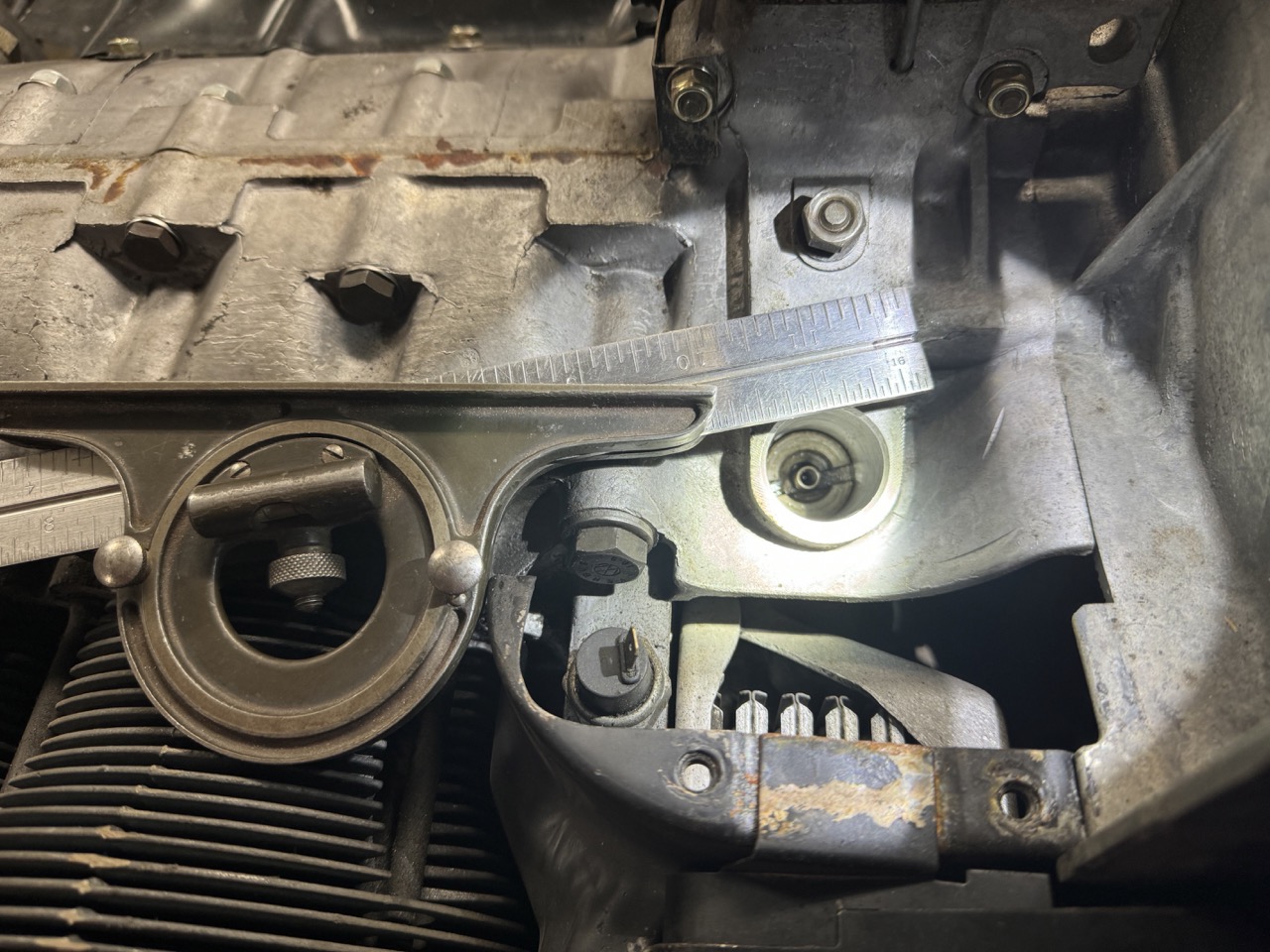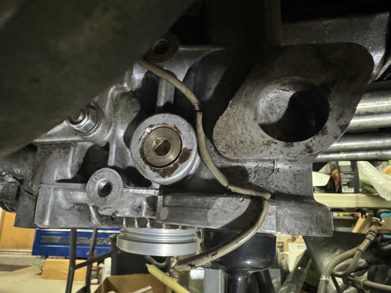While the engine was just sitting on the stand, waiting for more parts to arrive, it dripped a few drops of oil into the pan underneath. This seemed a bit odd, since I had already drained all the oil out of it. To try to find the source, and make sure it wasn't one of my new additions, I grabbed a pointer and hung it from various points under the engine to track the drip back up to the source. The drip turned out to be coming off the left engine mount bracket, which continued the seeming oddity, since the bracket bolt holes are not through holes.