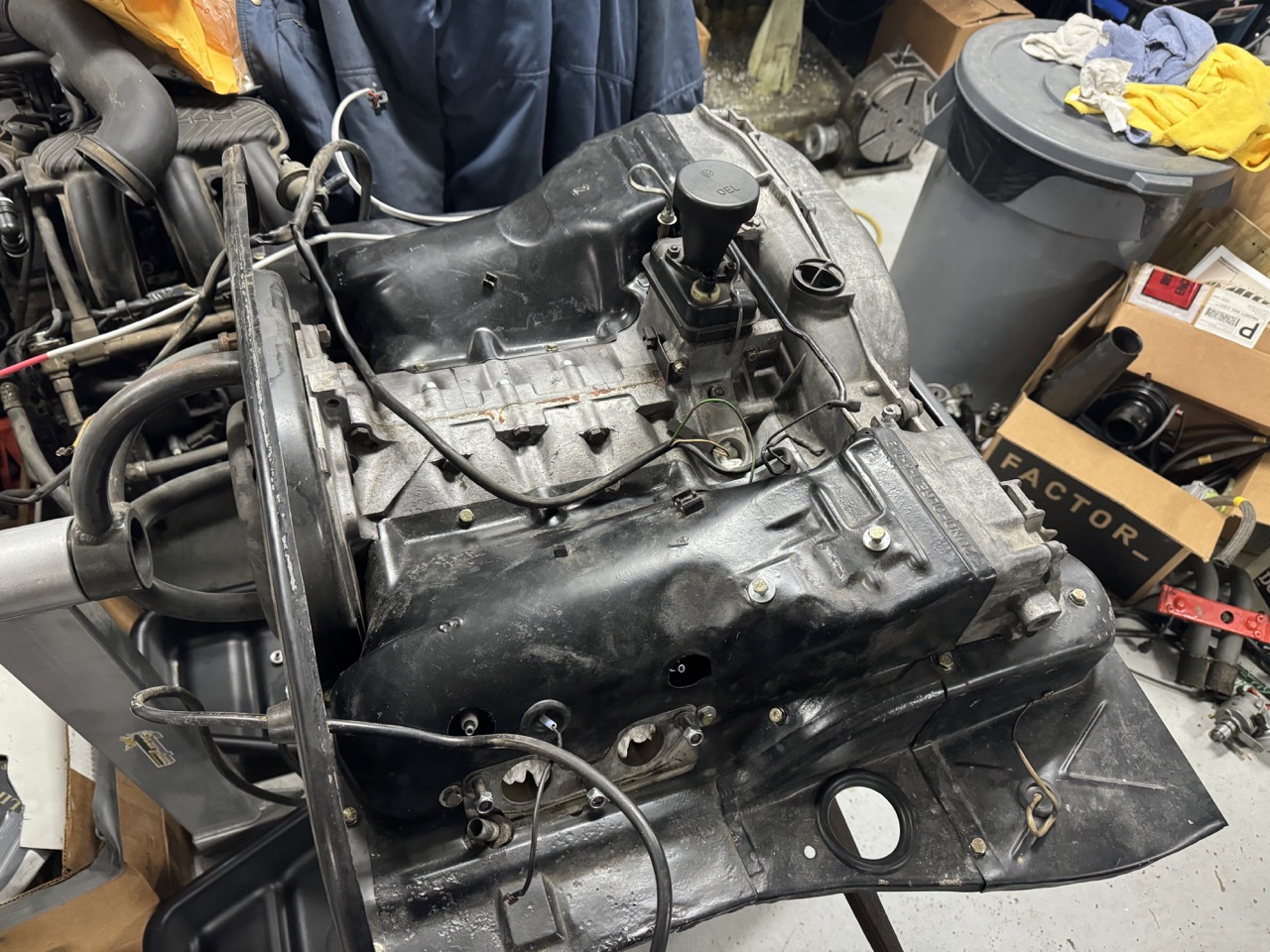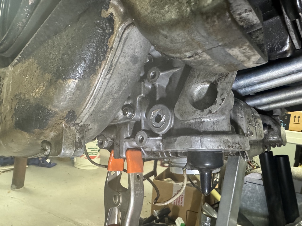 It turns out that a long, slender pair of c-clip pliers work great for pulling the distributor drive. Also, I rotated the engine on the stand so the distributor drive was exactly vertical, so the thrust washer under the drive wouldn't move around and fall into the case. Also, I just installed an old 012 CHT. I'm still trying to find a good, used 017 CHT at a reasonable price, and the car came with a generic 012, so I'll try this for now. I also discovered there's an oil leak somewhere on the front of the engine, so I'll be pulling the front shroud pieces back off and probably the engine mount bar too. At this point, it looks like the leak might be from the bolts that hold the mount brackets to the engine case. |