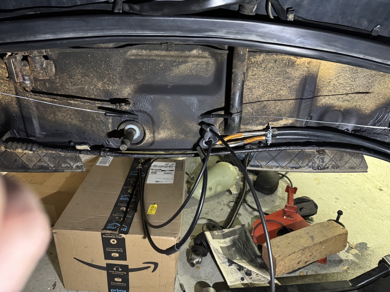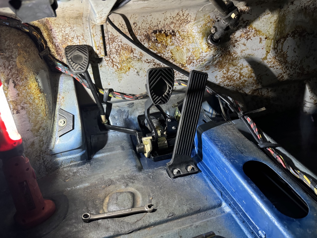 Got a little more work done on the car. Installed new clutch, gas and heater control cables. Also installed the rebuilt pedal cluster, new gas pedal, shifter and shift rod (front half) and heater control lever. Since I marked the shift rod on the shifter before I took them out, the shifter should be fairly close to the proper alignment, but won't know for sure until the engine and trans are back in.