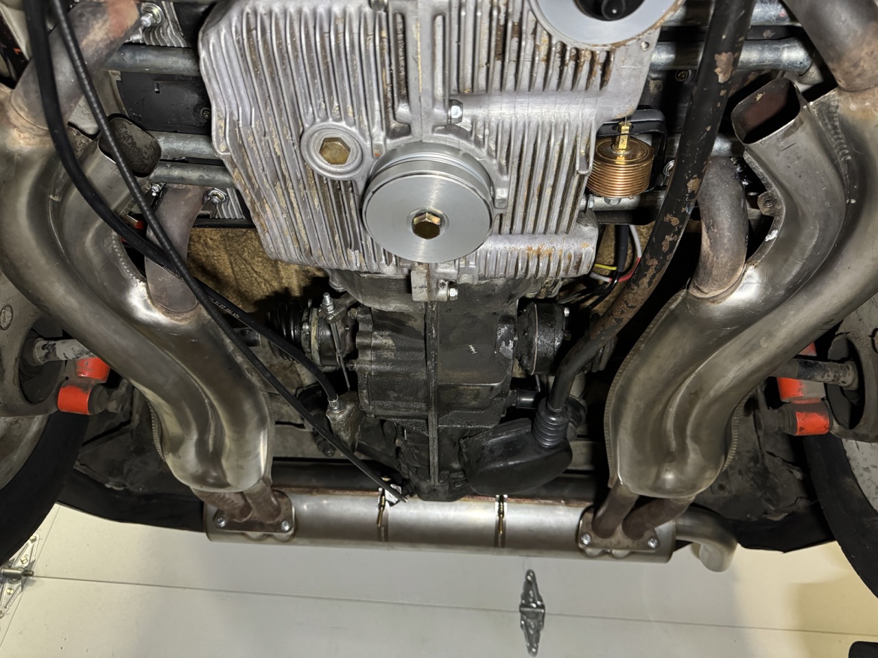 Axles, clutch and speedo cables connected: I used new bolts with new schnorr washers to attach the CVs, plus a little blue loctite. They should hopefully stay tight. Then, shift linkage with all-new bushings, heat exchangers and brand-new Quiet 2.0 muffler from Ben: The heat exchangers turned out to be a much bigger pain to install then expected. Whoever had these before had cranked down on the ears and bent them out of shape, none of the ears would fit over the exhaust port studs. So, my son helped me heat the ears as I reshaped them to fit. I've had the muffler for years, bought it when Ben was having his getting-out-of-the-4-cyl-muffler-business sale. Was a bit relieved when everything bolted up just as it should. Only (minor) concern is the muffler tip is a little close to the valance (no contact, but only about 1/8" gap). I suspect this is because I put new rubber trans mounts in, and expect the gap will open a bit as the mounts sag over time. |