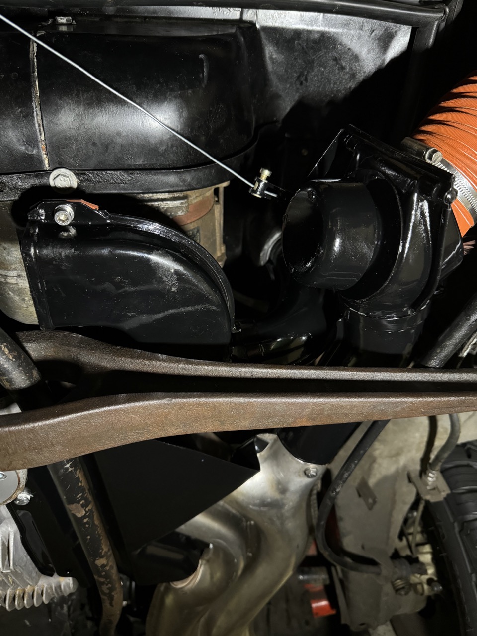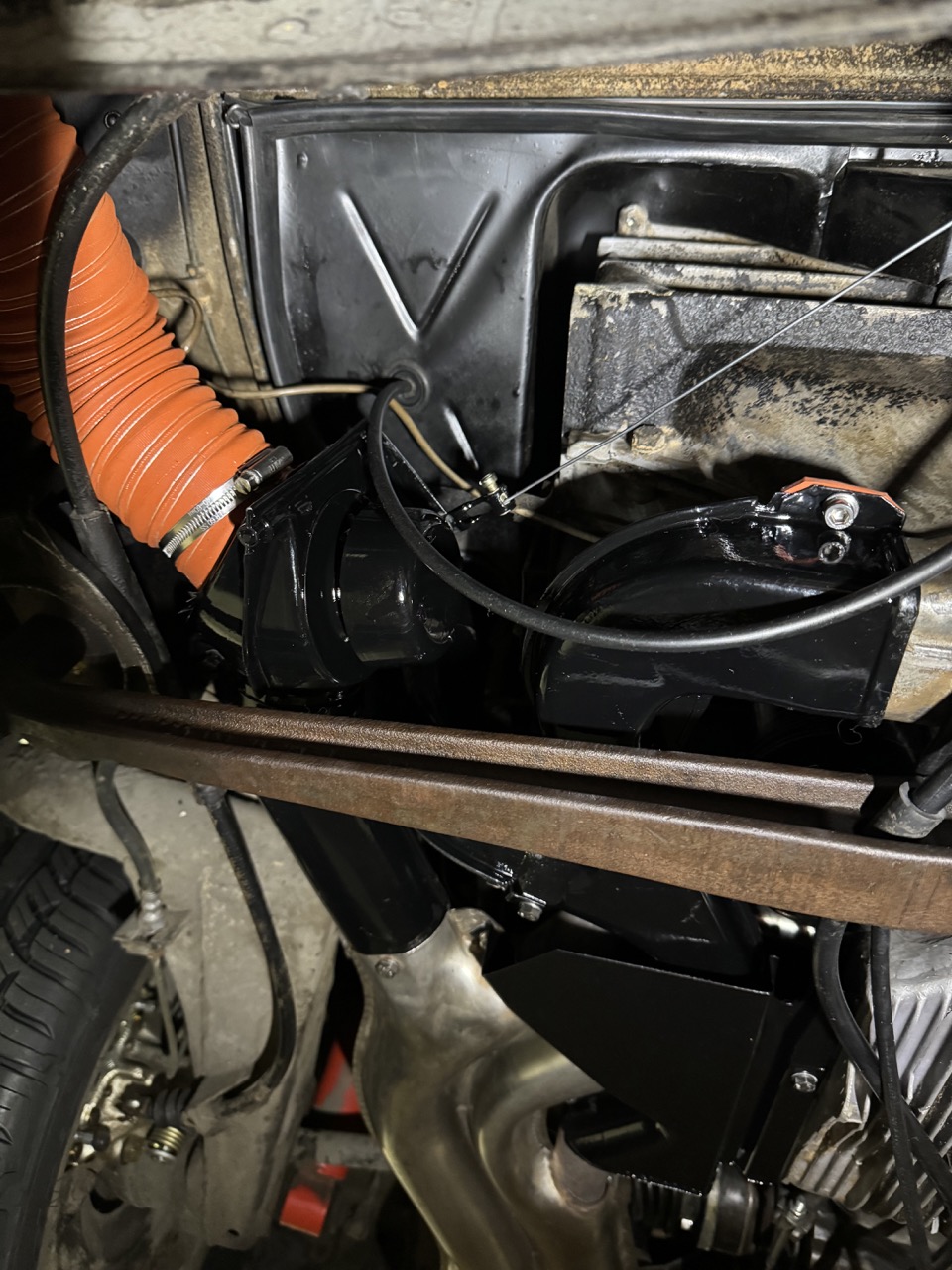 Since then, I cleaned, de-rusted and re-painted the sheetmetal heat ductwork. I media blasted the worst of the rust off the parts and then soaked them in B'laster Metal Rescue, which is their copy of Evaporust. The stuff is nice because it won't eat the metal once the rust is gone, but it takes a long time, is rather expensive and doesn't last as long as one would hope -- I went through 3 gallons before everything was clean. Turns out I had already scrounged up and stashed away all the sheetmetal needed, except for the flat-ish guide plate that goes above the shift rod. Fortunately, AA had new repros in stock, and it needed only minor tweaking to fit (had to move a couple of holes). I also connected the heat control cables and the hoses to the body ducts. Here are a couple of pics of the finished job: |