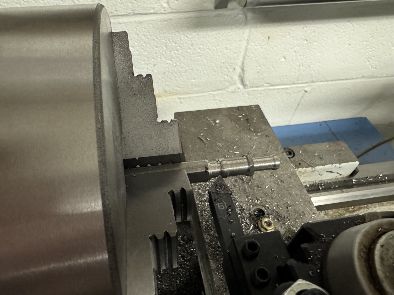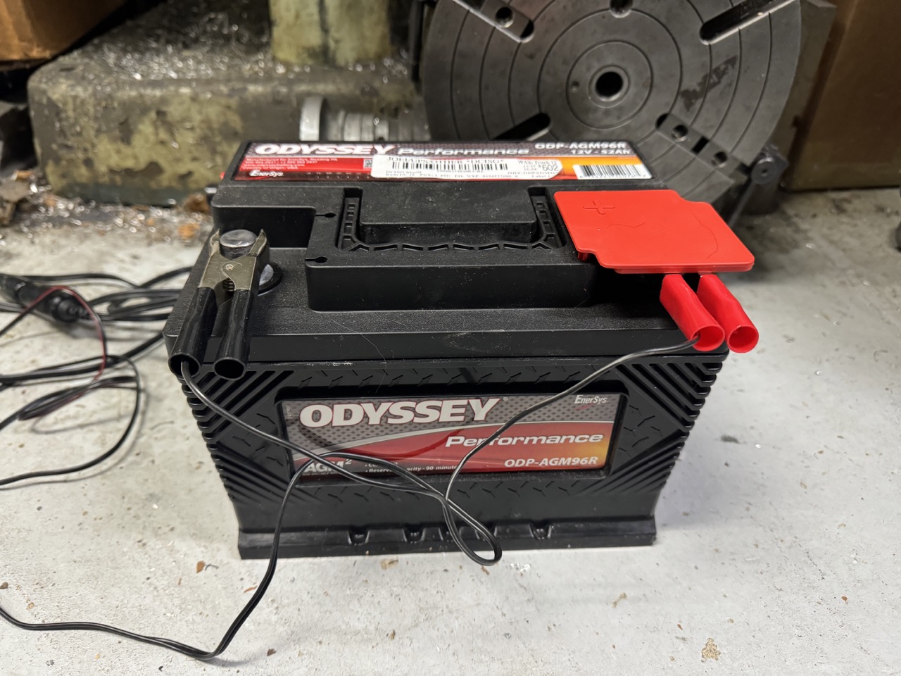 I did make one change to the hoses. Originally, I had cobbled up some brass fittings to go from the 3/8" tank outlet to the 1/2" fuel pump inlet. This time, while I had everything apart, I decided to make an adapter out of a piece of 303 stainless I had left over from a past project. Here it is just before cutting it off: Here's the reinstallation, before putting the tank back in: Just a little annoyed that I spent two days getting back to where I was before I started. (IMG:style_emoticons/default/headbang.gif) And, since it seems like I'm actually getting close(-ish) to starting this, I ordered a new battery: Decided to go with AGM, even though it was twice the price of flooded. |
