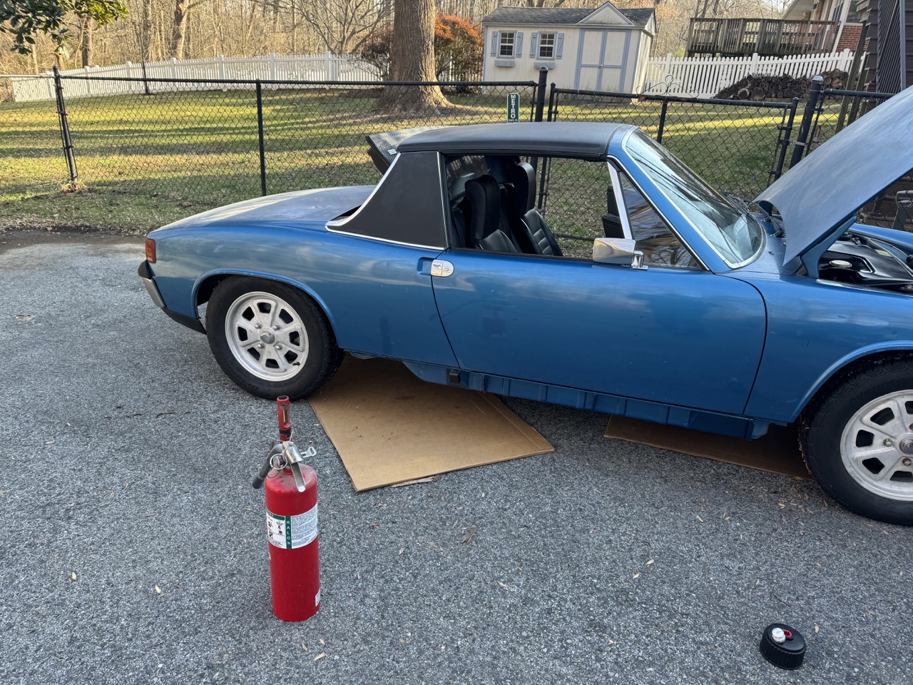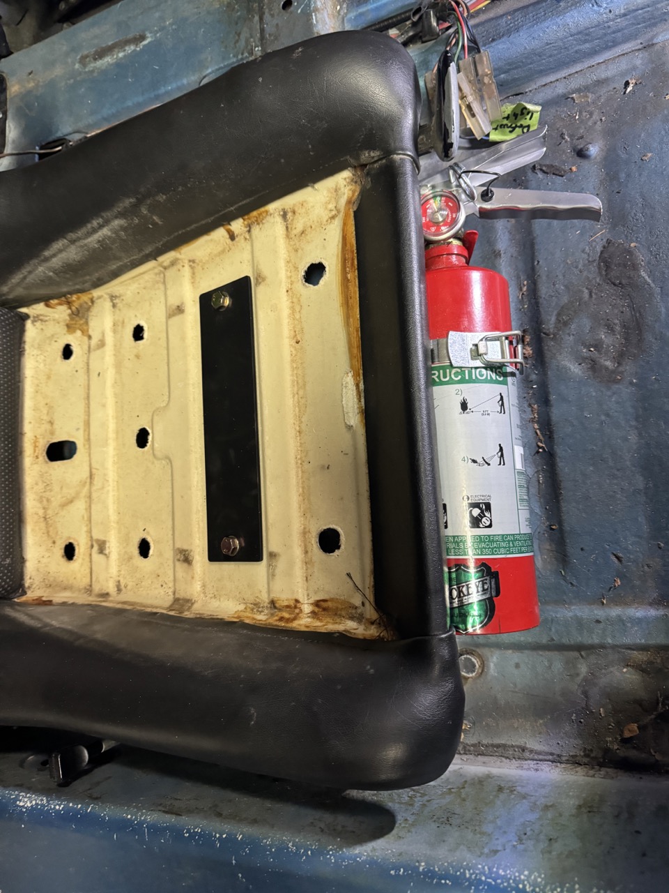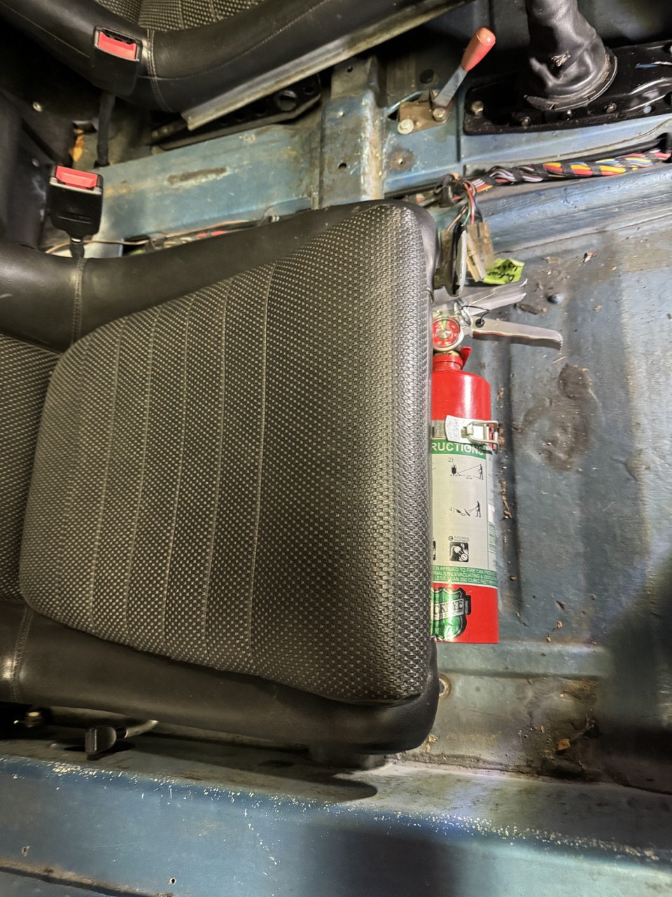 First was installing the new seatbelts from seatbeltplanet.com . Decent kit, mostly plug&play, but did require some modifications. First, a few of the mounting holes needed to be opened up a little to use the stock mounting bolts. The bottom seat belt tabs needed to be opened just a little to fit the plastic bushings. And, the center latches needed to be drilled out as well; 14mm would work, but the 9/16" drill I had was close enough. Second, the kit does not include the bent wire guides that are used on the stock seatbelts. These guides are important because the space the seatbelt reel away from the firewall, and they also keep the belt from rubbing. While I could have cut the old belts to get the guides off, there's no way I could have gotten the guides onto the new belts without modification. So, I modified them. (IMG:style_emoticons/default/happy11.gif) I used a cutoff wheel in the dremel to slice through the factory welding. Then, I was able to spread the guide to get it off the old belt and onto the new belt. Once that was done, they mounted just like the stock reels. And, after it was all done, it looks pretty much stock. Only difference is the new seatbelt latches don't have any wiring. Unplugging the old latches had the effect of disabling the warning buzzer, so I'm okay with that. I could have used the new belts with the old latches, but the catch tabs didn't fit very well into the latches, and the old-style side release buttons are supposedly not very secure compared to the new-style end buttons. Then, I installed the fire extinguisher mount I got from Ben ( @mb911 ). Fortunately, this was a pretty straight-forward installation. I first mounted Ben's bracket, then I placed the fire extinguisher on the bracket. Once the FE was located, I took the bracket off and drilled mounting holes for the FE bracket on Ben's bracket. Then, everything bolted into place. |