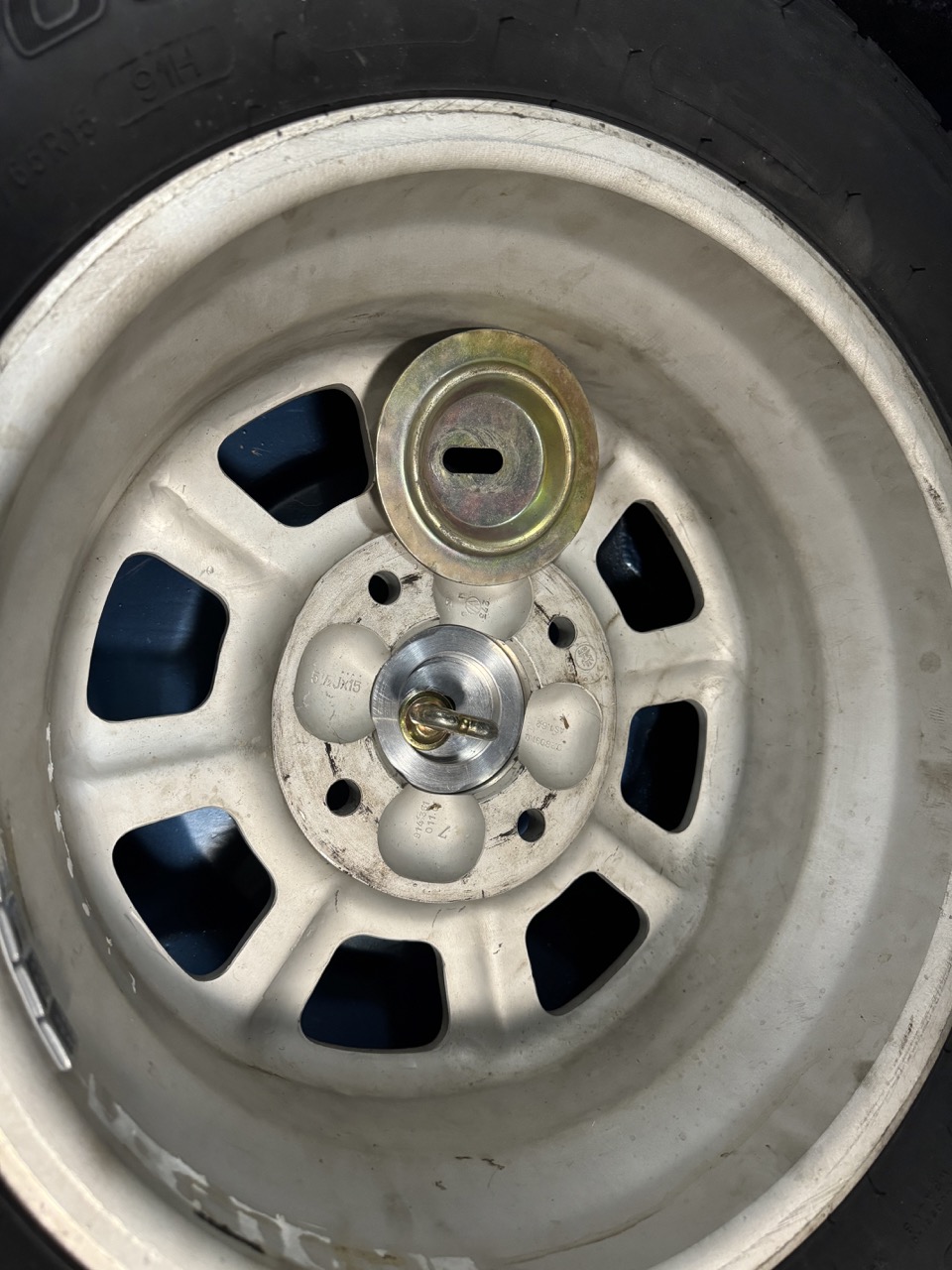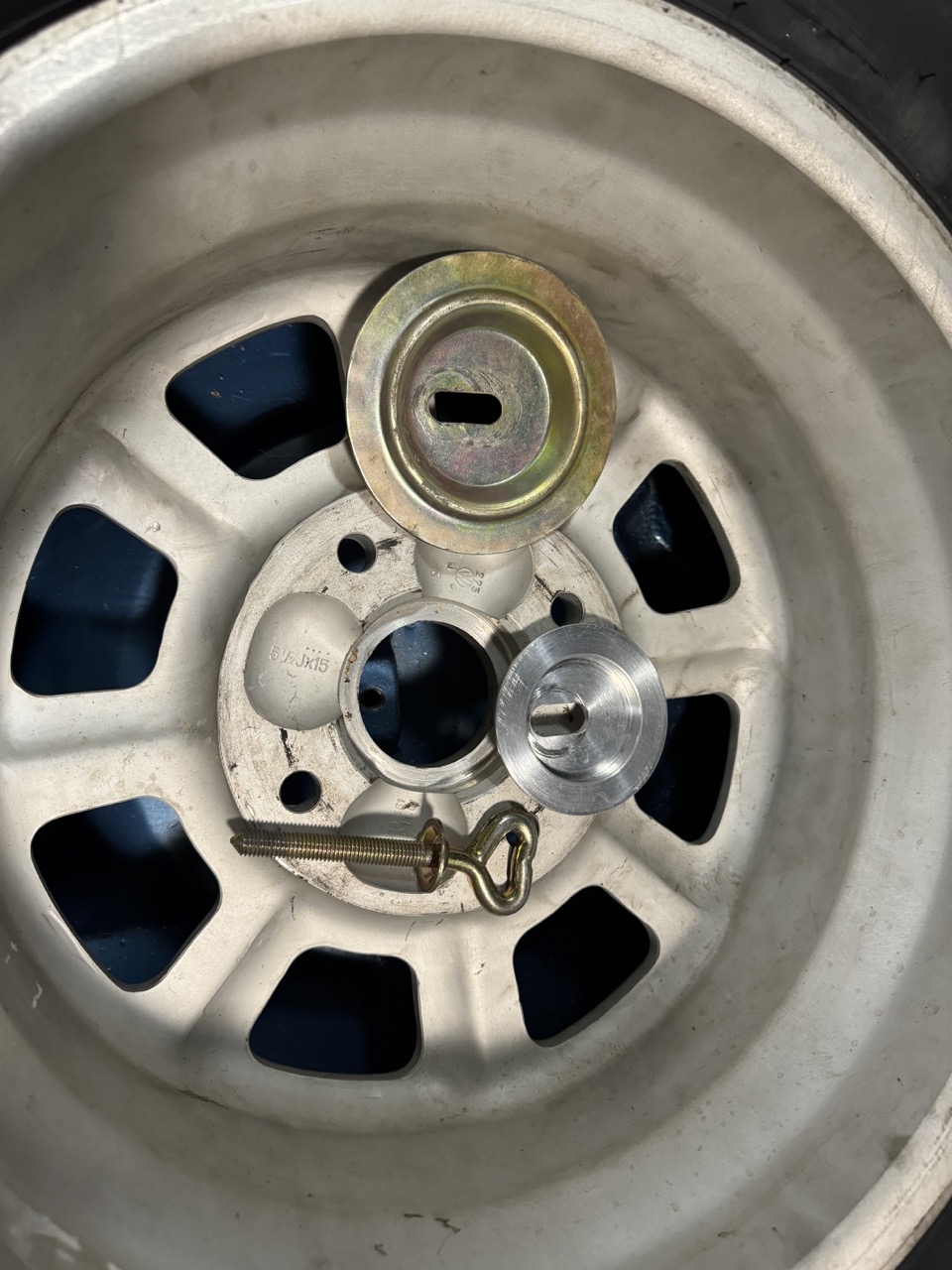 Shortly after I got the car, I bought 5 new 195/65R15 BF Goodrich tires. Nice tires, but noticeably "fatter" than stock tires. Being fatter, the hold down screw for the spare no longer reached the thread at the bottom of the spare tire well using the stock hold down plate. My options were getting new tires before these wear out (not gonna happen), making an extension for the screw, making a longer screw or making a new hold down plate. I chose the latter option. I used a hole saw to cut a piece out of some 1/2" aluminum plate I had. I then turned it down in the lathe and finally cut a slot using the mill. The new plate drops the flange surface about a half-inch lower, allowing the screw to reach and hold the tire down. |