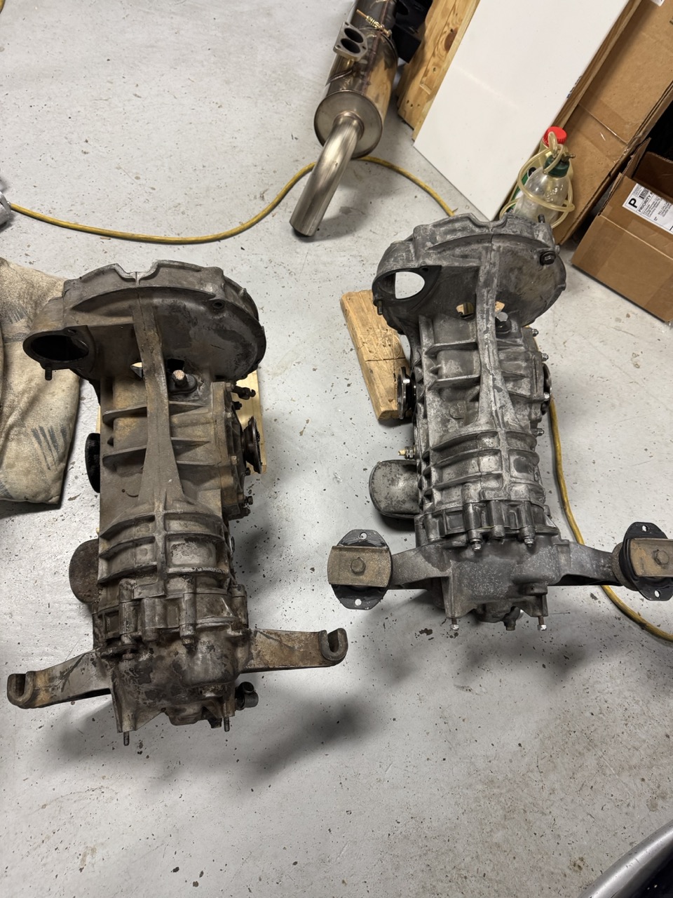 Since I was working alone, I only got one pic, of the old trans next to the "new" one: The new one is the one on the right, with the rear mounts already moved over. I'm about 90% done installing the new trans -- just need to hook up the shift linkage and reattach the muffler. |