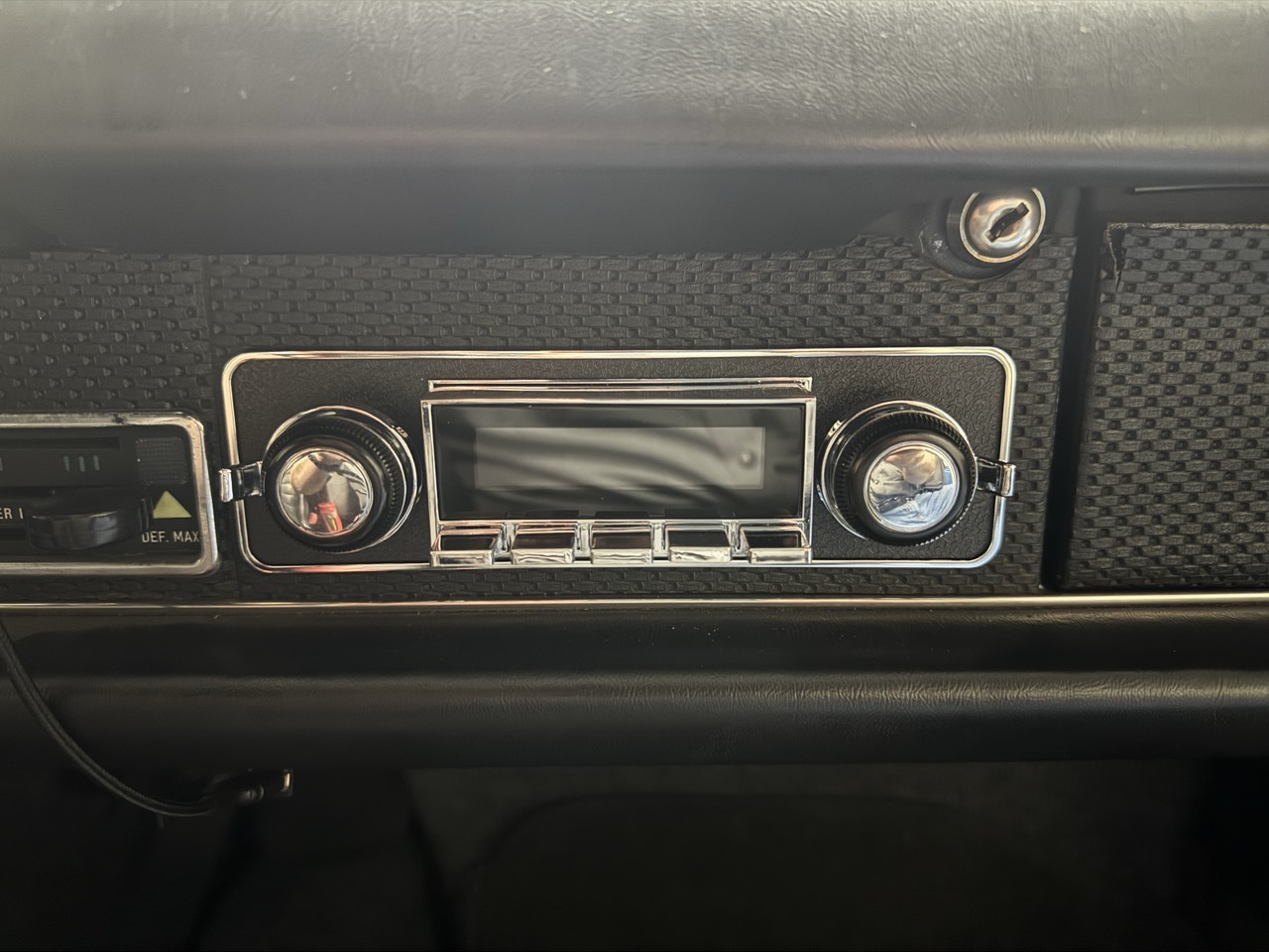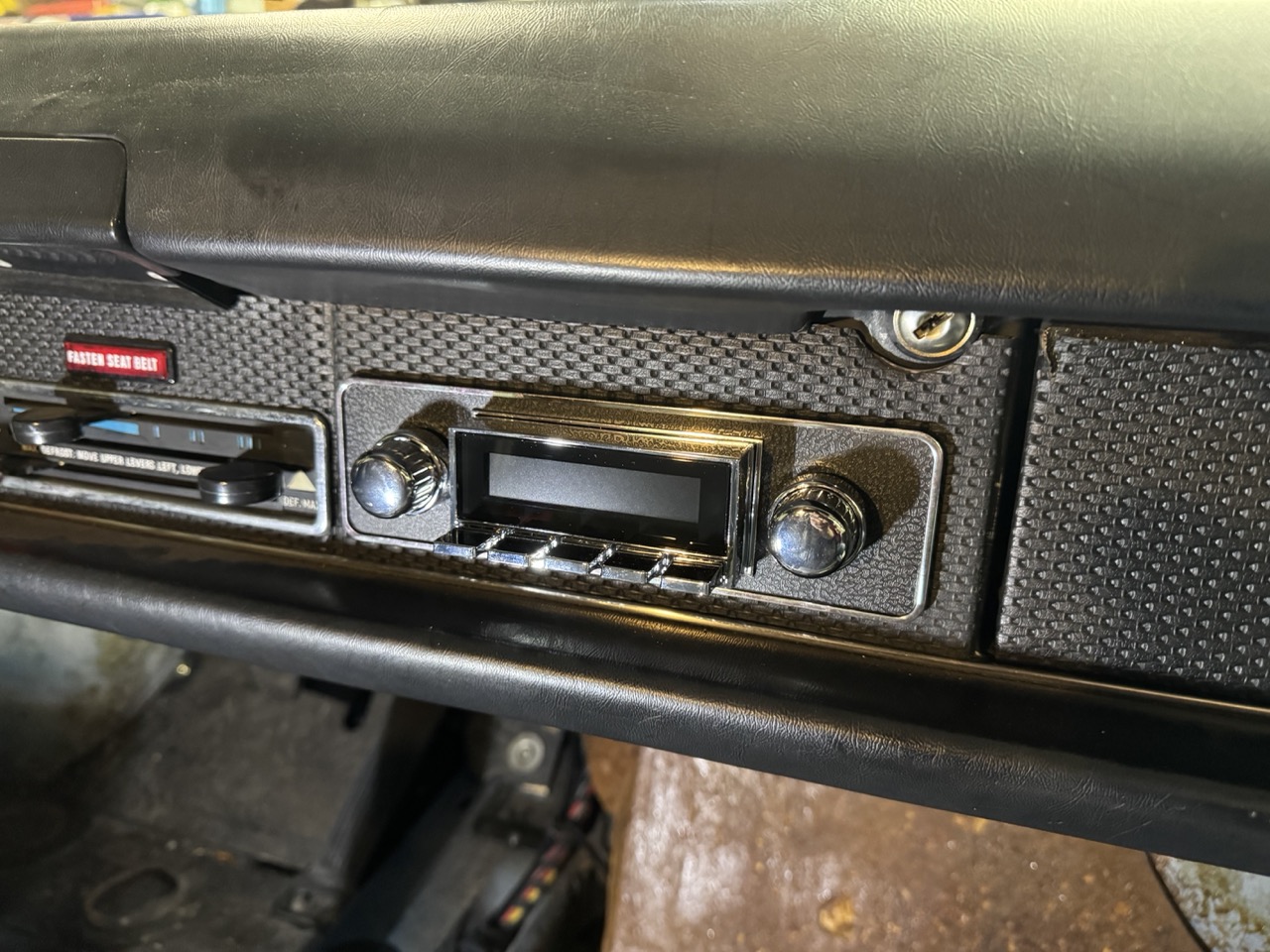 I finally made a panel to cover over the hole I made to fix the chiseled-out strip on the side of the center console. It's just a thin piece of sheetmetal held on with some butyl rubber. I also installed a RetroSound radio and matching speakers. It's nice to have tunes back in the car, and this also has bluetooth and a USB input. |