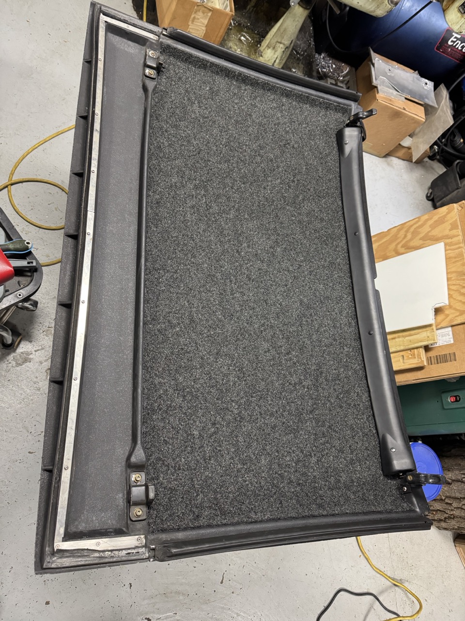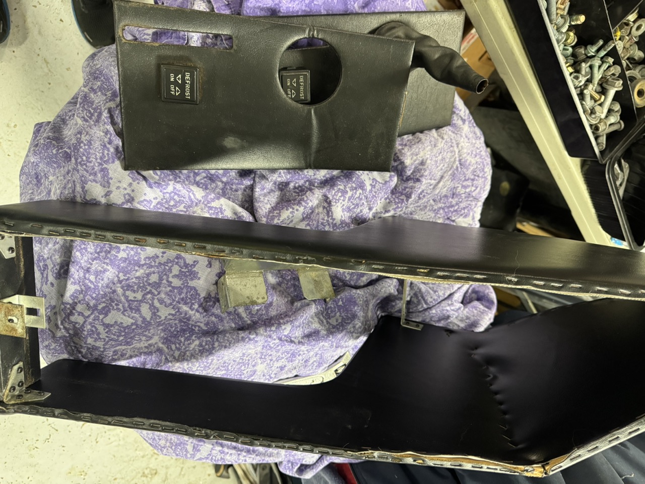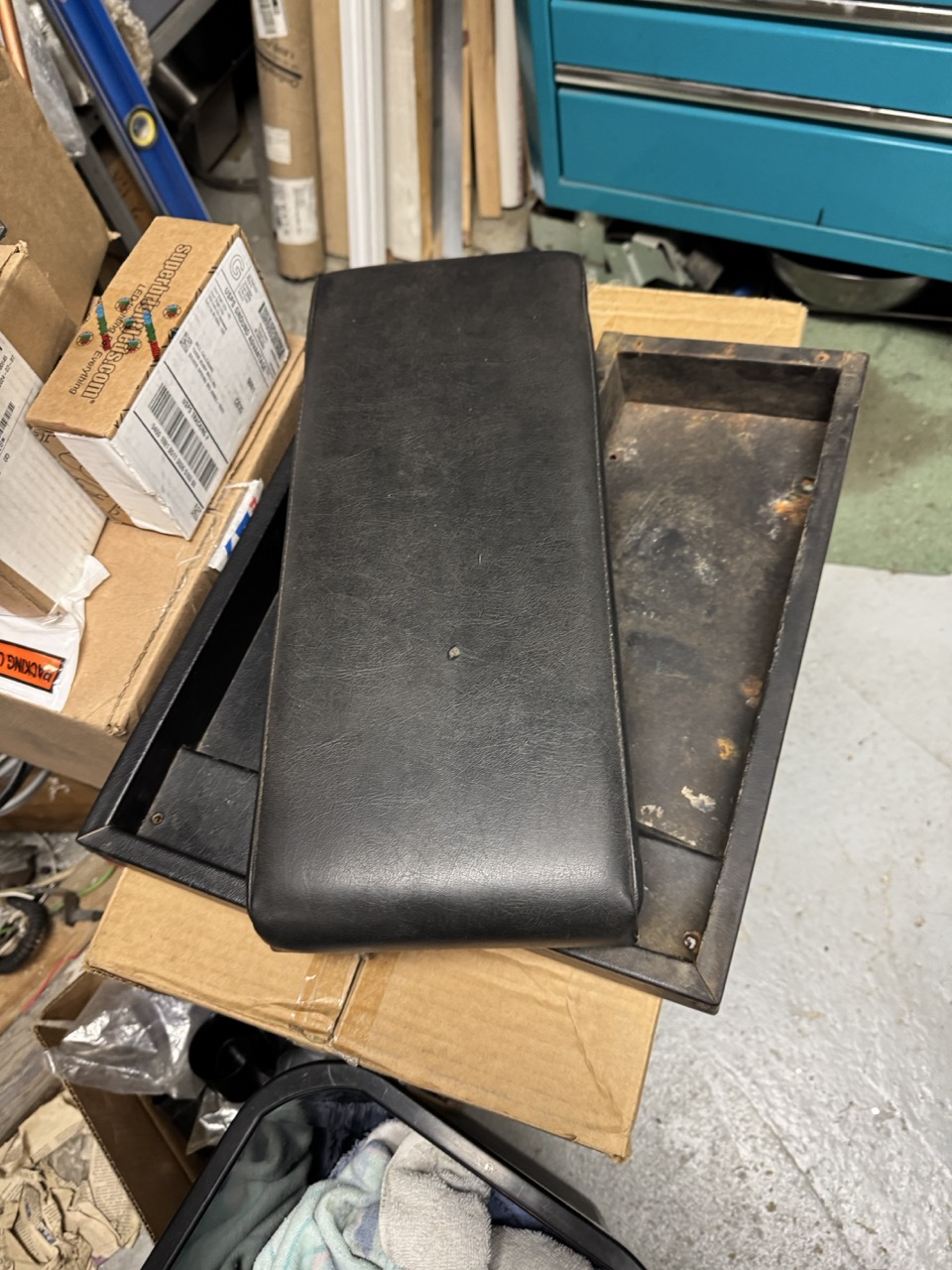 Here are the parts I had: I had already spent a bunch of time cleaning the top part before I took that pic. The hinge was completely rusted, so I ordered new stainless piano hinge from amazon. I also ordered #4 screws to go with it. The hinge was delivered yesterday, but the screws won't make it until tomorrow... so much for "prime".... (IMG:style_emoticons/default/headbang.gif) So I stopped at HD to get some #4 screws on my way home, and discovered that the holes in the piano hinge are too large for #4 screws. Fortunately, my neighbor had some #6 screws, because I really didn't feel like going back to the store again. Took a little bit to figure out how the hinge mounts, since it goes in backwards from what I expected, but it's all back together and in the car: Need to spend more time cleaning that top piece. It was really grungy when I started, and is finally somewhat presentable, but still looks a bit dirty. Next, I need to see if I can piece together a presentable front center console from these pieces: |