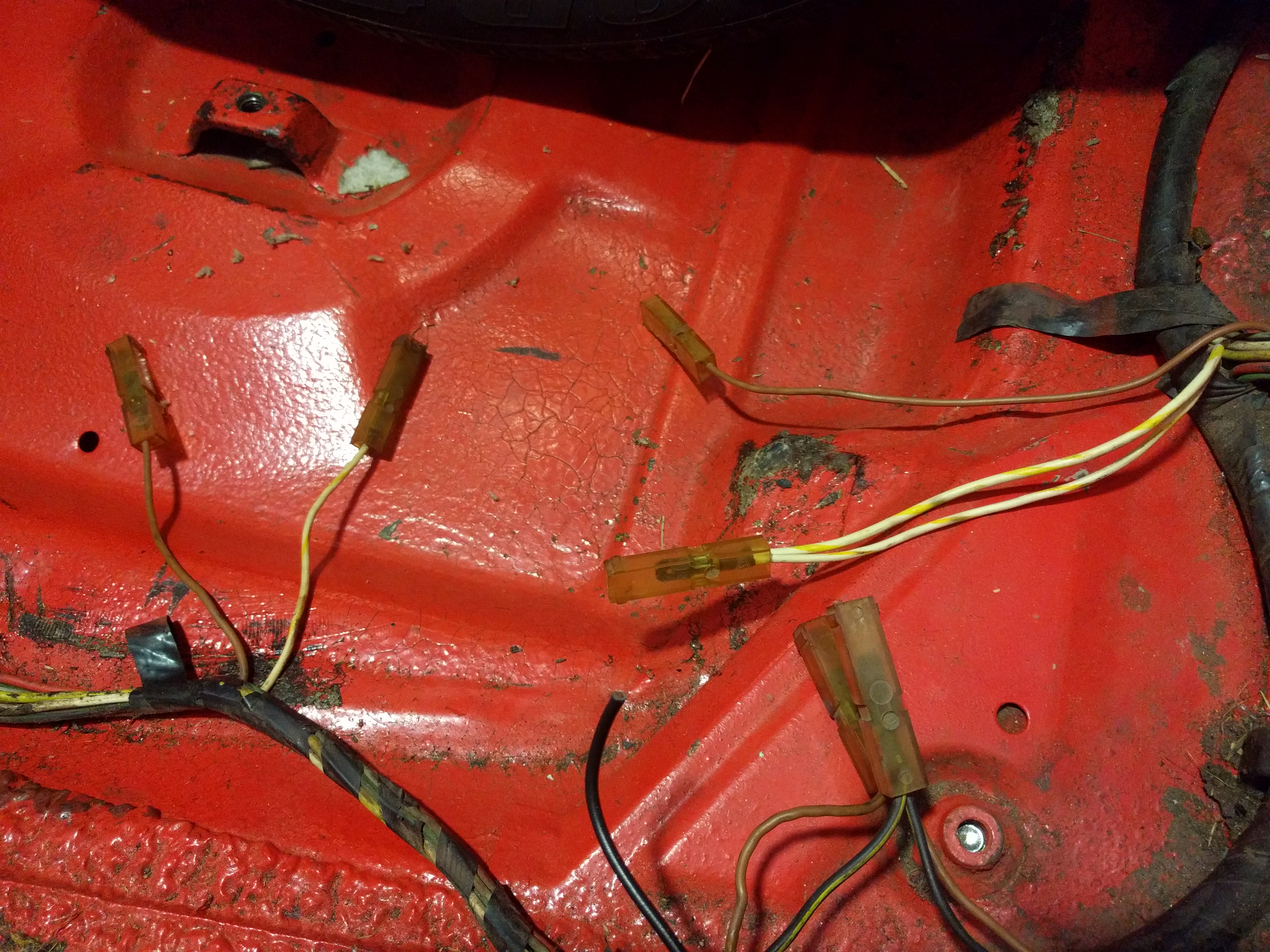 This is probably a simple job for most people but I struggle with wiring diagrams and I am color blind to a degree. Anyway, I have two rectangular fog lights in my bumper. The two wires for each fog light, one solid blue and one black/blue stripe, enter the luggage compartment through the front bulkhead. These are only a few inches long and not connected to anything. Which is power and which is ground? Next, the wiring harness has several unconnected wires. I am sure some of them went to the AC components (now gone) and this is where things get confusing. I have two single brown wires, one single white/yellow stripe wire, one dual white/yellow wire, one dual brown wire and one dual black/red stripe wire. Pic of the front left portion of the luggage compartment is attached. If I am reading the wiring diagram in my Haynes manual correctly, each of the single brown wires is "hot" and these are the ones I should use to power the lights. Is that right? Where do the ground wires from each light go? The Haynes manual says these are white/yellow wires. Should they ground to the body? Should they be connected to one another and then to the single white/yellow or to the dual white/yellow connector on the wire bundle? Any guidance would be appreciated. Thank you! |