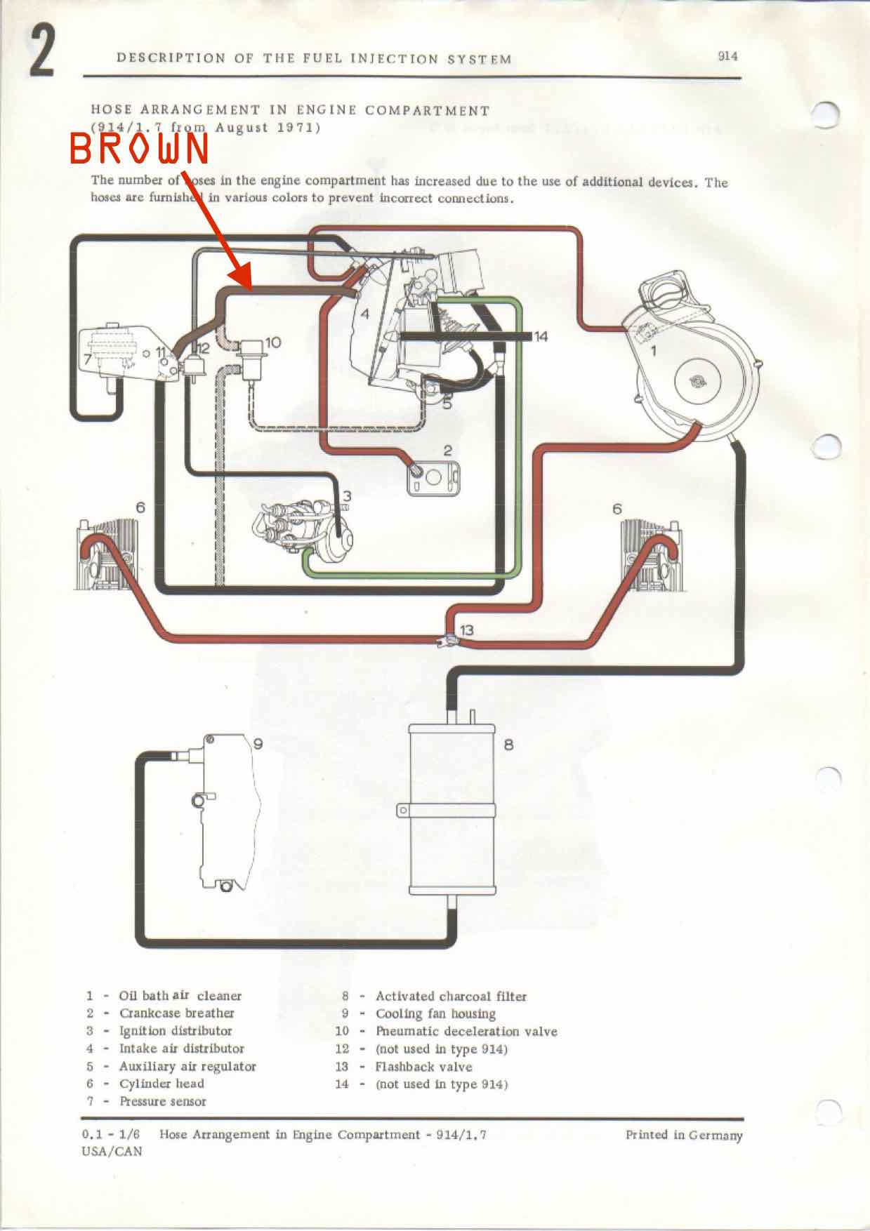 out of interest, does anyone know if the 1.8s originally had coloured hoses. or did they switch to uncoloured hoses with those? i think, and i mean i think, because it could just be you want to see it, that the vacuum lines on my distributor looked vaguely green still, before i replaced them last year, but it might be because i wanted to see green. if it was there it was so faded it was grey i saw green in. the rest of the lines were faded grey. and as far as i remember even when i bought the car they were grey color (31 years ago). i don't think any lines were replaced before i got the car in 89. but again maybe my memory is wrong. coloured lines were not something i knew about back then. they might have been a very faded red i thought was grey. red as a color in any form, paint etc, fades fastest of all colours. as to availability off the shelf, when you go to porsche themselves, where we sourced the new replacement hoses, its just black (or dark grey) hose. we went to porsche to get them given we are in aus - turned out to be easiest and was surprisingly, good value. @wonkipop Being an original 1.8 owner, the only colored lines on mine are green, to/from the vacuum canister. No red hoses. If you'd like, I could post a pic. that would be great starbear, thanks mate. yes, i've double checked mine and all i have is the one green line from the distributor, which we ended up keeping because porsche were unable to supply the size of hose. i didn't realise but my mechanic cleaned it right up and checked it before he put it back on and its looking really green again. but i have some other questions i will compose myself to ask specifically in relation to 1.8 vacuum hose arrangements and you might be the man to answer them. wonki. @wonkipop I stand self-corrected; looks like I have two green hoses. The first is off the vacuum cannister (passenger side) going to the throttle body (front side); see photo. The second comes off the T branch into the air plenum; see photo. The first I'm sure of; the second may or may not have been swapped out just because I had that size hose. I've also attached my hose diagram; the first is Line 4, the second is Line 10. This diagram varies slightly from Jeff Bowlsby's and Automobile Atlanta's diagrams; perhaps as Porsche modified things throughout MY 74, probably for emissions, it seems like the hoses and layouts changed. With this arrangement, "Frogger" has been running flawlessly; if anyone sees obvious error(s), just let me know - always willing to listen to those more expert than me! Hope this helps! ![]() |