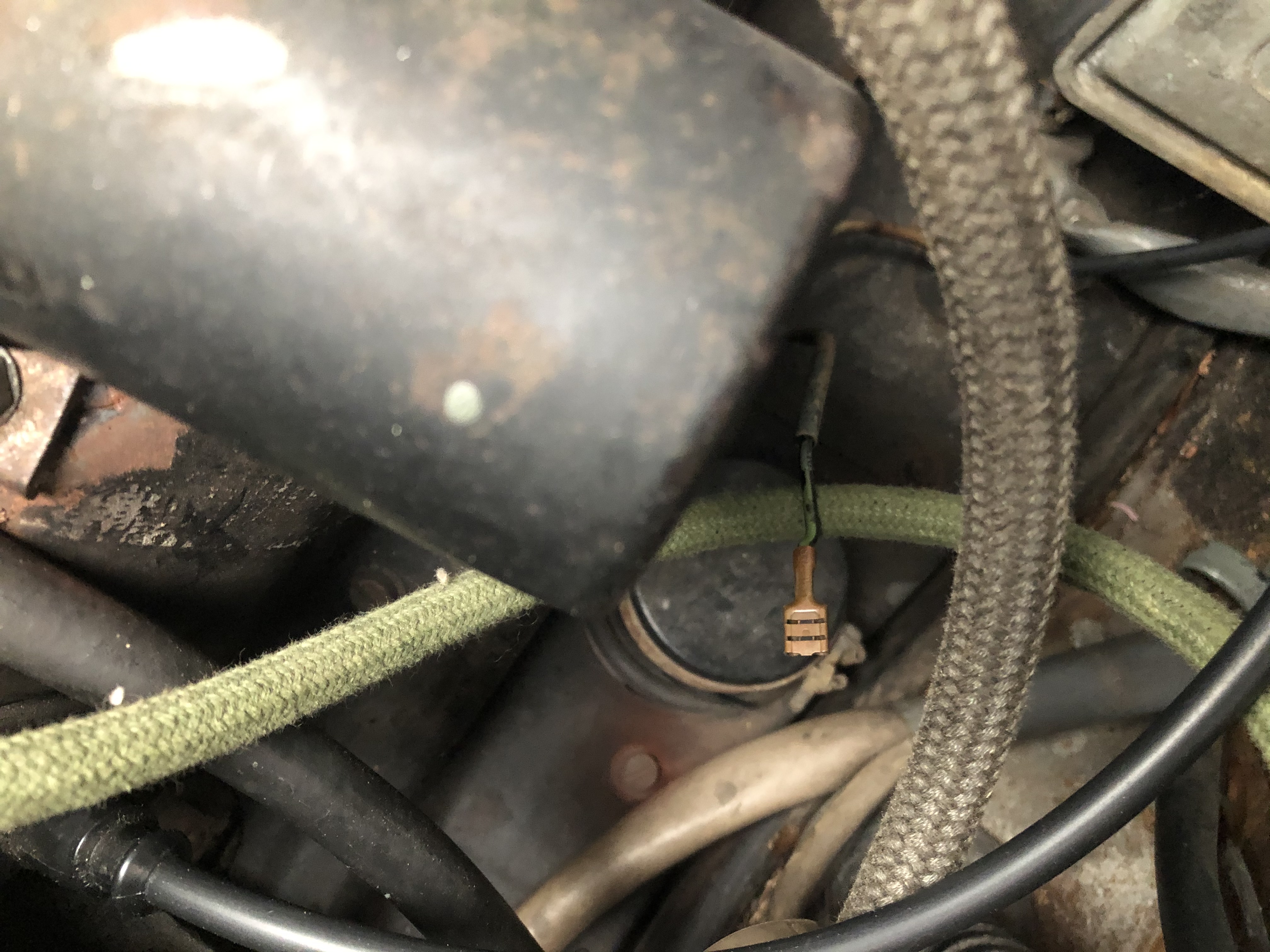 It's in the engine compartment, below the battery. What year is your car? '73 just finished replacing fuel pump and redoing fuel lines, hot as hell in the garage today....I'm exhausted...so had very little energy left to find the wire. charging battery now. I'll peek under battery when putting back in car. this wire provides the info to the temp gauge on console? was functional a month ago when last drove, so assuming I just knocked it off while replacing pump and working with pump power connection. Yes, it's a green/black wire for the temp gauge. It's a clear single spade connector body in the engine compaartment |