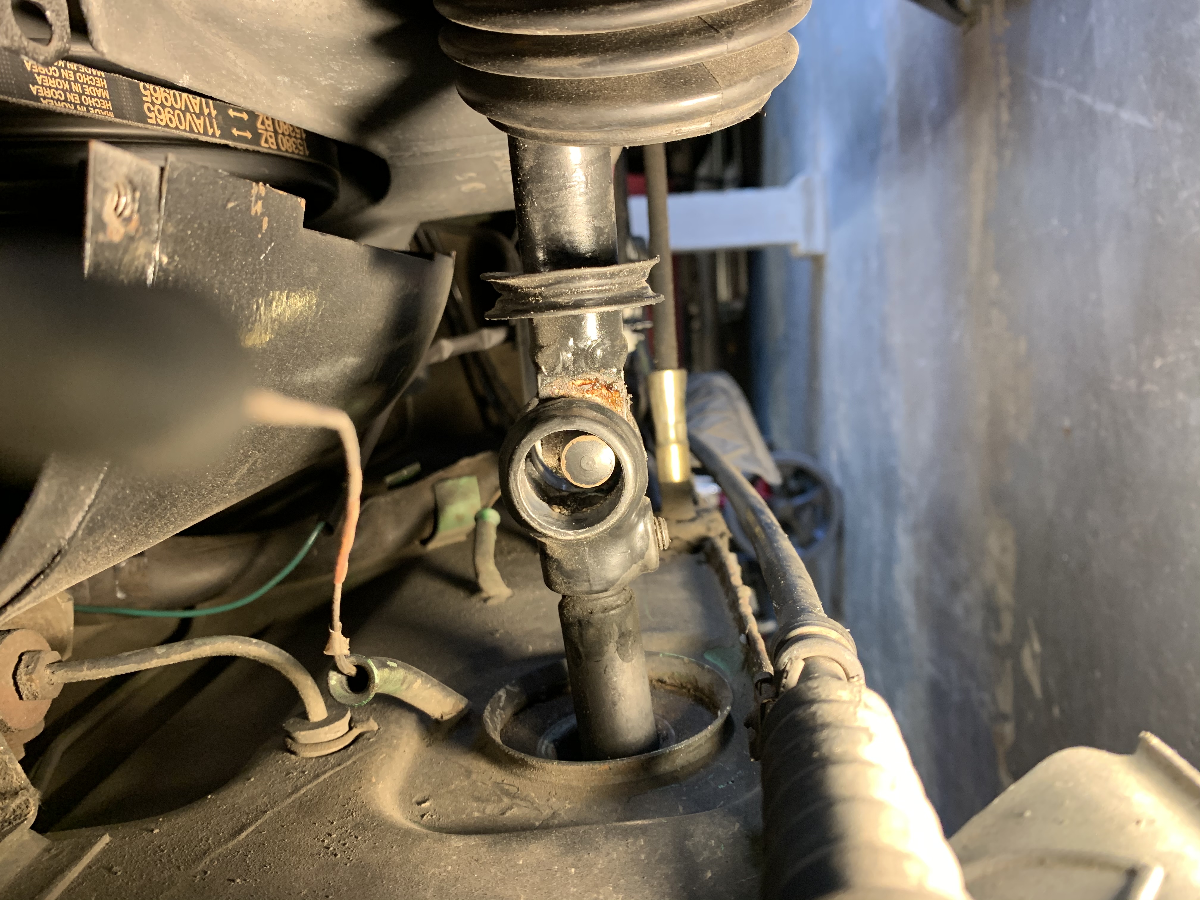All back together, new universal bushings and firewall bushings, thanks to Rich at High Performance house, he also suggested boiling the firewall bushing, that worked like a charm. Fan shroud also attached...so that was what was making that racket... Shifts precise and solidly, what a difference. Another tip from Rich was to not press in the bushing pin against the universal joint metal frame as it's not strong enough to take the force, only push on the pin and the rubber bushing.