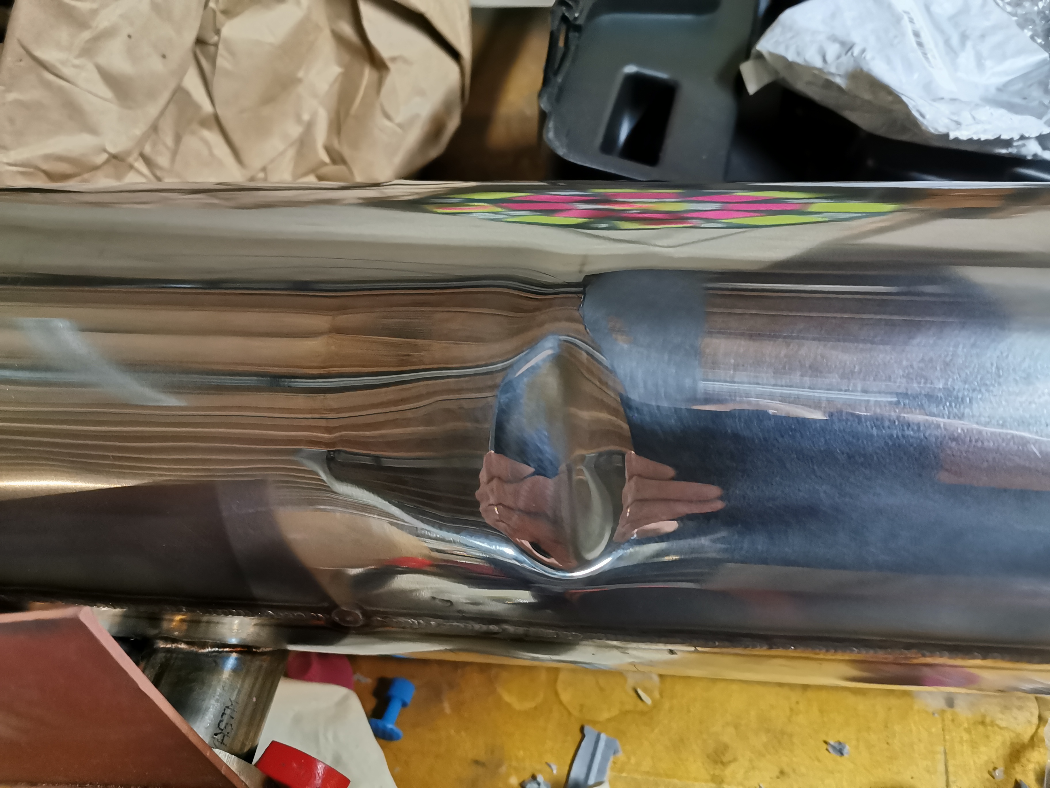 Ben sent me PDR kit which arrived yesterday. I also picked up a similar kit at Eastwood along with some stronger TabWeld Glu sticks and slide puller to augment robo puller. After spending several hours and dozens of pulls, including some pretty strong ones, I think it is about as good as it's going to get without going to a next level which could do more harm than good (stud welder, glowing red heat, etc). I also was able to apply about 25 psi of pressure to the inside. I would say it is some improvement at this point. Reduced the length of the dent to about 2.25" x 1.25", it now looks much like a teaspoon (although I guess it looked similar with a sharper crease before). Perhaps one of the metal masters here has ideas to further reduce it. Getting to it from behind is not an option. On a plus side, I do doubt it will effect sound or performance. Likewise, it *might" not be visible once installed (I have not yet removed old muffler to try fitting). On the other hand, it's still a noticable blemish :-( Ideas welcomed. ![]() Thx |