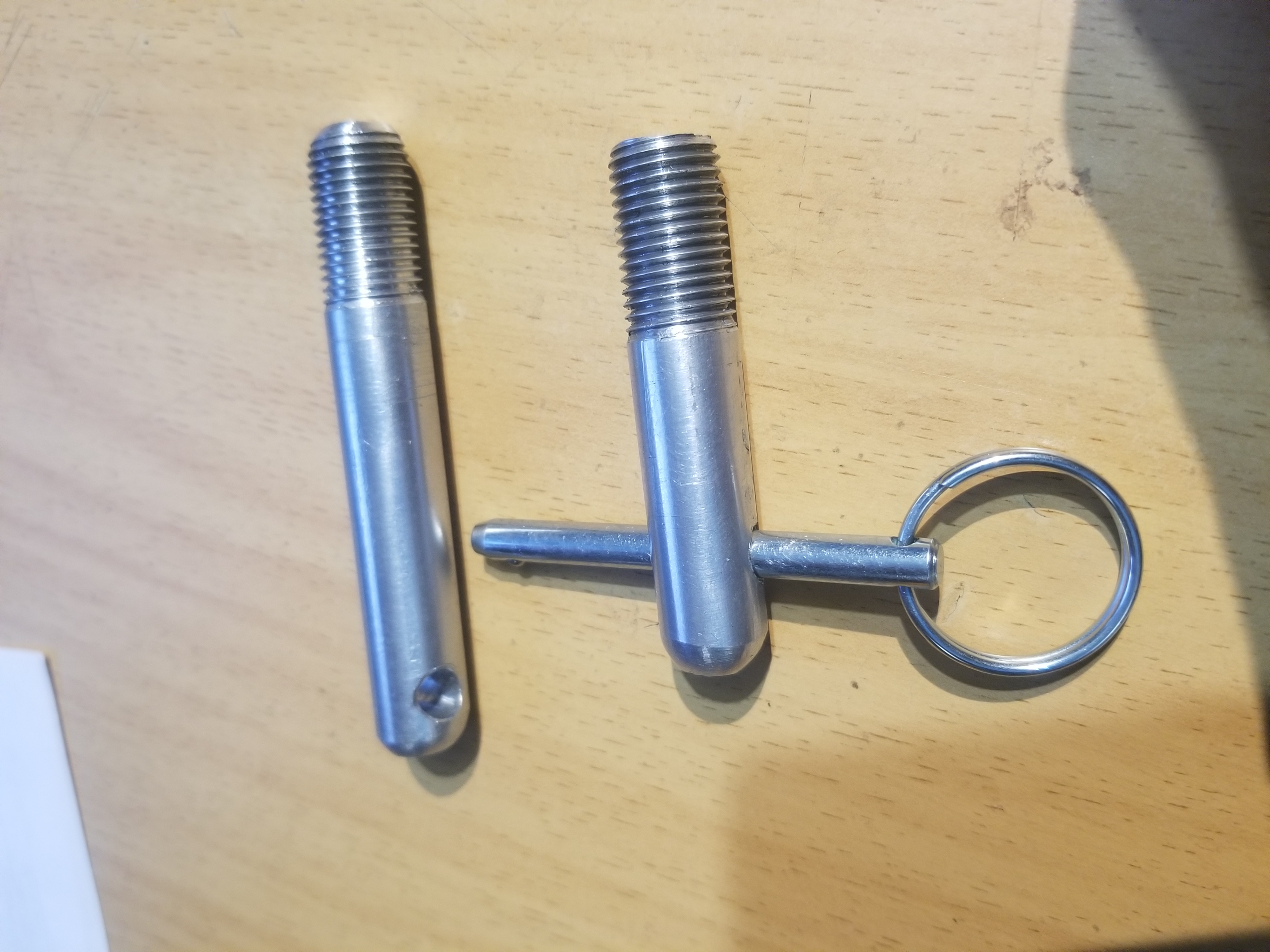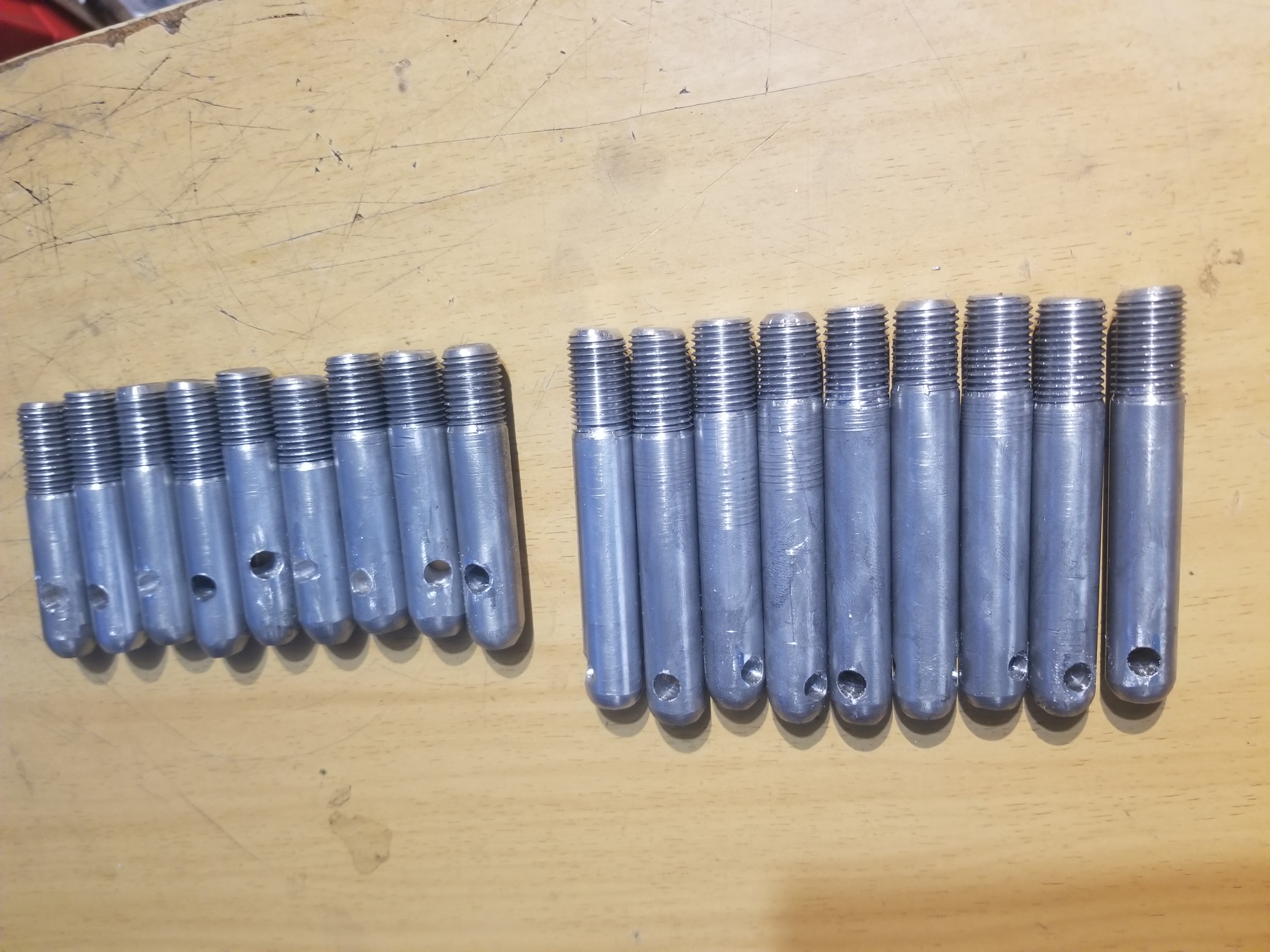 Each sets consists of two long and two short studs and a spring loaded pin. The pin functions to install/remove them and to hold the wheel on while removing the lug bolts. The long stud will clear a center cap on a Fuchs wheel. The short stud has the cross hole located so that it will hold the wheel against hub hub. They are made from T6 aluminum with a rounded head for easy wheel installation. I have four sets of four made and have the material to make more. $50 for set of four, $25 for a set of two shipped domestically. International shipping at cost. Typically about $15 to Europe. Attached thumbnail(s) |