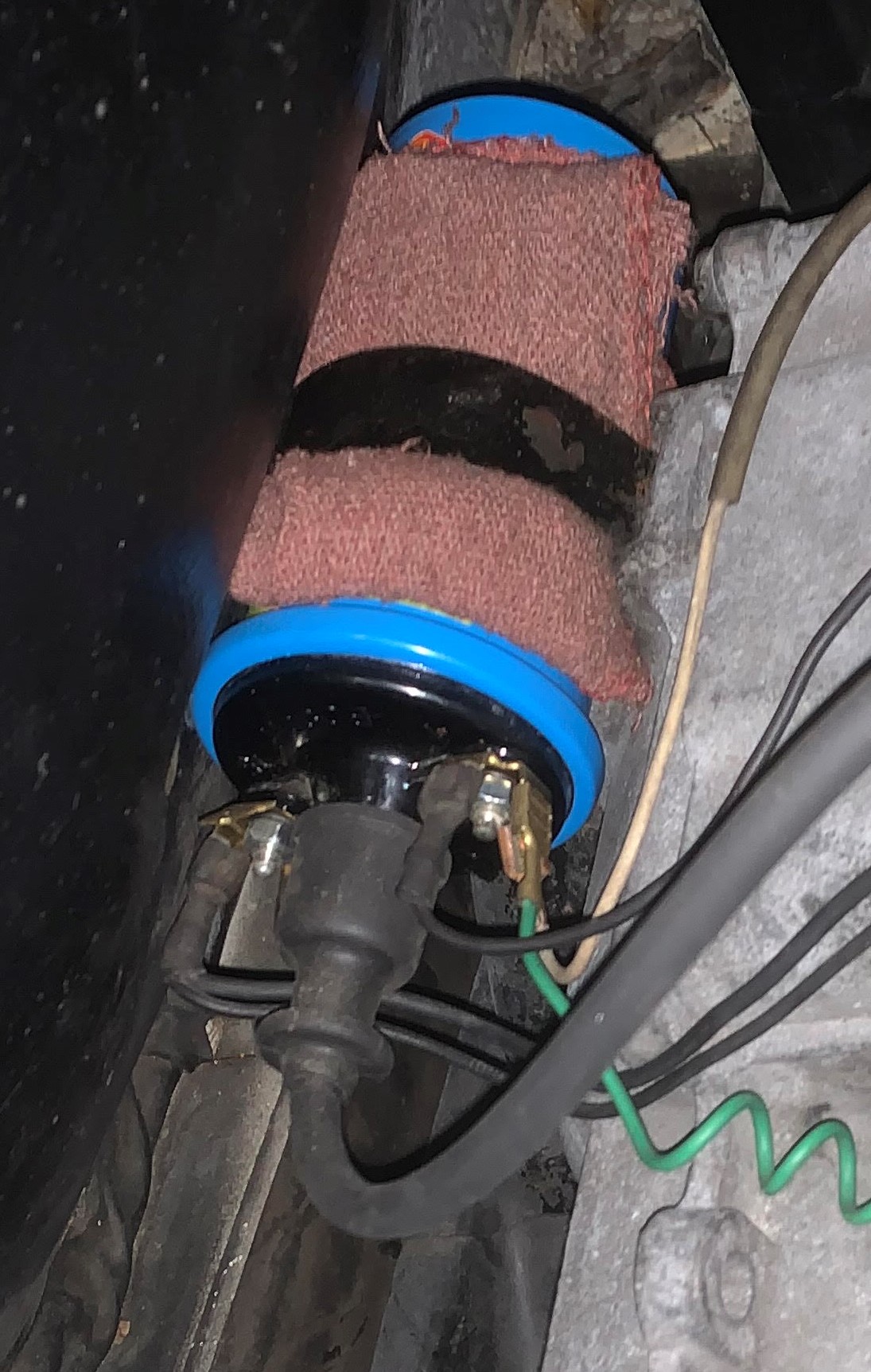 I have a '74 1.8 car and I recently replaced my old black coil with a new Bosch blue coil. The new coil is a bit smaller in diameter than the black one and does not fit properly in the original coil bracket. The front side of the coil bracket is mounted with a bolt and the back side just hooks under a slot in the fan housing. I prefer not to relocate the coil bracket and have to run different lengths of wires to reach the coil in a new position. I am leaning toward an original look by having my factory coil bracket made smaller to fit the new coil, or place something between the coil and the bracket to create a tight fit that would withstand the heat from the coil but still appear original looking so as to not stand out. The car runs but is parked for now, so I just put a shop rag around the new coil temporarily until I figure out a solution that works. What have other folks done? Any suggestions? Thanks! Attached thumbnail(s) |