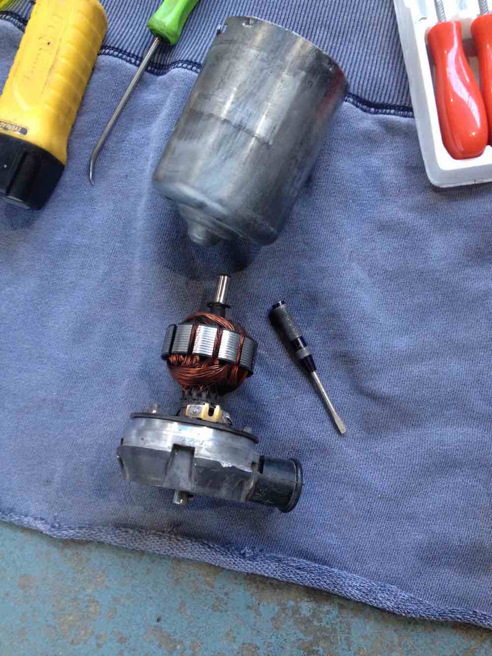 snip the earth wire to the plug. as close as you can to where it is connected to the stamped clamp. you can resolder this later to reconnect it. carefully ease out the electrical socket. lots of wiggling and gentle coaxing. it will be gummed on and take a bit to get it to release but you don't want to tear it out with force or you risk breaking off the two electrical connections at their base. if that happens things can get harder to repair. look for the o-ring. in my case there was not much left of it. this was the source of the main leak. collect all the o-rings up. the 0-ring for the motor casing is likely a 51x2.5mm and the electrical connection is a 7.8x1.9mm i think, but it was squashed very flat, so i may experiment with this by getting a couple of different sizes to get the correct final fit. This is where i have gotten to until i obtain all the o-rings. more when i begin reassembly next week or two. |