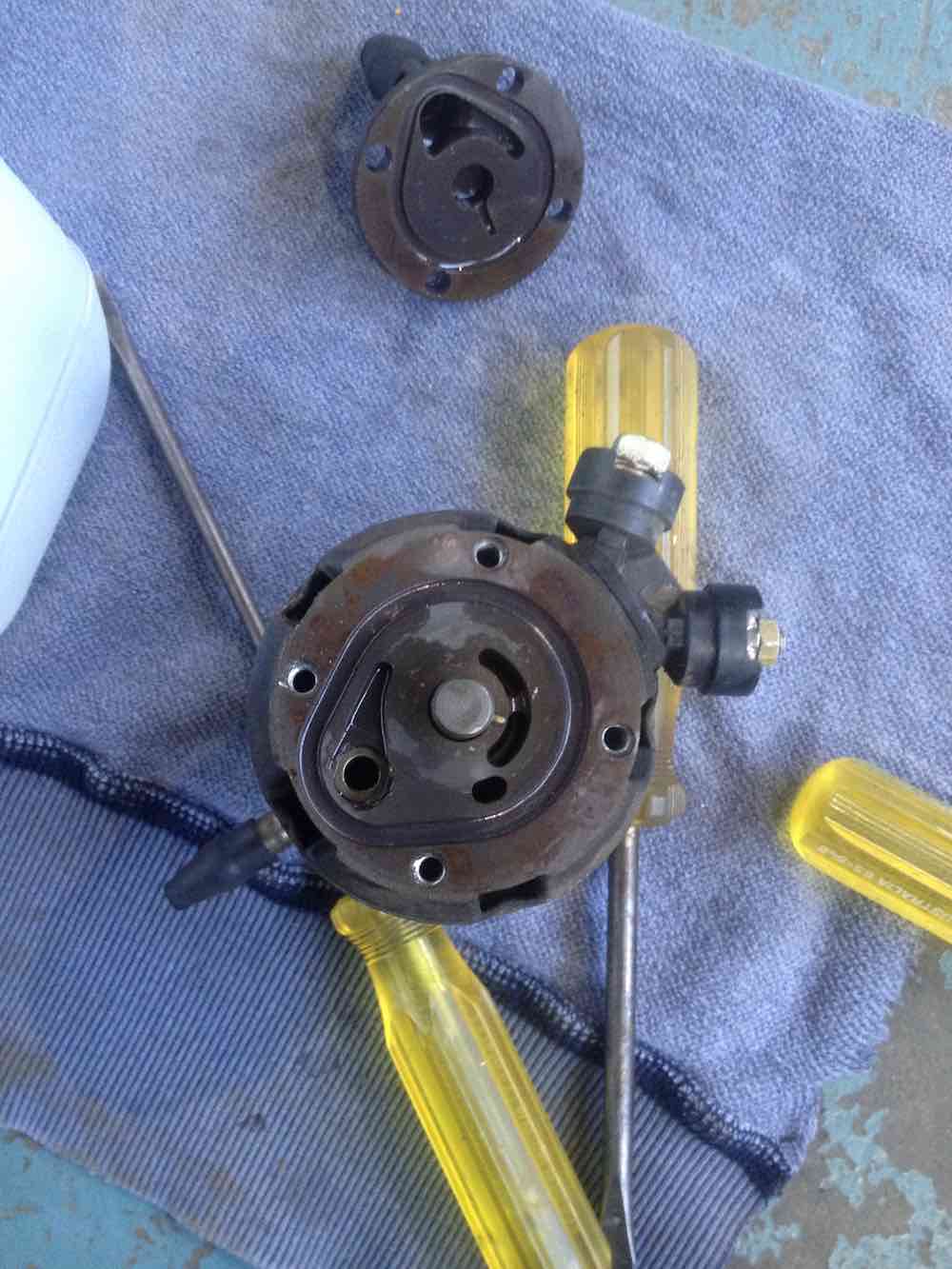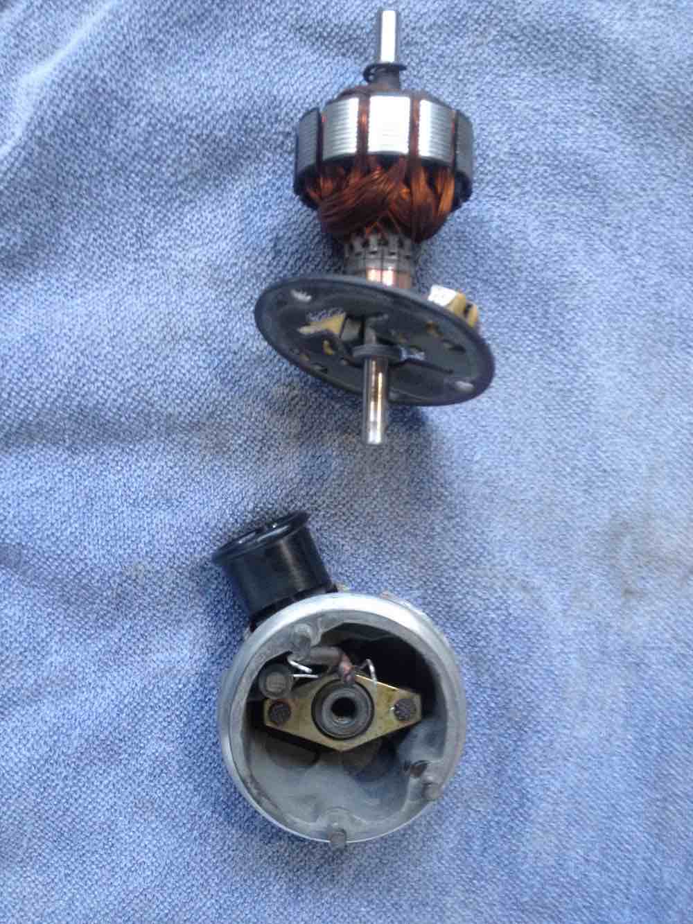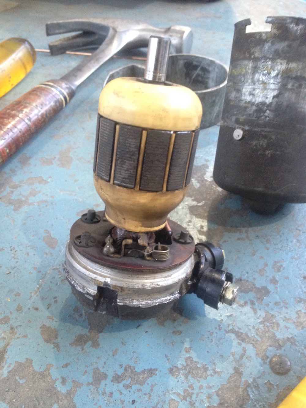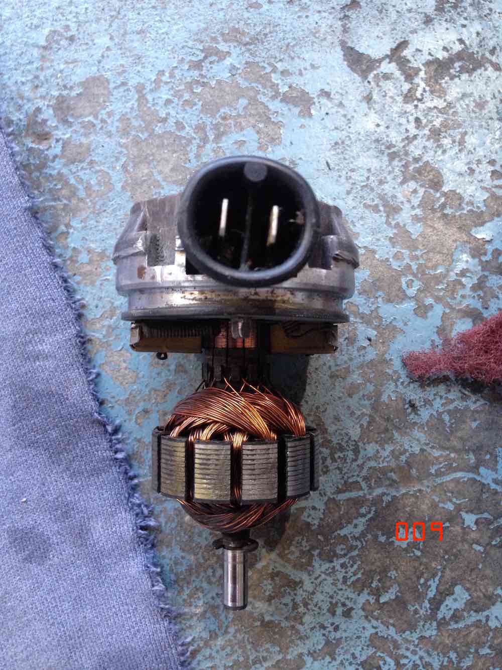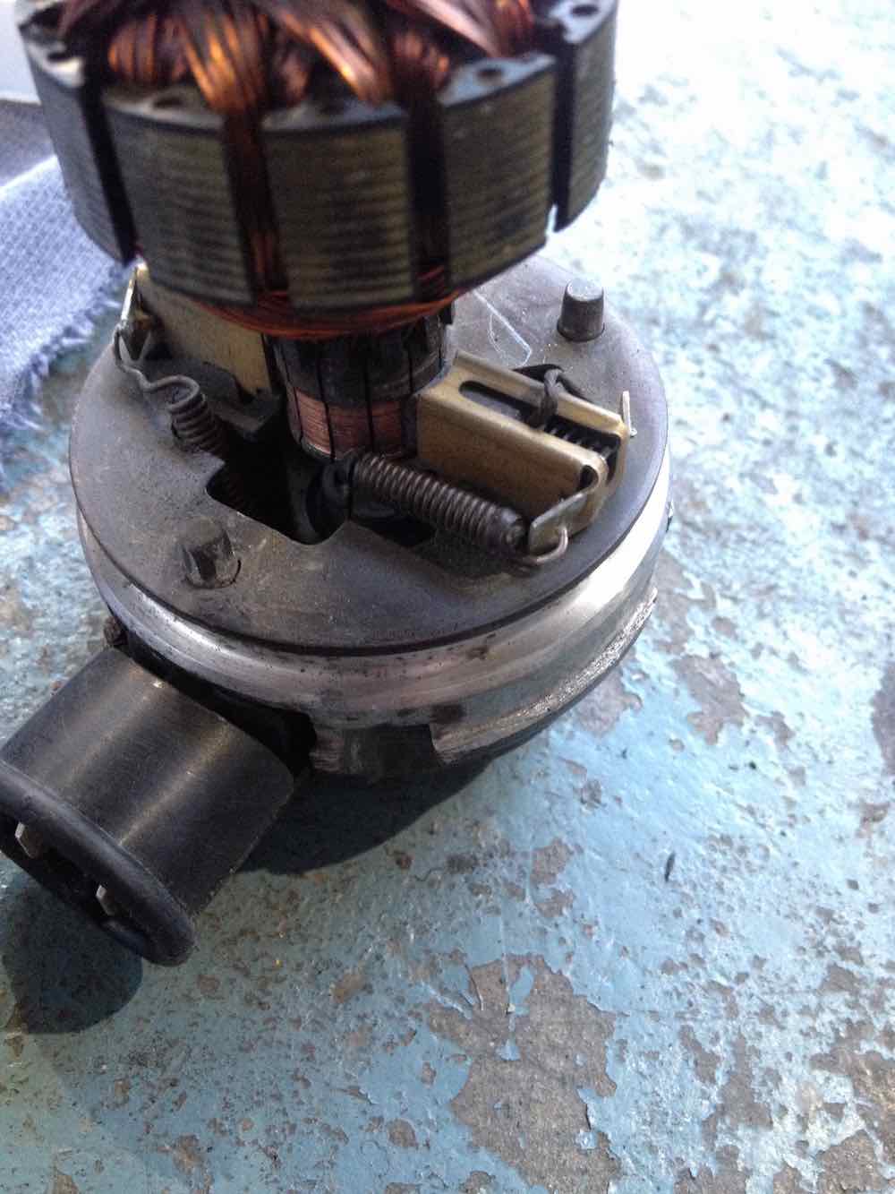 step 2 gets you to one of the internal leak failures. the big o-ring sealing the motor housing. i inspected this o-ring. it was hard on one side and had definitely been leaking. but there is one more seal to go. the electrical plug. Additionally at this point you can inspect the commutator and brushes on the electric motor. Mine were in good condition with reasonable level of wear. made sense. the car is a two owner car with 44 K miles and its been dormant for the last 16 years. the pump is worth saving assuming i can solve the leaks with new seals. Moving on. Electrical plug removal. at this point you have to get the lower part of the port/pump housing apart and detach the motor. first. there are two electrical connections rising from the plug to the brush holders. these wires are like springs at the brush ends. take a soldering iron and release the solder joints so they are free. next there are three spring washers which hold the pump/port housing together. work these off with a fine pick and a small fine screwdriver. finally drive out a very small pin which secures the motor axle to the top of the pump housing. you will need an ultra small pin punch, less than 2mm. or 1/16 in imperial size. be careful driving the pin out. i secured the axle in a vice with soft jaws and placed a rag below the vice to catch the pin. you do not want to lose this pin, its very very small. pull the motor out of the pump/port housing. carefully lift the internal face of the pump/port housing up threading the spring wires through it as you go. once apart stop there. you will be looking at the back of the electrical plug and if its a 009 pump it should look like the last image. there will be an earth wire, going to a stamped pin and the same stamped pin holds the sprung wire that connects to the brush holder on the motor section you have detached. to note. a 005 may not look like this. at some point i will know as i have a 005 to disassemble, but i have not done that yet. |