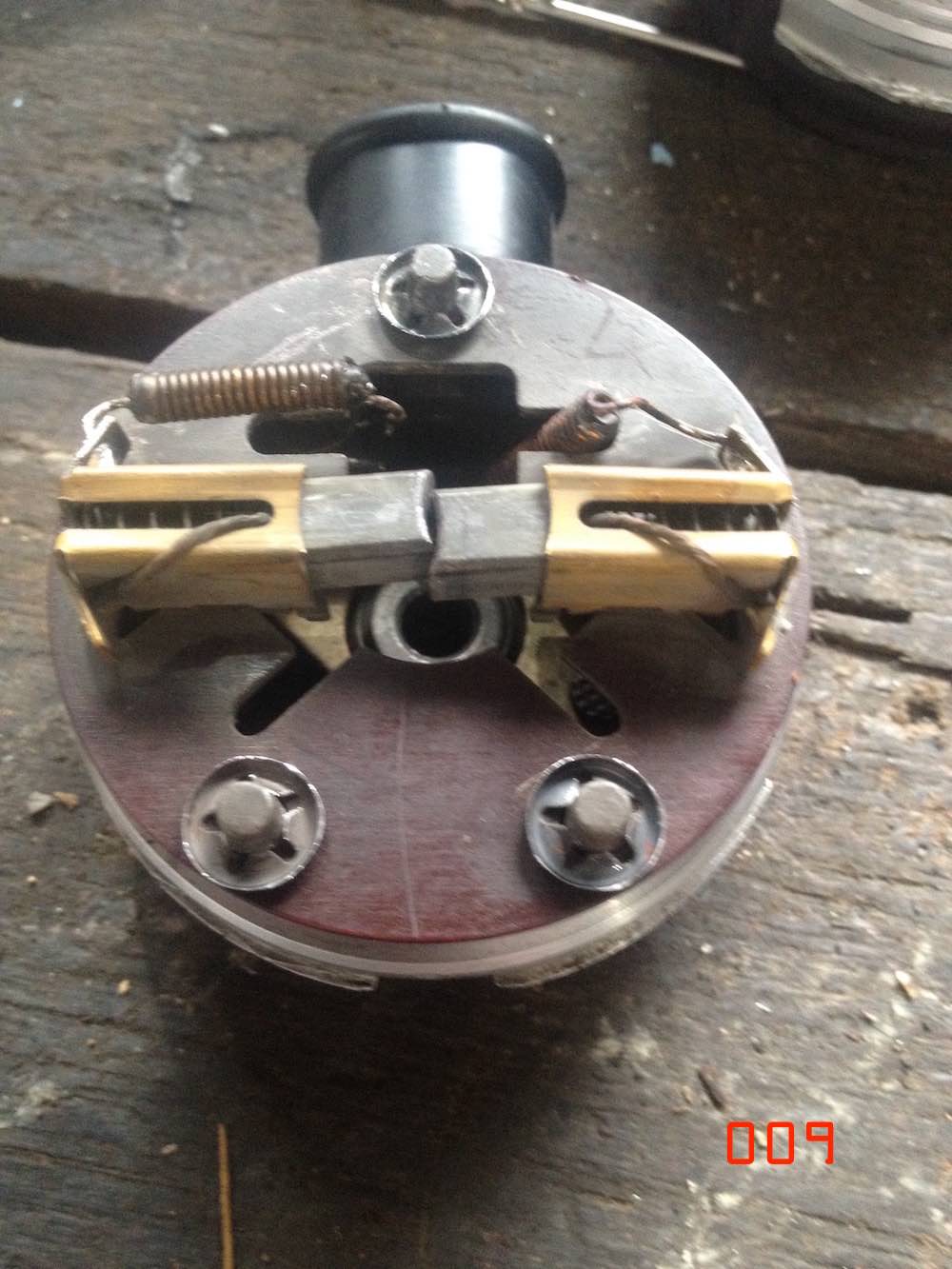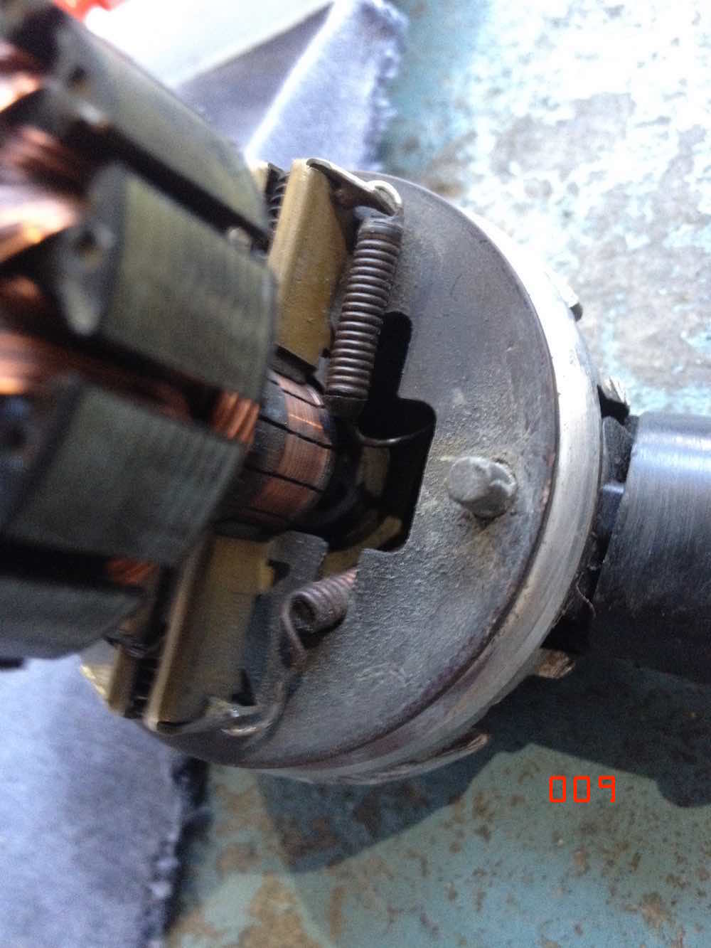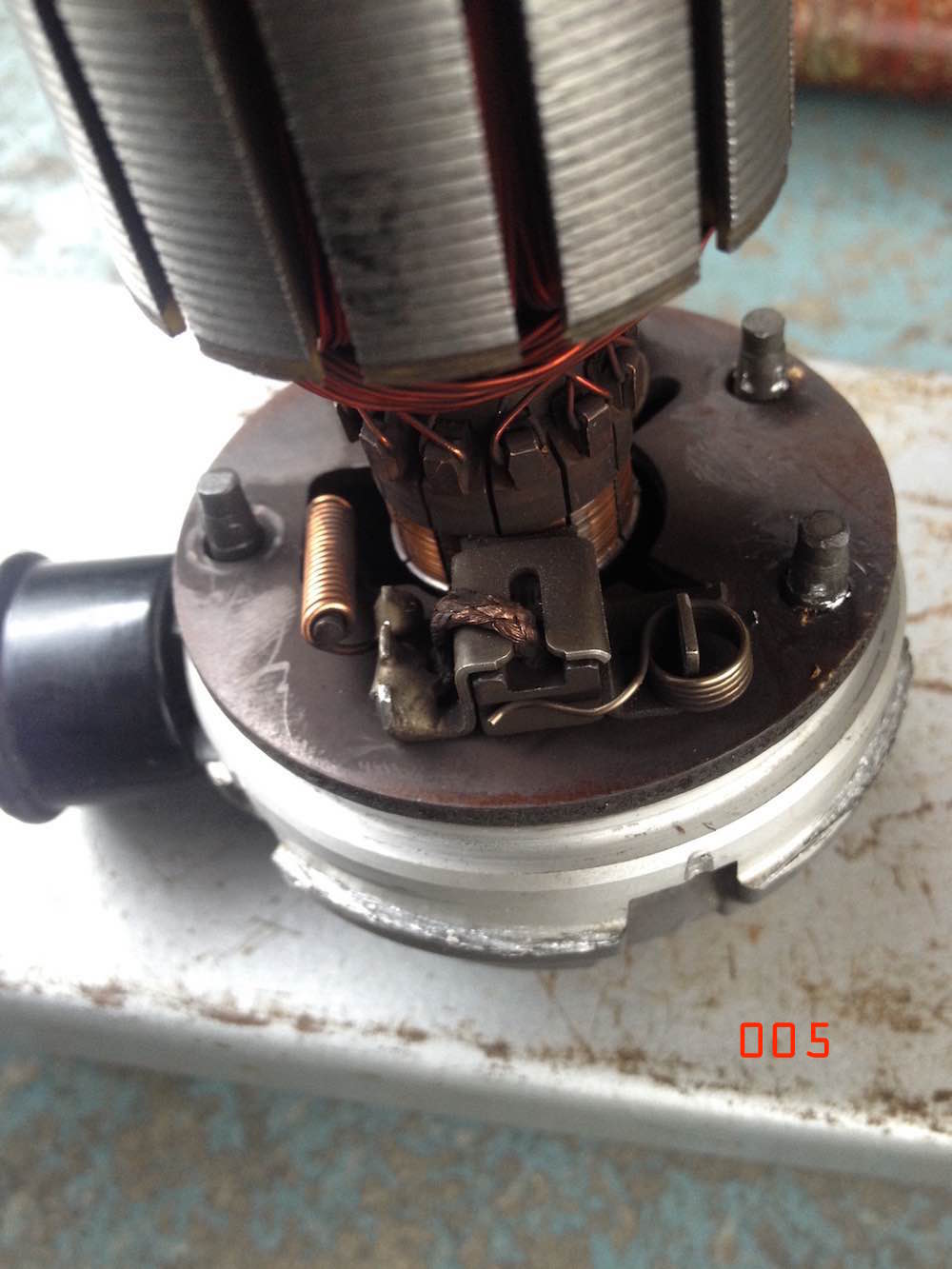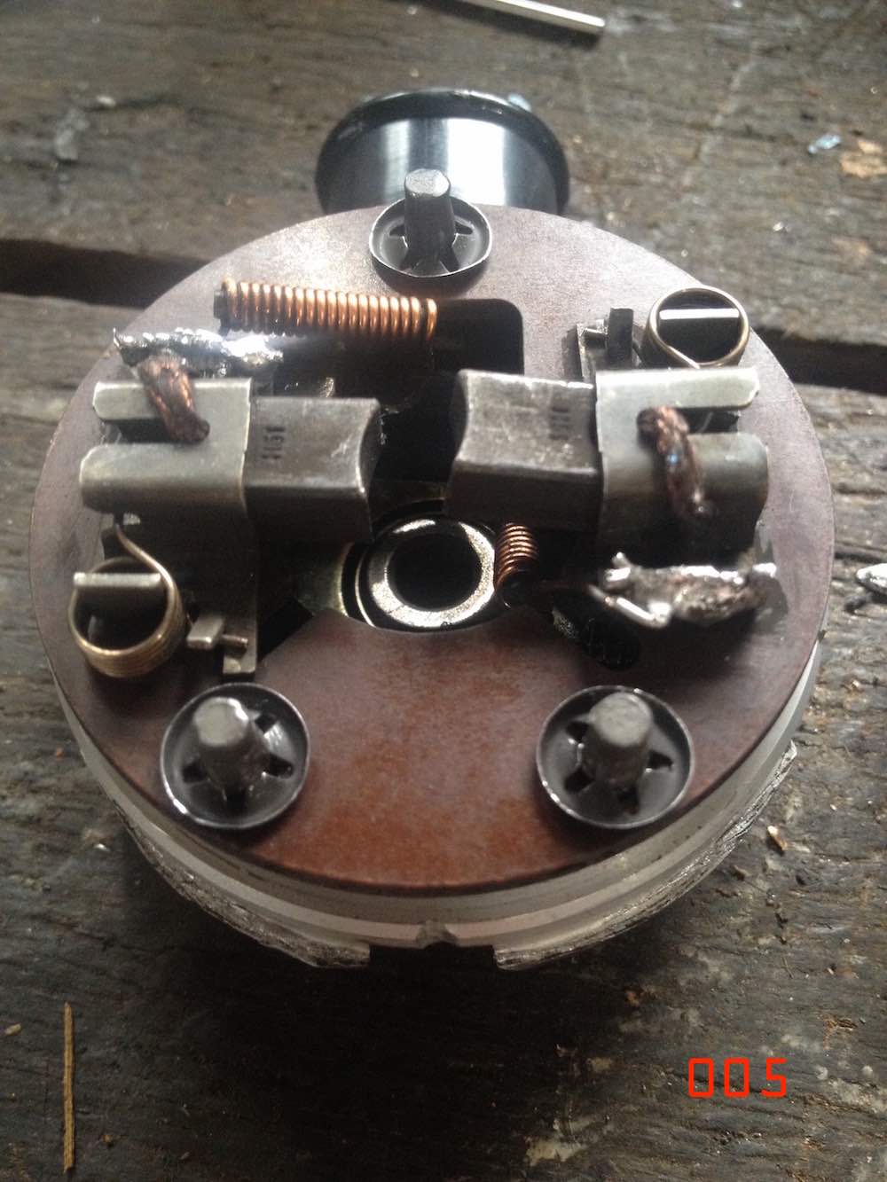 fitting the port housing inner plate & brush holder. i retained the starlock (or quicklock) washers when i disassembled. took them off carefully so good to reuse. if you damage the starlocks get some new ones. i flattened the starlock tongues using a very small socket to get them to preload again. i used a slightly larger socket to push them down on the securing pins. next i resoldered the spring wire connectors to the brush housings. carefully move the wires into position and push the hook ends through the slots/holes in the connection plate. i used my original disassembly photos for reference. fairly easy to see where the wires must go using logic. very difficult to make errors such as crossing the wires up accidently. both stay on the sides of the electrical plug they come out of underneath the brush plate. i did have to melt existing solder out of the holes before i could clip the wires in. once clipped solder these connections. soldering went much better than the earlier frustrations i had with the earth wire in plug base. i repeated the same with the 005 pump i am reassembling. had to do a bit more work on that one. different style of brushes and electrical connections on the earlier 005 pump. one of the brush connections needed some more securing solder repair. after soldering clean up any loose solder drips, blow out with air and electrical cleaner, you don't want anything trapped inside this assembly that could later break loose. |