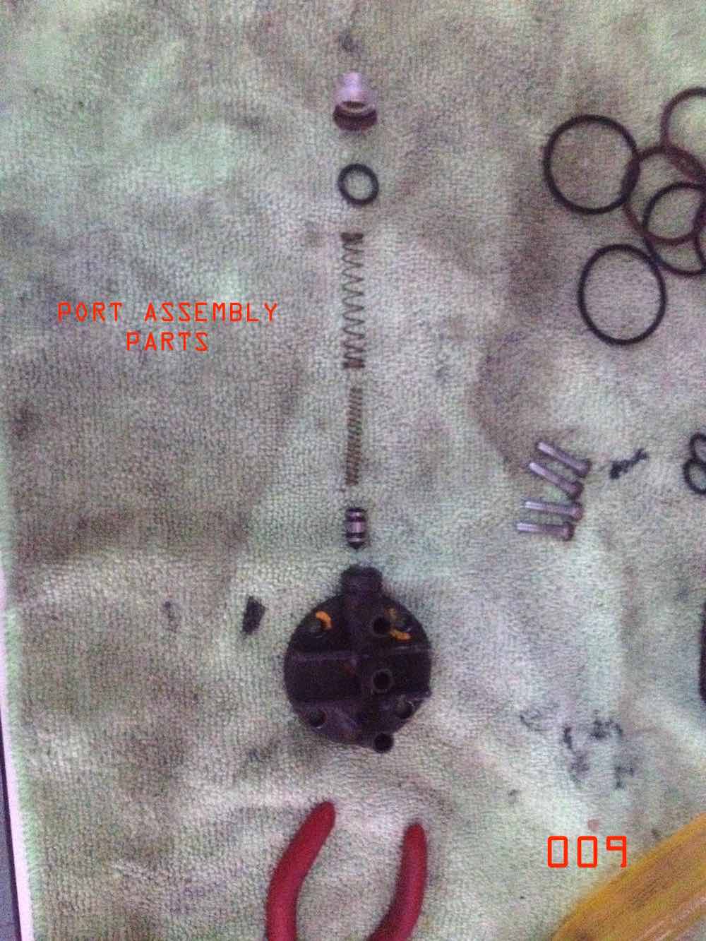 the next day. the pump 3 port casing was taken apart. here is what is inside. when you take it apart record the orientation and fit of all the components. take care when you remove the metal end cap as it may all fly apart. use fine picks to prise the crimps out of the metal cap. springs will shoot out and fly off to destinations unknown. the 009 was so gummed up the springs did not shoot out. the 005 came apart like a moon rocket going into orbit. i am still trying to think how this thing actually works. but given i got it to work again, do i really care? pressure relief in the pump is somehow accomplished by the small valve restrained in position by a spring. this valve must be able to move freely when you lever it with a screw driver. it should instantly spring back into position. i thought i had checked it for operation prior to having to pull it all apart. and it did work, but not like it works now properly cleaned. returns to position with a very positive click. the other item that required replacement was yet another o-ring. required a mid morning drive through congested post lockdown traffic to the o-ring suppliers. took the parts down with me to get the right fit the first time and get some alternatives just in case. did not remember to note down the size of the o-ring. will measure it later and post the size required. o-ring fits in the metal cap at the end of the port casing. the metal cap on the port casing has to be decrimped for disassembly. take care as its very thin tin. reassemble the whole thing after cleaning and fitting of new o-ring. when i refitted the pressure valve assembly cap i rotated it slightly from its original position. i could crimp it back on using undistorted metal. its very thin - like paper. crimping was done with a few taps from a small screwdriver. take care doing this as the metal is so thin it can easily tear. reassembly can be done in a vice. you have to hold it all together with one hand against the pressure of the springs. get it into the vice then carefully compress it in position. (use a socket over the cap so the broader rim is in compression, not the cap, i made this mistake on the first pump i reassembled). once restrained you can work your way around the cap and crimp it back on. if you position it in the vice to do the bottom two crimps this will be enough to hold it together to spin it in the vice and do the top crimp. all back together. ![]() |