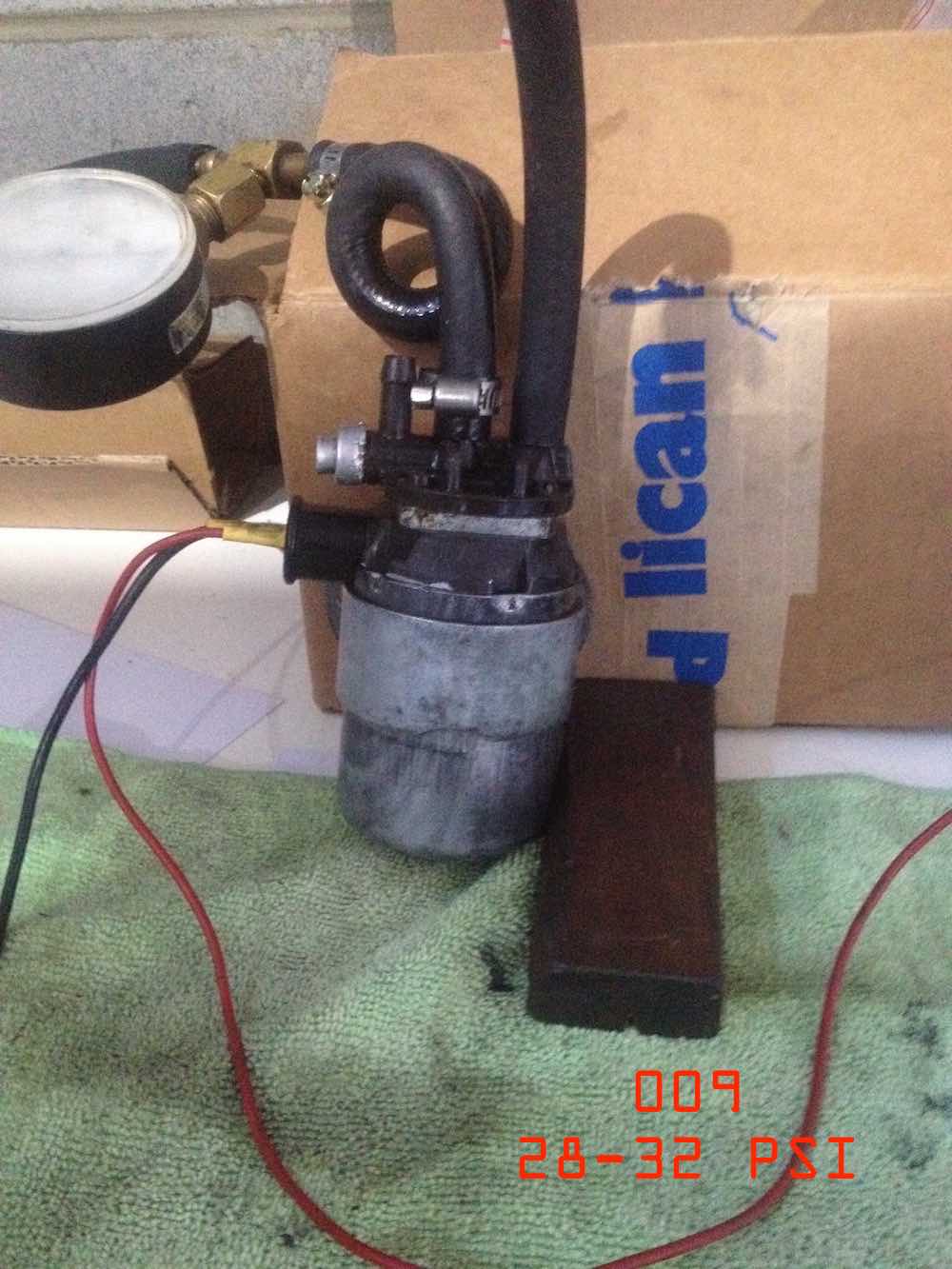 at the end of the day we hooked up test apparatus again. juiced up the pump. the pump transferred the contents of one kerosine bottle to another in about 30 seconds or so. i didn't have a watch on it. was just pleased it worked. initially there was a bit of discharge out of the pressure relief port but then this flow stopped. i figured that was the pressure relief valve still sticking slightly. there are two springs in there. a smaller spring inside the bigger spring. its possible the springs were catching on each other after re-assembly. if they were they sorted themselves out with a bit of test fuel pressure. once lubricated enough by kerosine everything started working fine. pump casing stayed cool so motor was not overheating. a little later we hooked up the gauge to the pump and were reading 28-32 psi pressure. figure was on spec. didn't have time to do a flow rate properly. next time. will finish reassembling the 005 pump and test them both together. no leakage was detected from any of the new o-ring seals. |