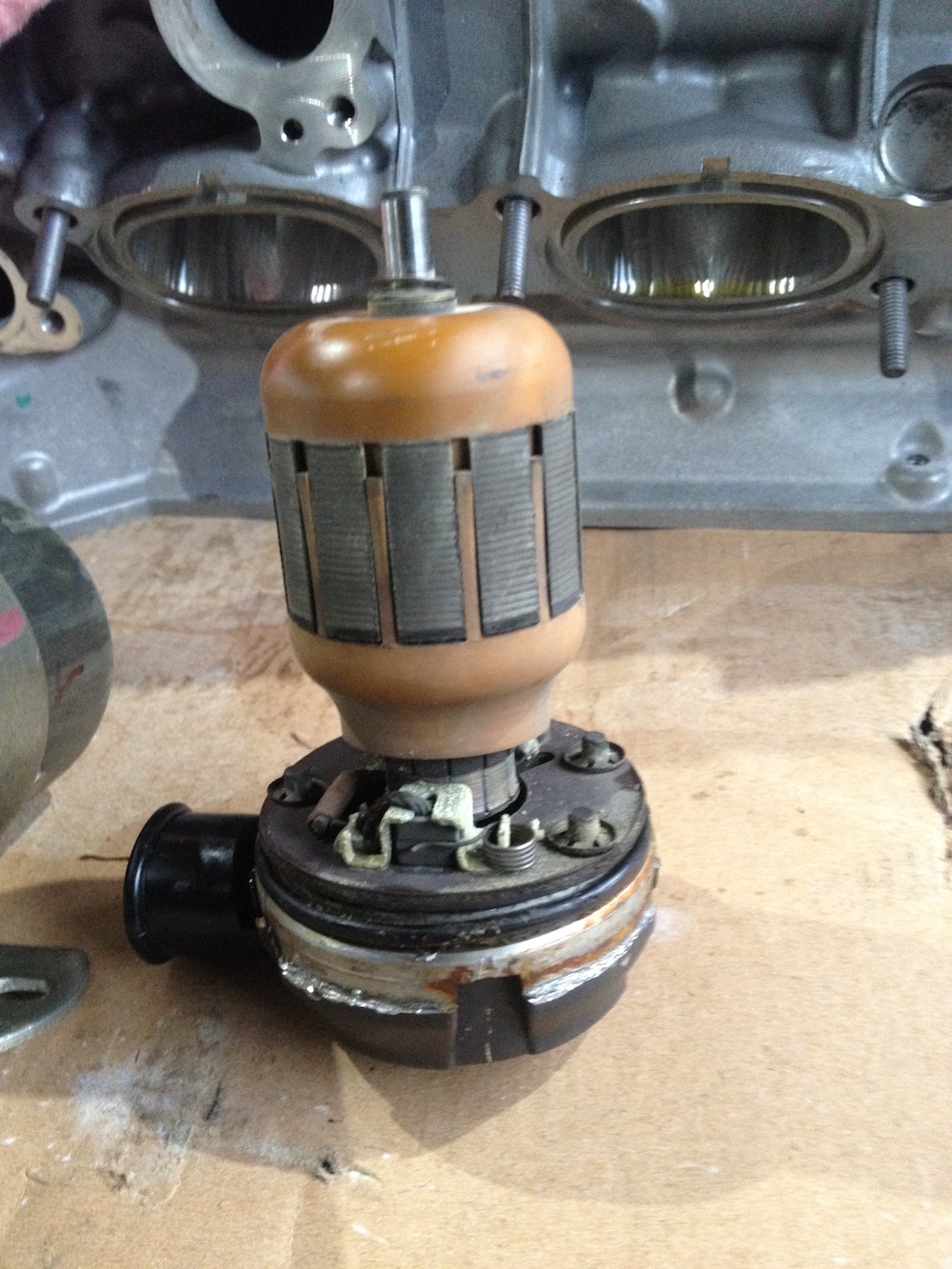 under load. 009 (ex 914). achieving 34-35 PSI. flows 500ml - 27/28seconds. 005 (ex SAAB) achieving 38 psi. flows 500ml - 25 seconds. 005 has a slightly bigger intake port i have noticed than the two output ports, 009 has three ports same diam. might explain higher pressures/not sure? whatever was wrong with SAAB pump is fixed now, its almost an overachiever. specs from factory manual. operating pressure 32-38 psi. min flow 500ml in 30 seconds. been successful to this point. no leaks from joints/o-rings under test. its not impossible to re build one of these pumps. certainly no problem to tear one down and see if the brushes/commutator are still ok. if so, o-ring replacement will fix any leaks and its good to go again. medium worn commutator usually reconditionable with a simple machining down on a lathe. not hard to do if you have to. in the case of these two pumps commutator had only light wear. re-assembly of SAAB unit took less than a morning. once you have done one/ironed out glitches/technique takes no time to pull apart and put back together. will just research best way to long term store. flush out kerosine? etc. |