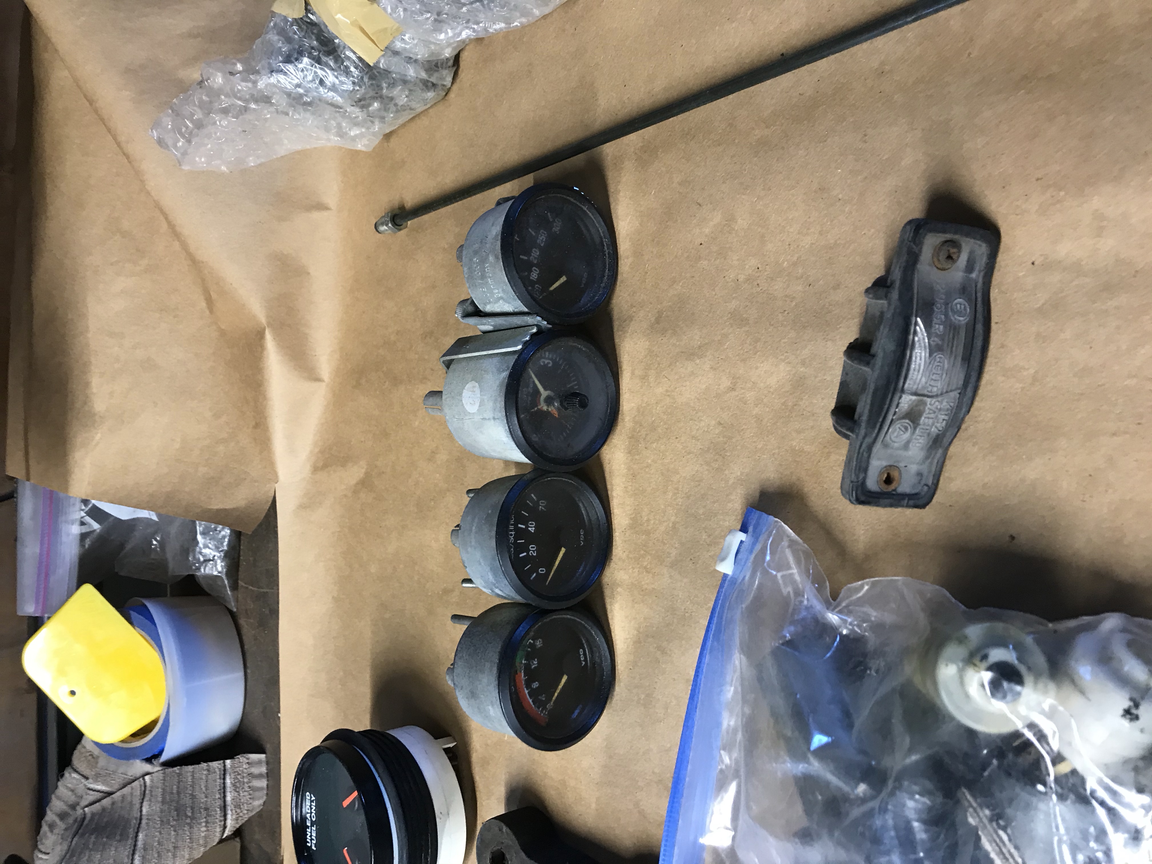 Fiberglass rear trunk lid with spoiler (very good quality) Custom louvered engine cover (complete, ready to bolt on) Perfect dash top, no cracks or tears. 2 console trays 3 headlight motors 1 rear view mirror 5 pieces of windshield trim 2 pieces of targa trim, one dented. 2 into 1 heater blower hose fitting 1 passenger door panel with arm rest/pull (black) 1 passenger door panel (brown) Fresh air box with misc tubes 1 lower dash panel w/vents 1 interior windshield trim (piece that visors mount to) 2 tail light housings in rough shape 2 parking light housings 1 shifter assembly 1 box misc hardware Complete gauge set (volt, oil pressure, oil temp, clock) for center console 1 new OEM brake line 1 license plate light Assortment of ignition switches and keys Complete turn signal/wiper assembly w/intermittent setting 2 bumper dog bones 1 set f Porsche lettering (some mounting tabs missing, but usable) 3 new shift bushing (not sure if tail shift or side shift) 1 set of exhaust studs, nuts, and seals 1 clutch pulley w/cable boot Message me for pics $1k for the lot |